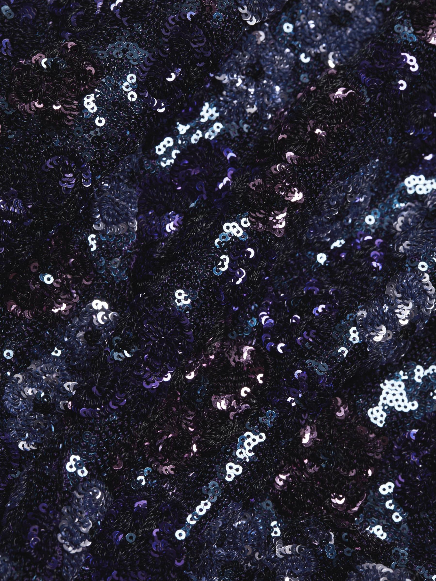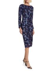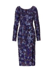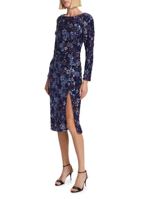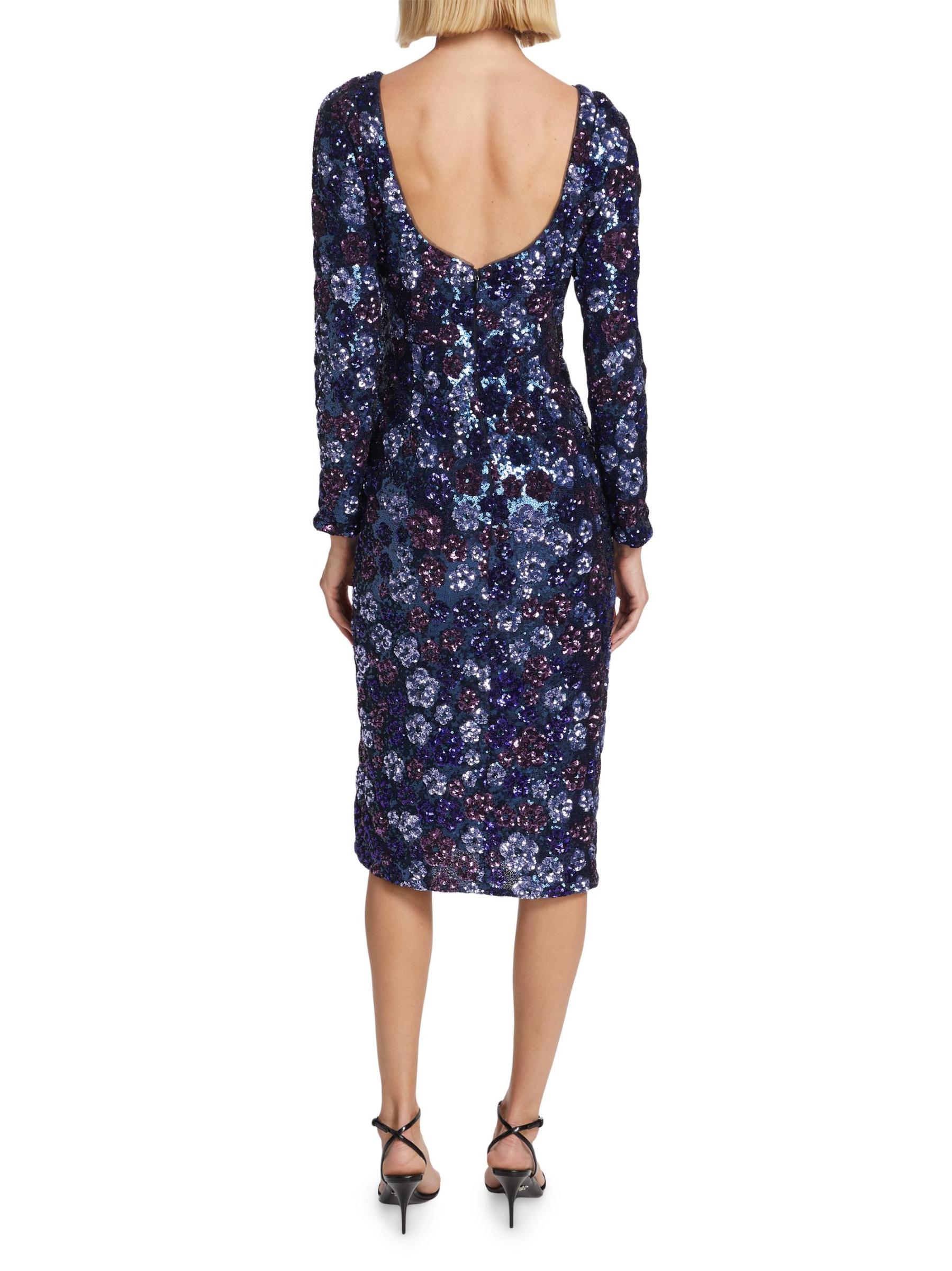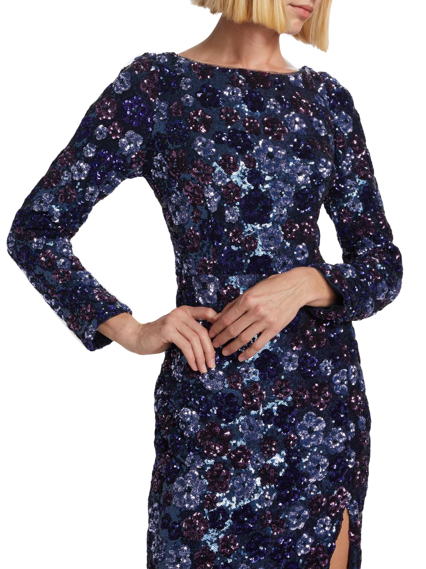 فستان كوكتيل Marchesa Notte ذو الأكمام الطويلة مصنوع من التول ومزين بالترتر اللامع. يتميز هذا الطراز متوسط الطول برقبة قارب وشق أمامي يصل إلى الفخذ وفتحة خلفية ملفتة للنظر.