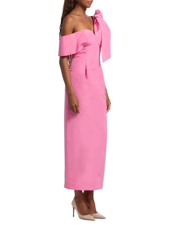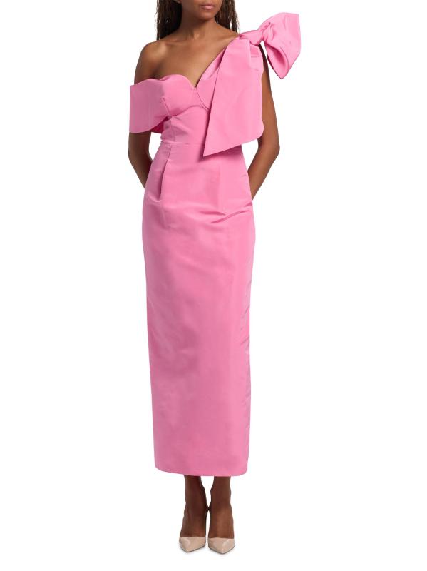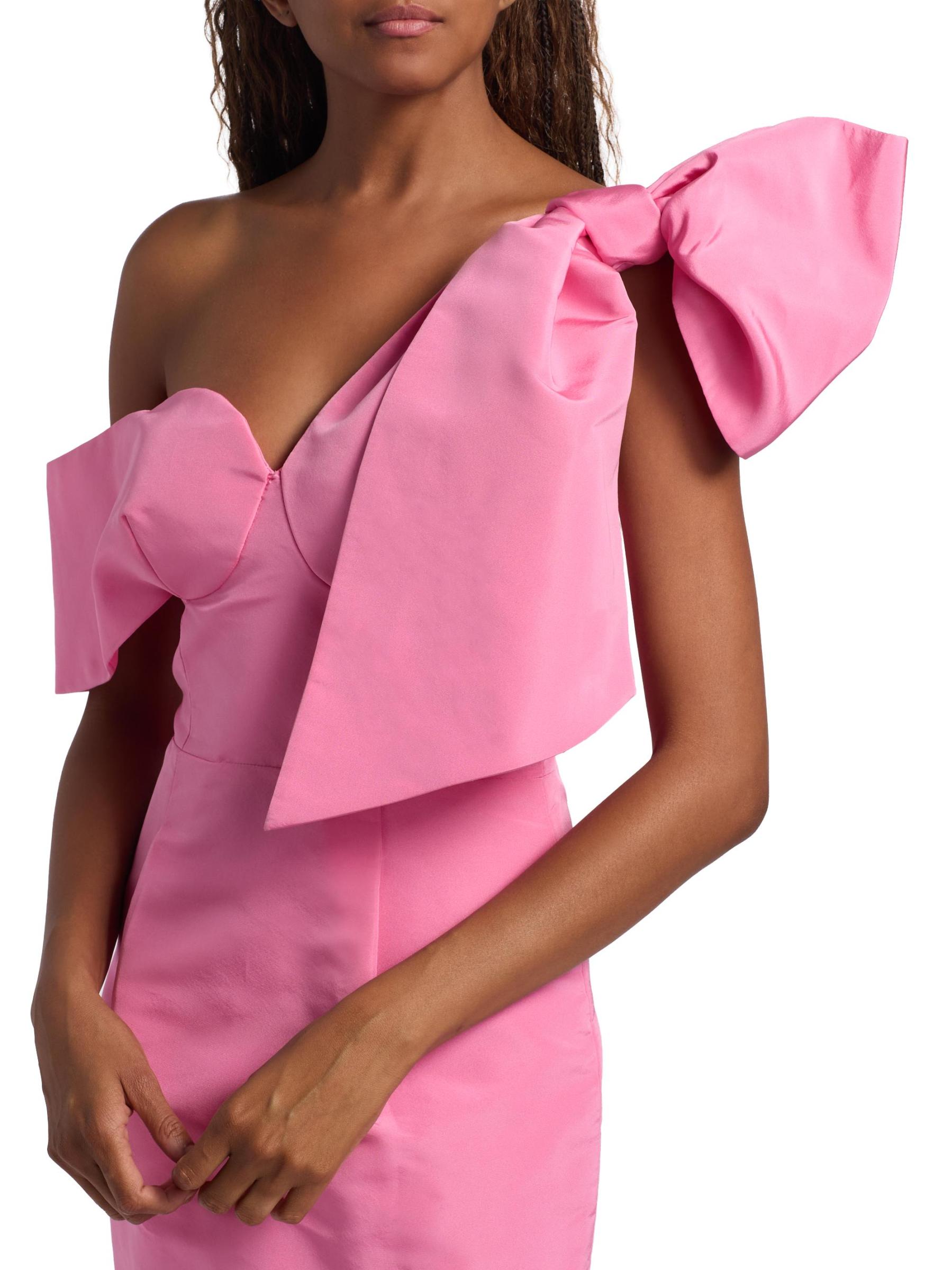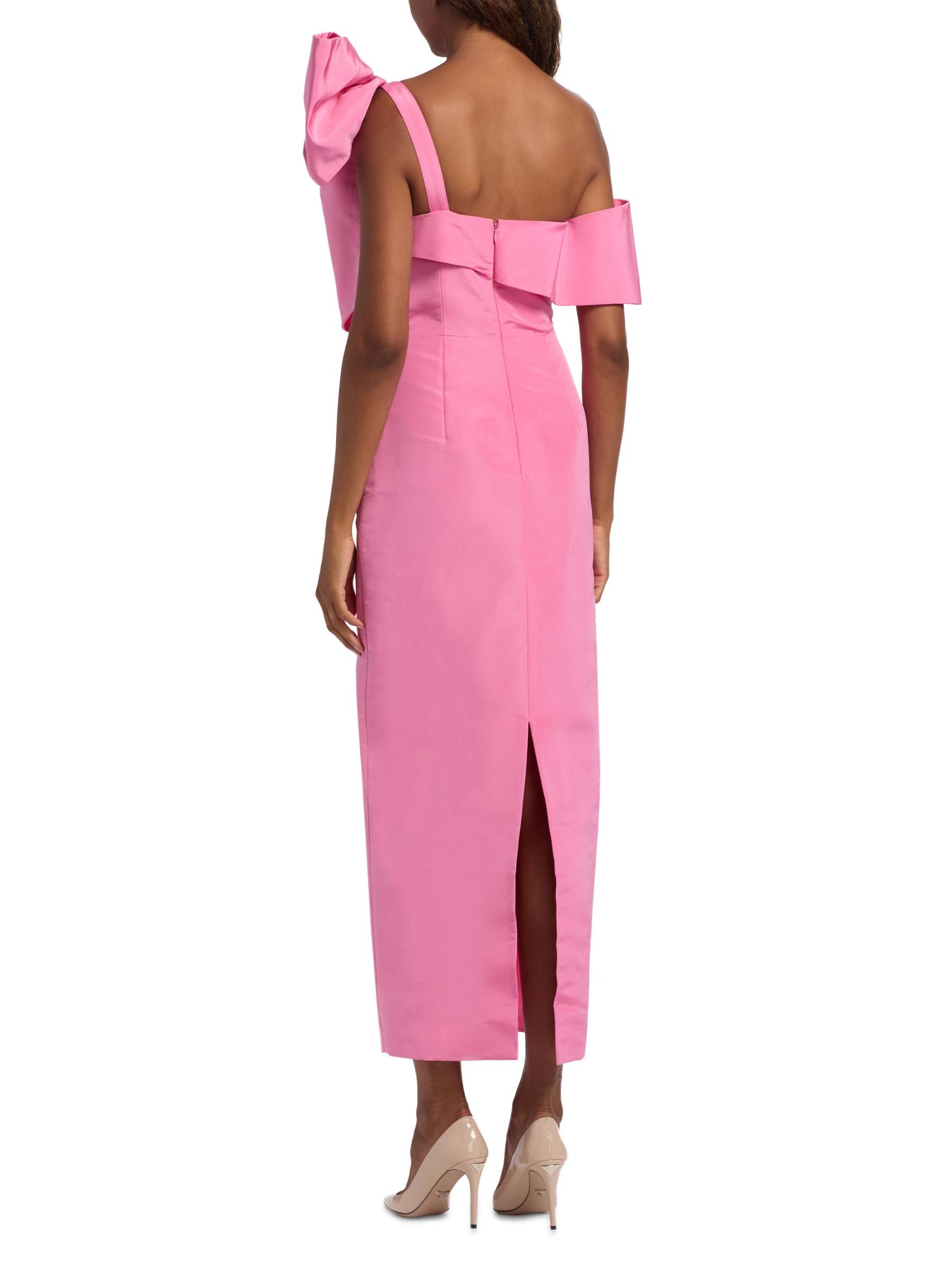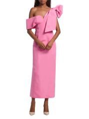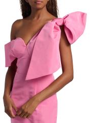 يتميز فستان Loop-Dy Loo لحفل الكوكتيل من روزي أسولين بفيونكة كبيرة عند الكتف وياقة رومنسية وحزام مكشوف الكتفين.