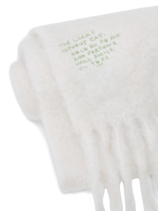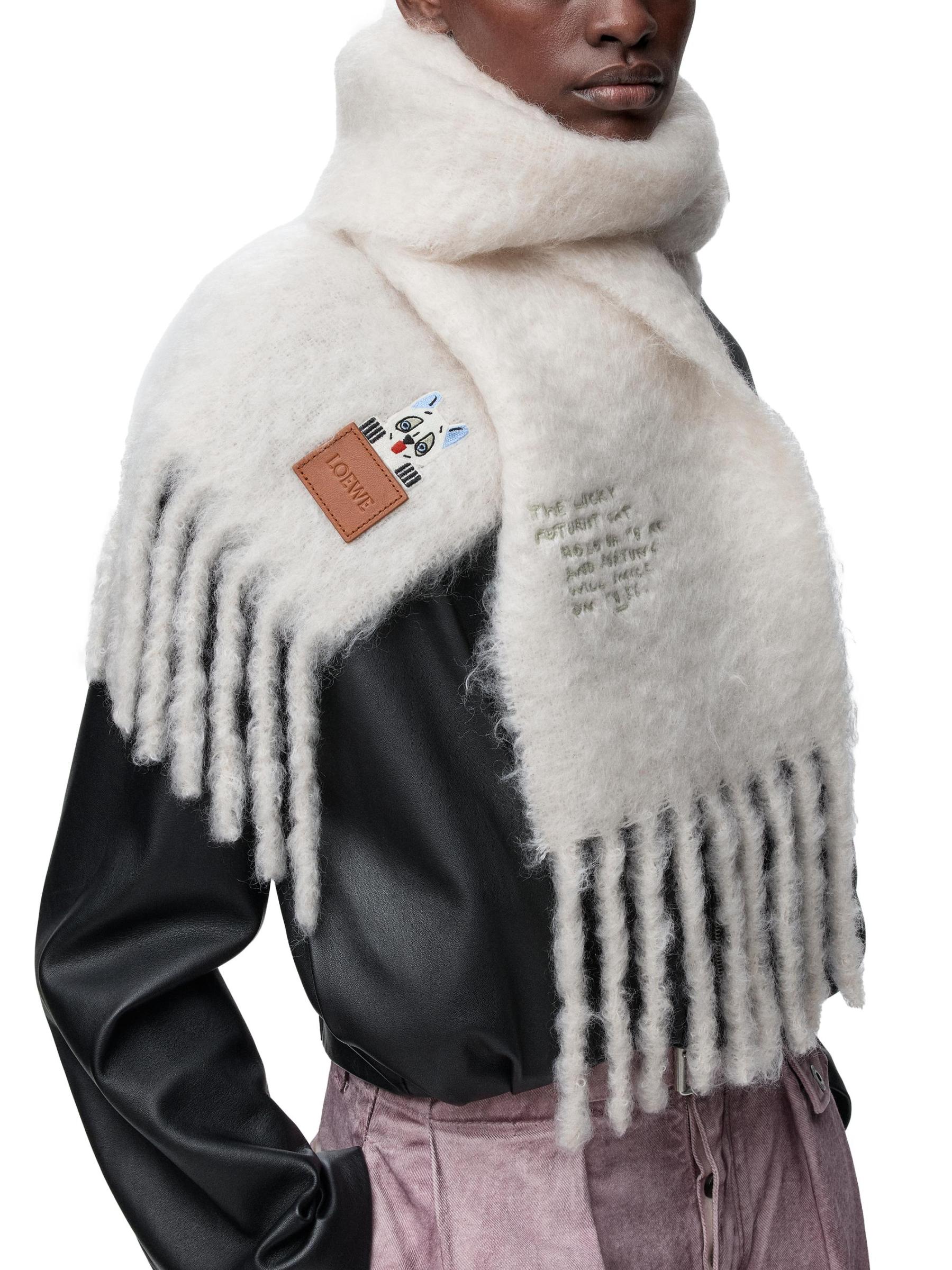 صُنع وشاح Lucky Fortune Cat من LOEWE في إسبانيا، ويتميز بقطة مطرزة موضوعة خلف رقعة جلدية محفورة بشعار الماركة وأطراف مهدبة ونصوص مطرزة.نهايات هامشية 61.75% موهير/29.45% صوف/5% جلد/3.80% بولي أميد صُنع في إسبانيا