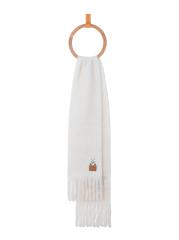 صُنع وشاح Lucky Fortune Cat من LOEWE في إسبانيا، ويتميز بقطة مطرزة موضوعة خلف رقعة جلدية محفورة بشعار الماركة وأطراف مهدبة ونصوص مطرزة.