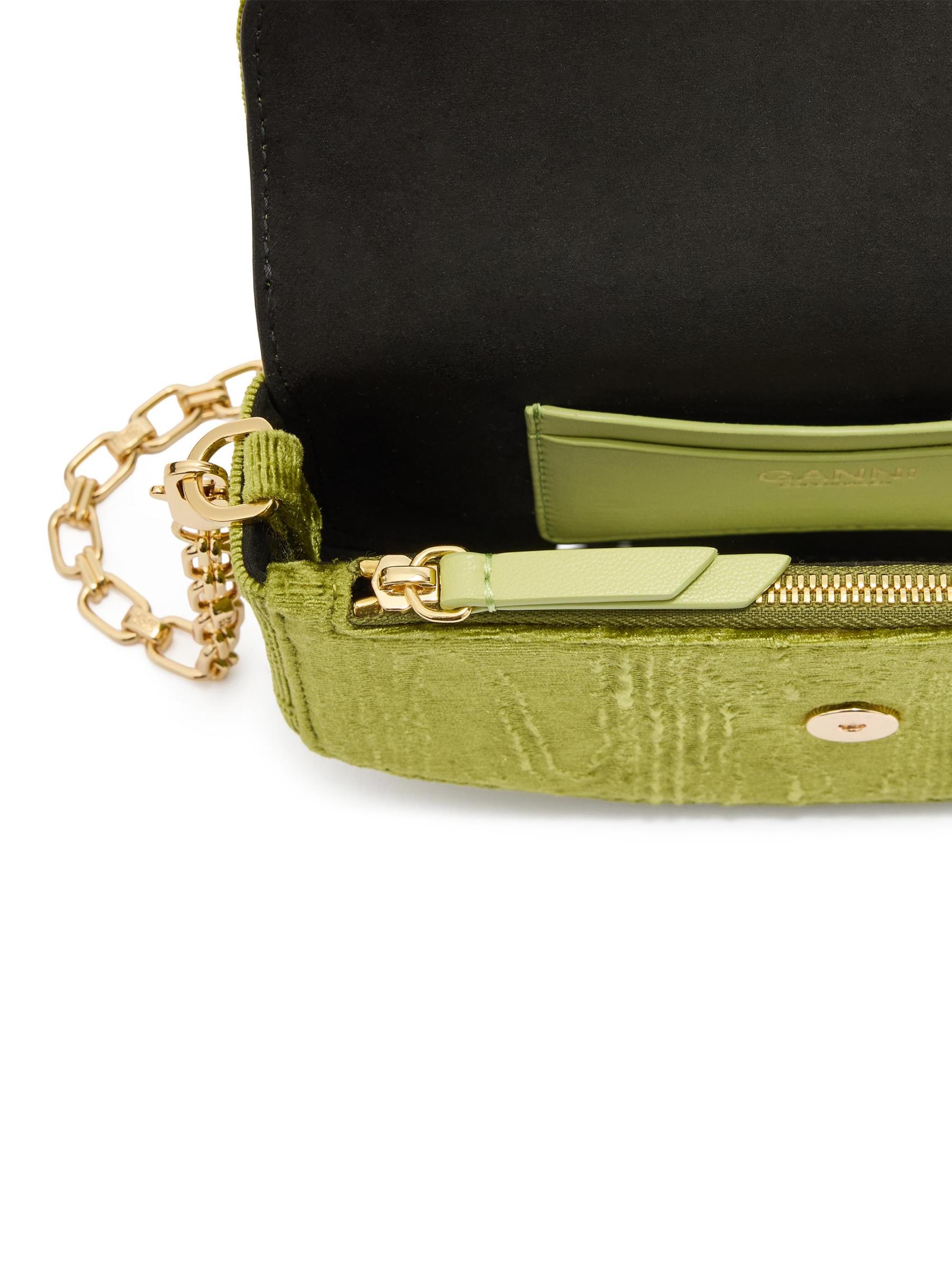 تتميّز محفظة Lulu على السلسلة، المُزيّنة بشعار Ganni Butterfly الأيقوني، بشكل سرج مستدير مع زخرفة مخيطة من الأعلى. يتميز هذا الملحق بحزام سلسلة قابل للإزالة وفتحة داخلية للبطاقات وإغلاق سهل الإغلاق.