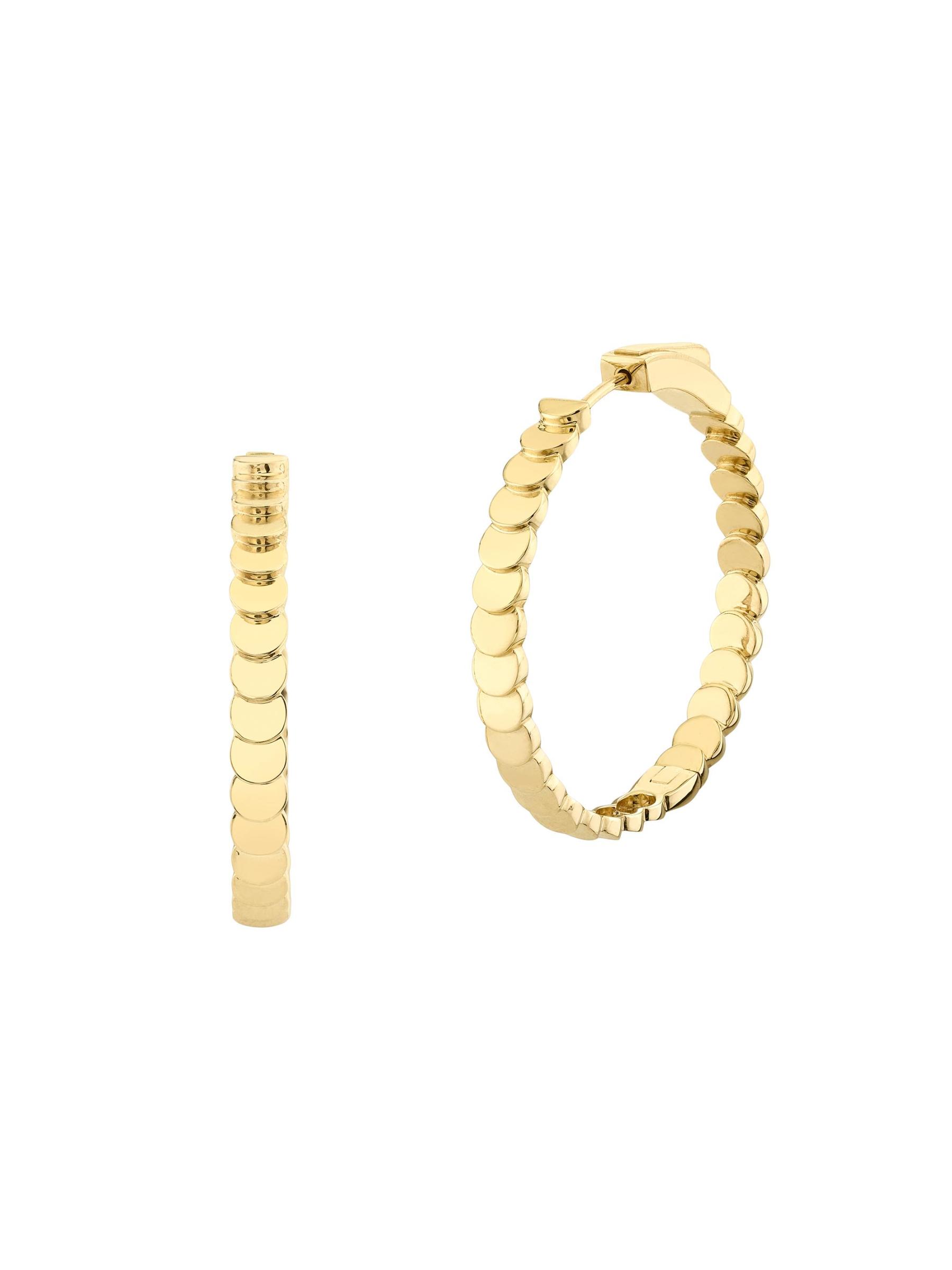 من مجموعة لونا. أقراط أنيتا كو الكبيرة مصنوعة من الذهب الأصفر عيار 18 قيراطًا. تضيف الأقراص المكدسة ديناميكية نسيجية إلى هذا النمط الكلاسيكي الذي يتم تأمينه عن طريق الضغط على الظهر.