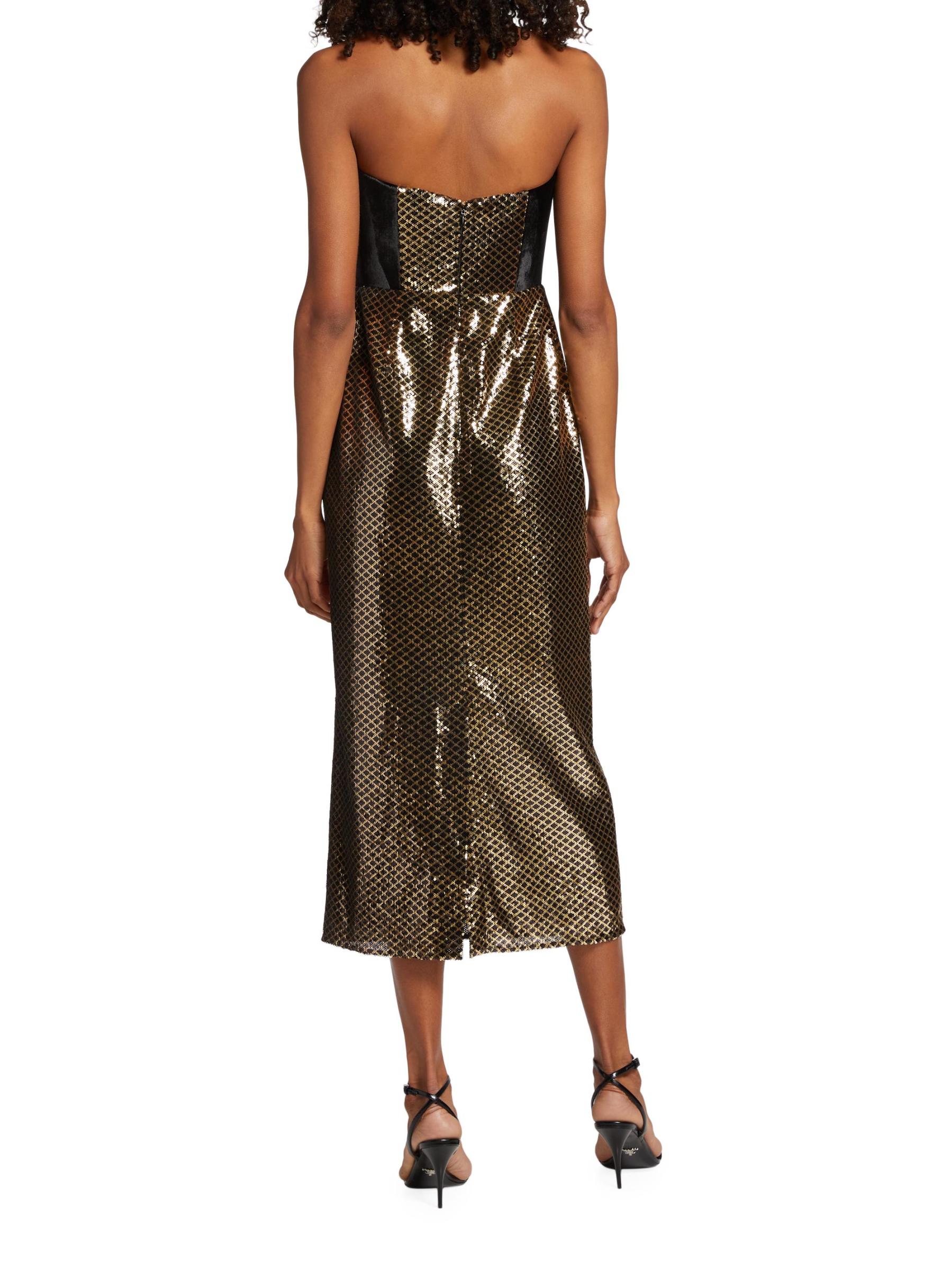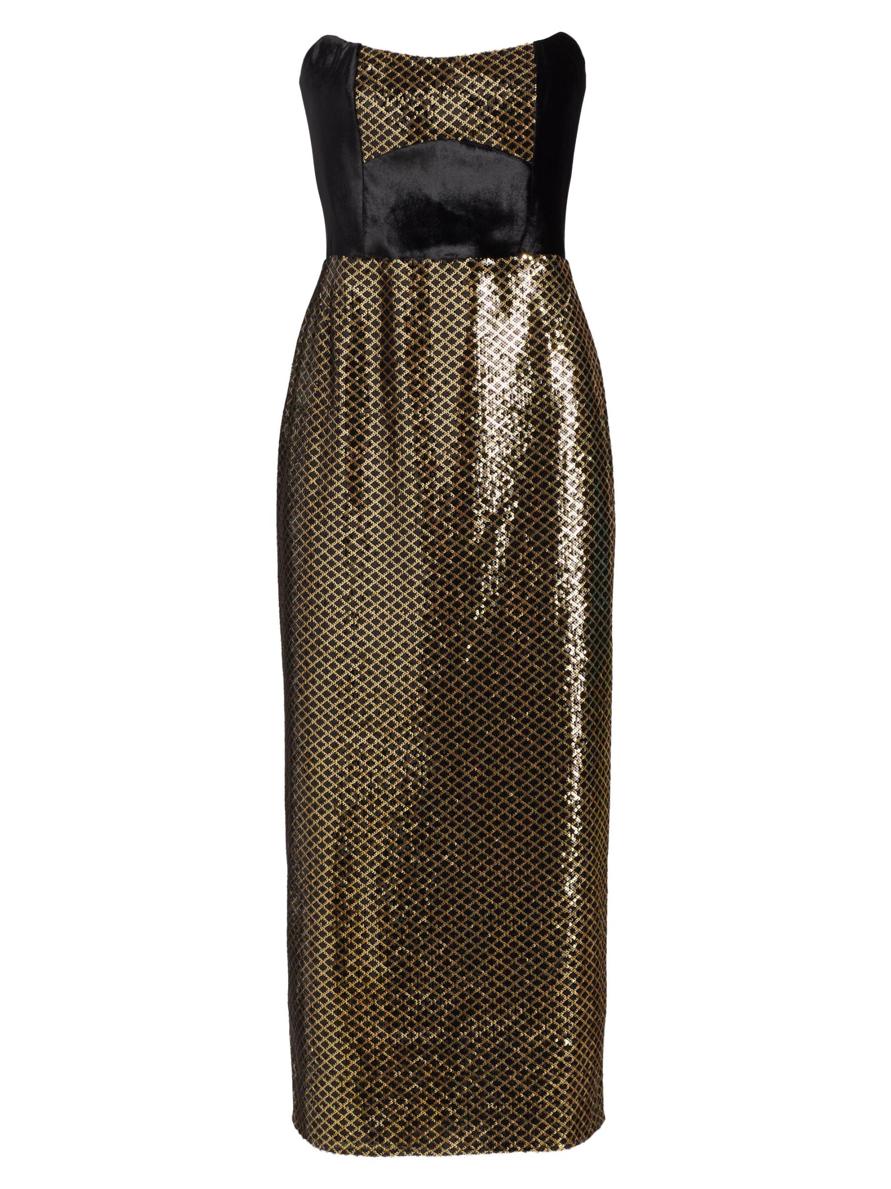 يتميز فستان Luna المتوسط من Brogo de Nor بتصميم ضيق بدون حمالات مع صدّار مكسو بألواح مخملية. يضفي الترتر الصغير اللامع بزخرفة شبكية لمعانًا على المظهر.