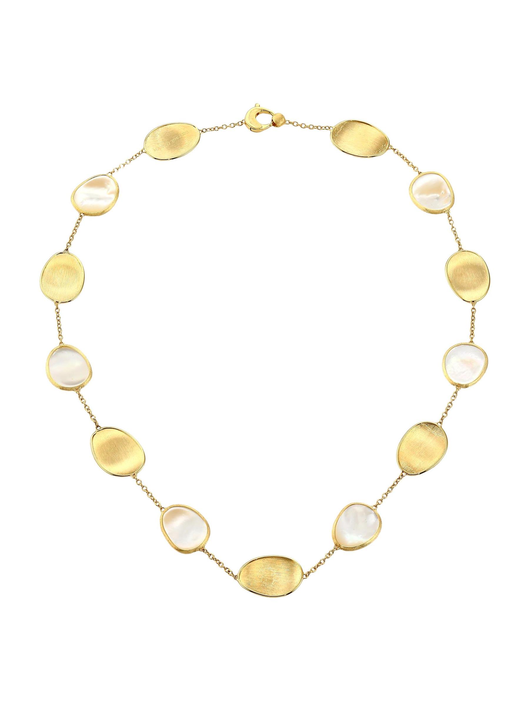 من مجموعة لوناريا. تزين هذه القلادة المصنوعة من الذهب الخالص وعرق اللؤلؤ هذه القلادة المصنوعة من خيوط ذهبية. منذ عام 2000، قام ماركو بيسيجو بدمج التقاليد والفضائل التي نقلها والده، حيث صنع المجوهرات يدويًا التي تجسد الحرفية الإيطالية والتصميم المعاصر.ذهب أصفر عيار 18 قيراط عرق اللؤلؤ الأبيض مشبك لوبستر صُنع في إيطاليا