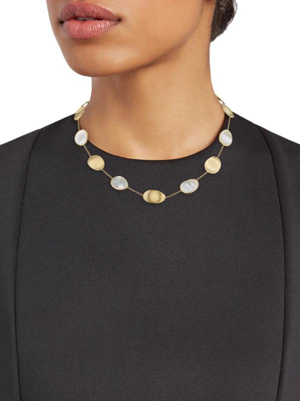 من مجموعة لوناريا. تزين هذه القلادة المصنوعة من الذهب الخالص وعرق اللؤلؤ هذه القلادة المصنوعة من خيوط ذهبية. منذ عام 2000، قام ماركو بيسيجو بدمج التقاليد والفضائل التي نقلها والده، حيث صنع المجوهرات يدويًا التي تجسد الحرفية الإيطالية والتصميم المعاصر.