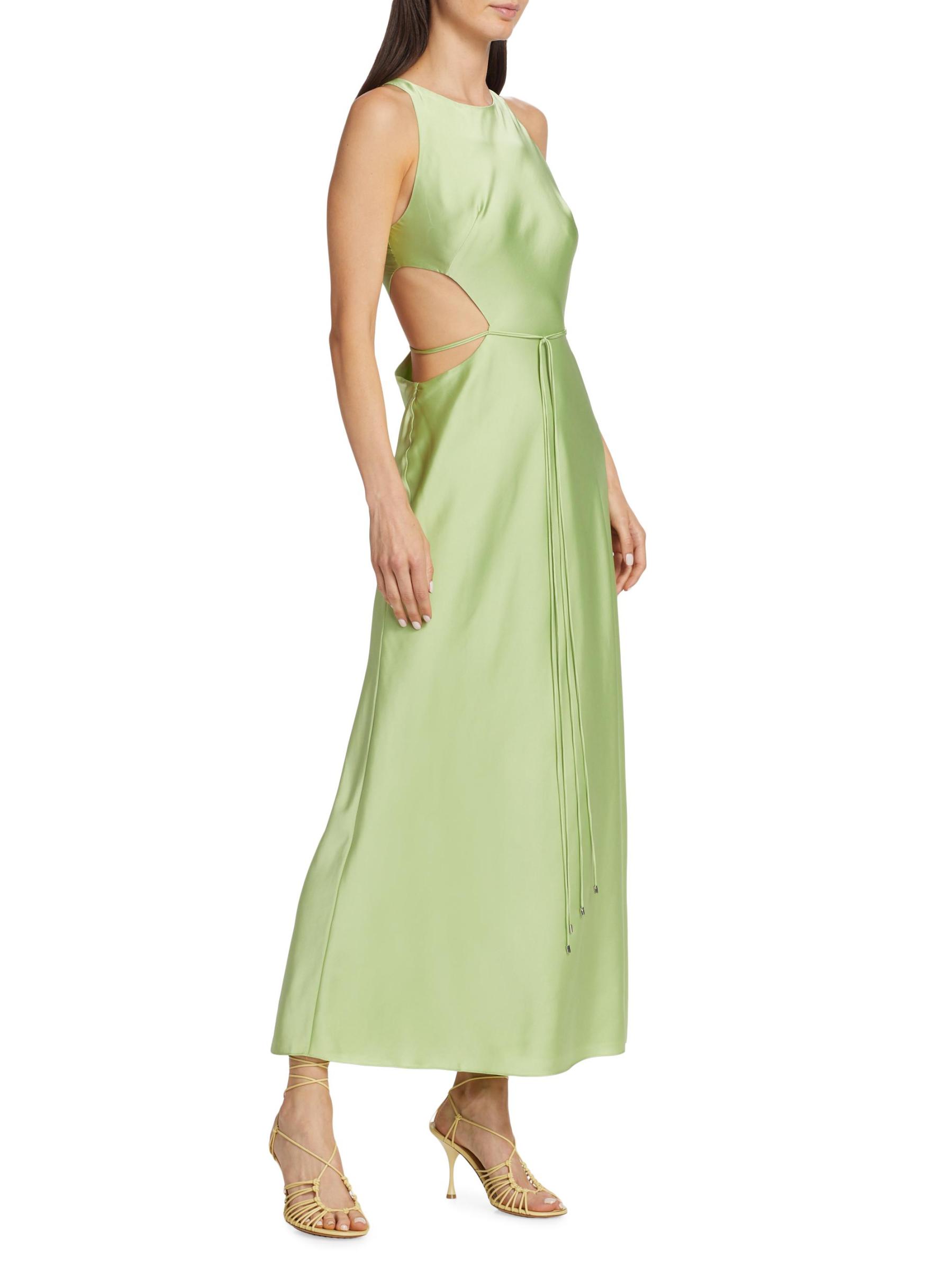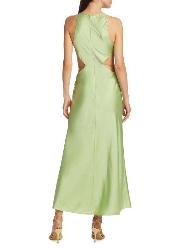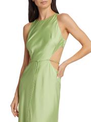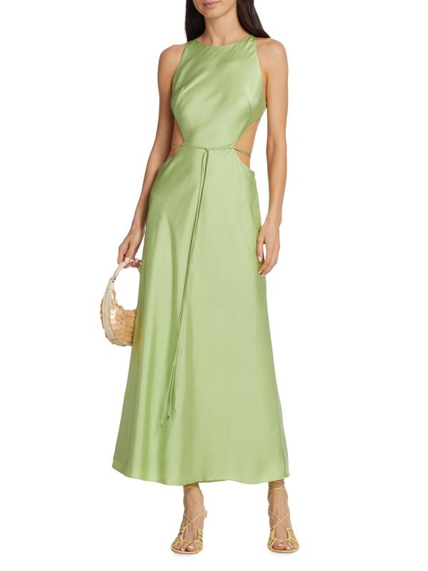 يتميز فستان Lune maxi من Alexis بصدّار ضيق مع فتحات جانبية ورقبة مستديرة عالية. يُكمل حزام الربط الذاتي المتناسق هذا النمط المصنوع من الساتان.