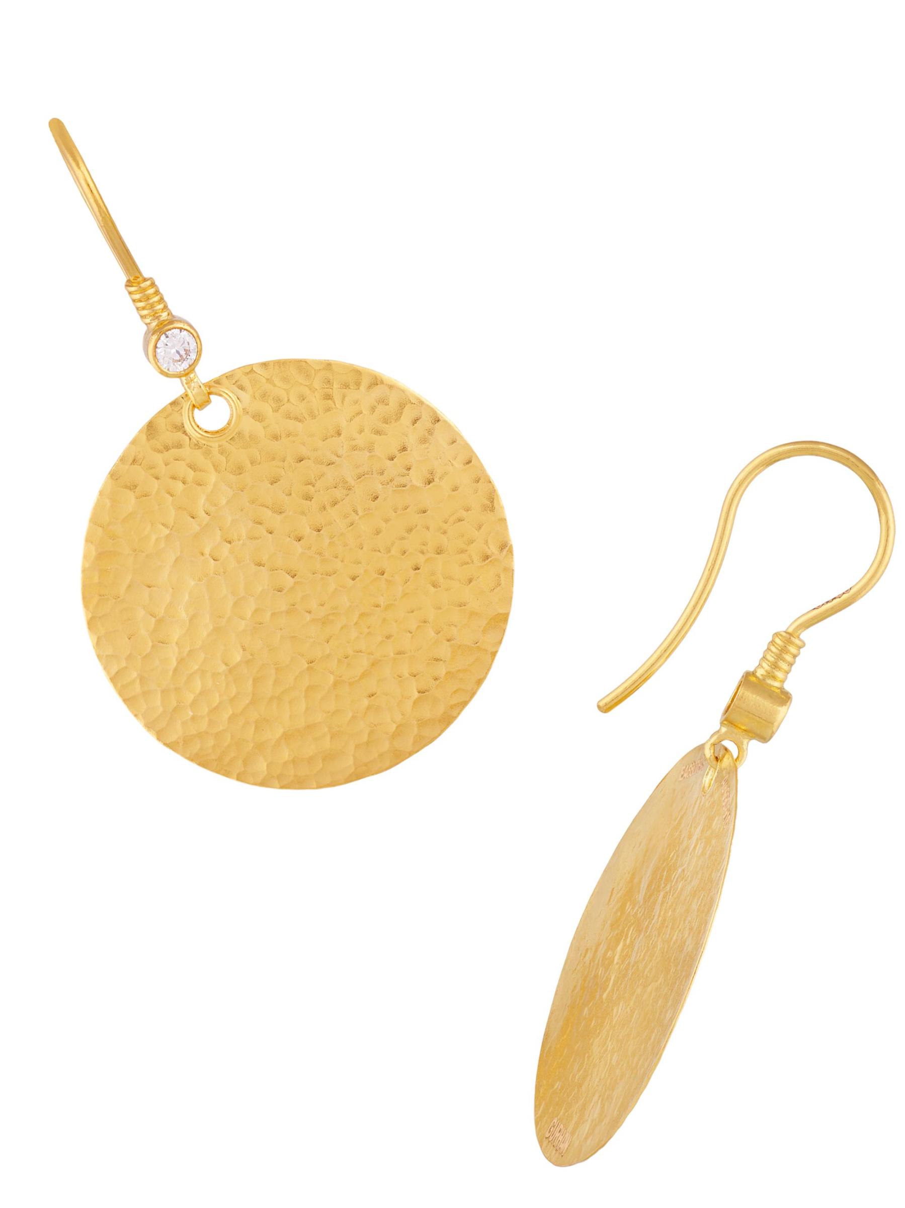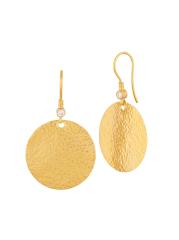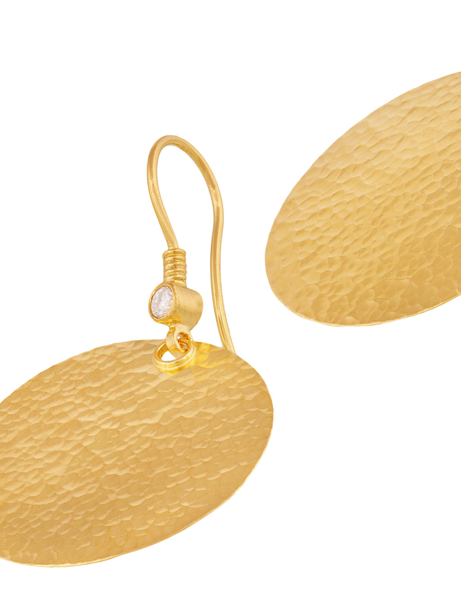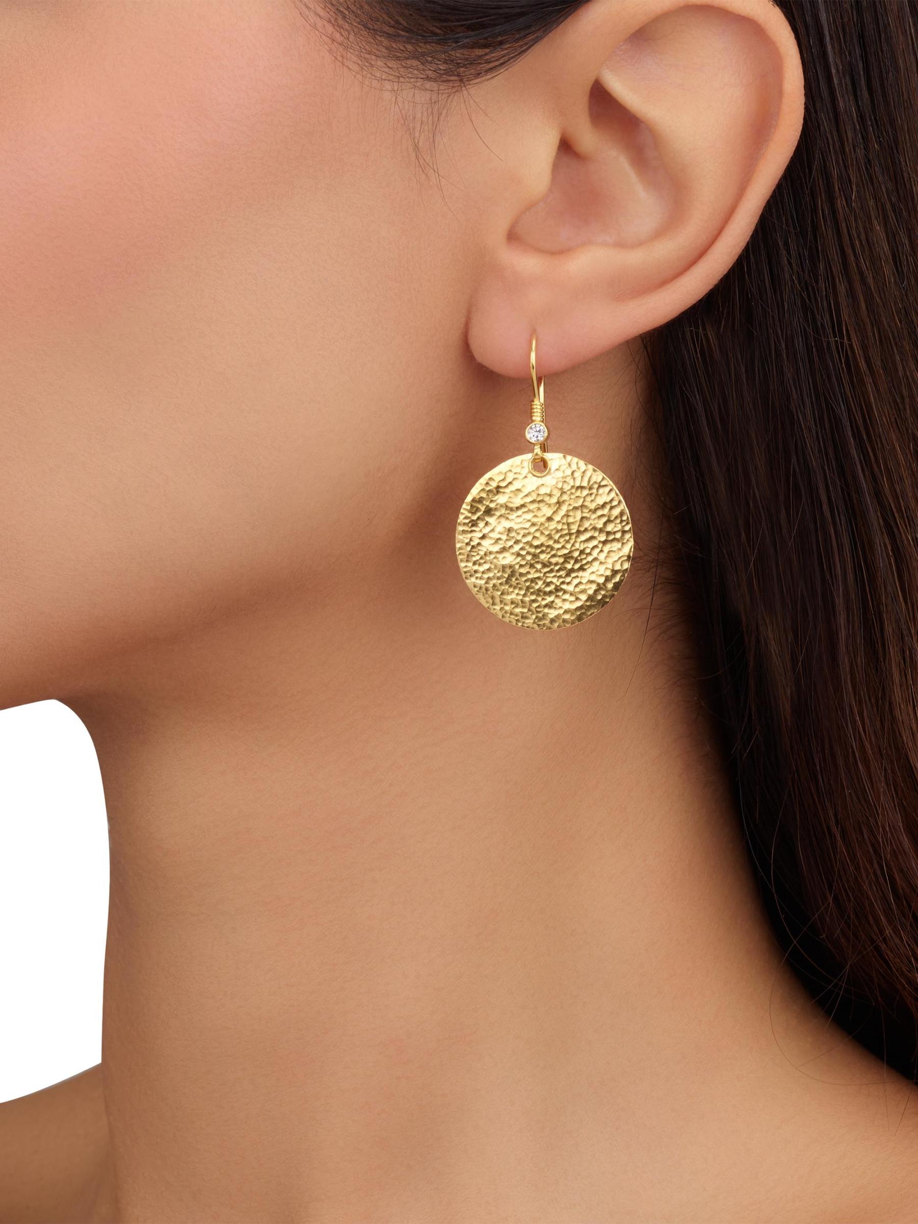 من مجموعة Lush. تتكون هذه الأقراط ذات الأقراص المطروقة من Gurhan من الذهب الأصفر عيار 22 قيراطًا و 18 قيراطًا والمزينة بأحجار الماس المستديرة الصغيرة. تأسست علامة المجوهرات التي تحمل نفس الاسم في عام 1994 على يد المصمم التركي غورهان أورهان، وتشتهر بقطعها الخالدة المصنوعة يدويًا باستخدام تقنيات عمرها قرون.الماس، 0.19 طن من الوزن درجة لون الماس: G-H درجة وضوح الماس: SI2 ذهب أصفر عيار 22 قيراط سلك فرنسي من الذهب الأصفر عيار 18 قيراط مستوردة