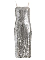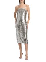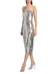 يتميز فستان Lyanna الكوكتيل من Ramy Brook، الذي تم تشطيبه بالترتر اللامع، بتصميم غمد أنيق وتفاصيل مزينة بالخرز وياقة مربعة.