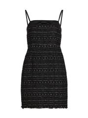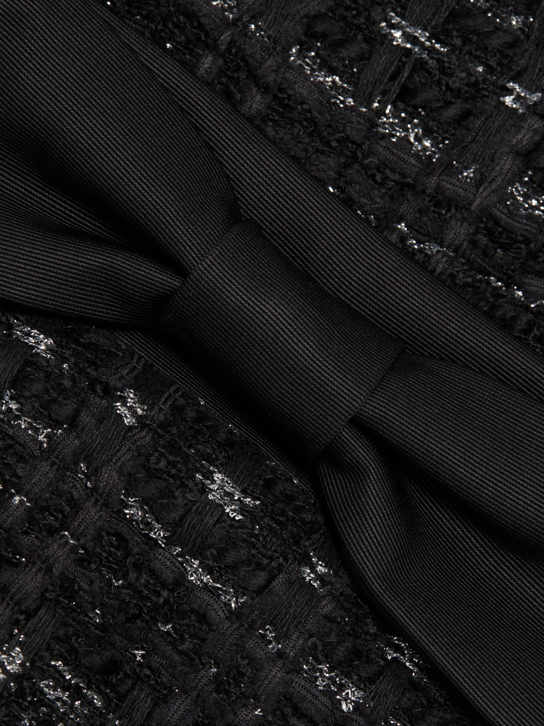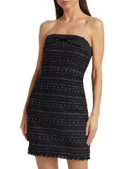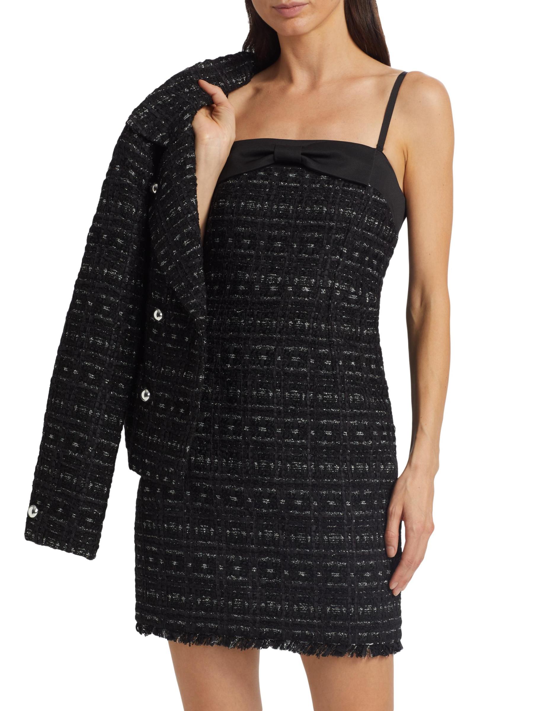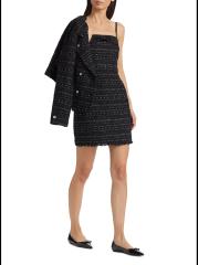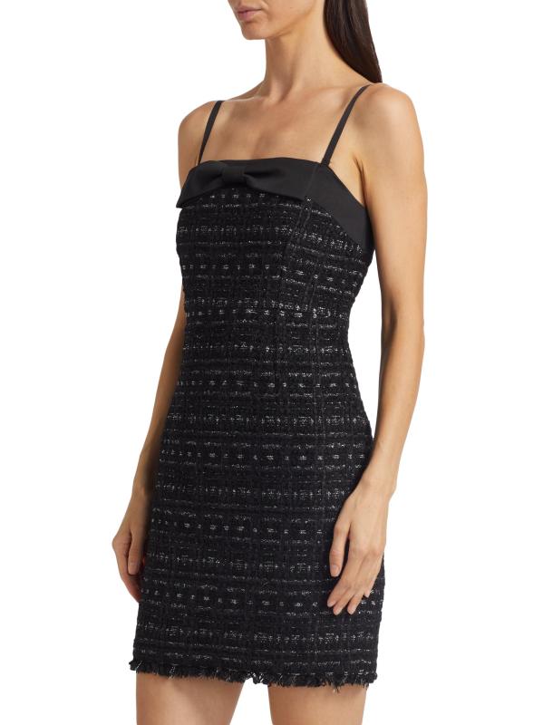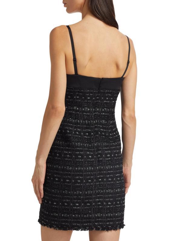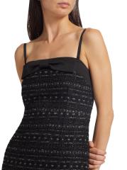 من مجموعة Mainline. فستان جالاكسي من كيت سبيد نيويورك مصنوع من التويد المعدني ويتميز بتفاصيل فيونكة من الساتان عند خط العنق المستقيم. تتميز هذه الصورة الظلية الضيقة بأحزمة سباغيتي قابلة للإزالة وحافة مهدبة.