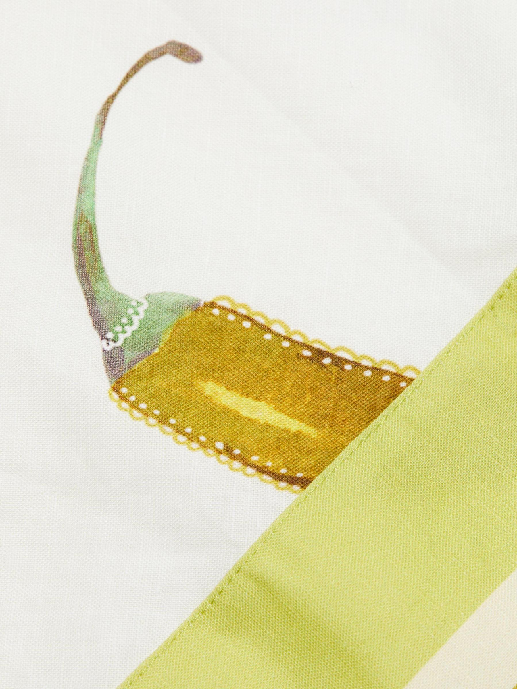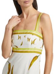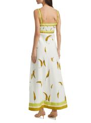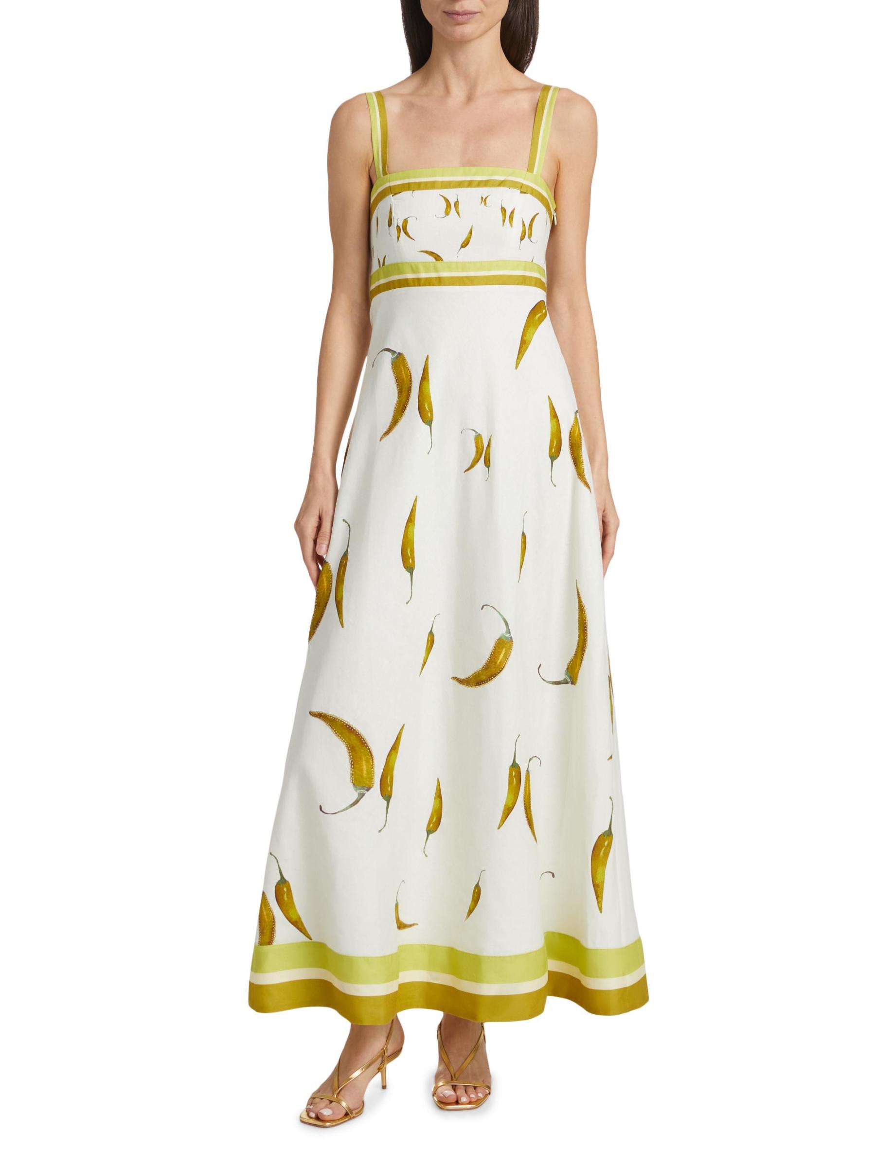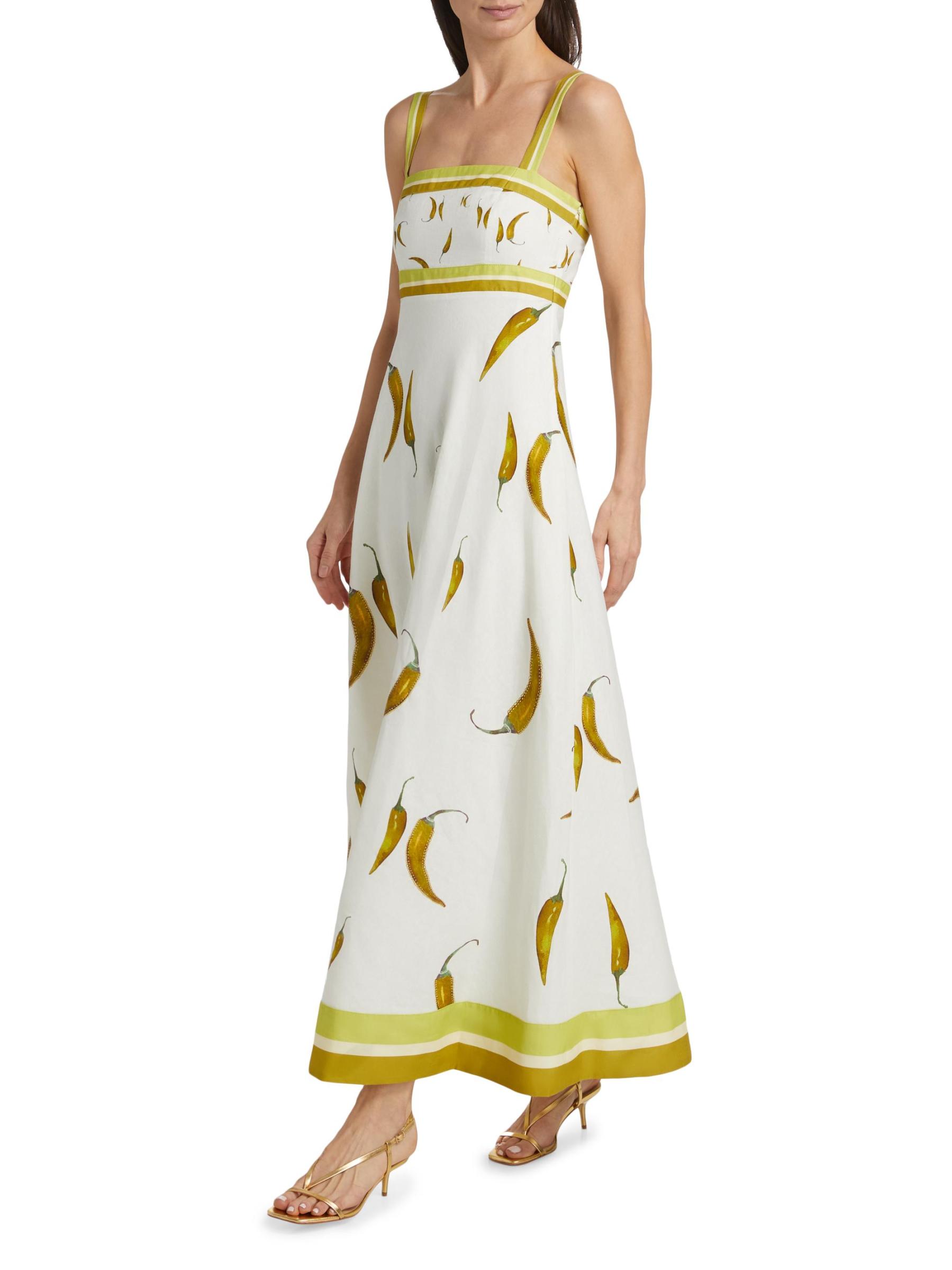 يتميز فستان Margarita الطويل من الكتان والقطن من Kivari بطبعة الفلفل الأخضر الحار مع خطوط متباينة. وتكتمل الصورة الظلية بأحزمة كتف قابلة للتعديل، وياقة مستقيمة، وحاشية واسعة رقيقة.