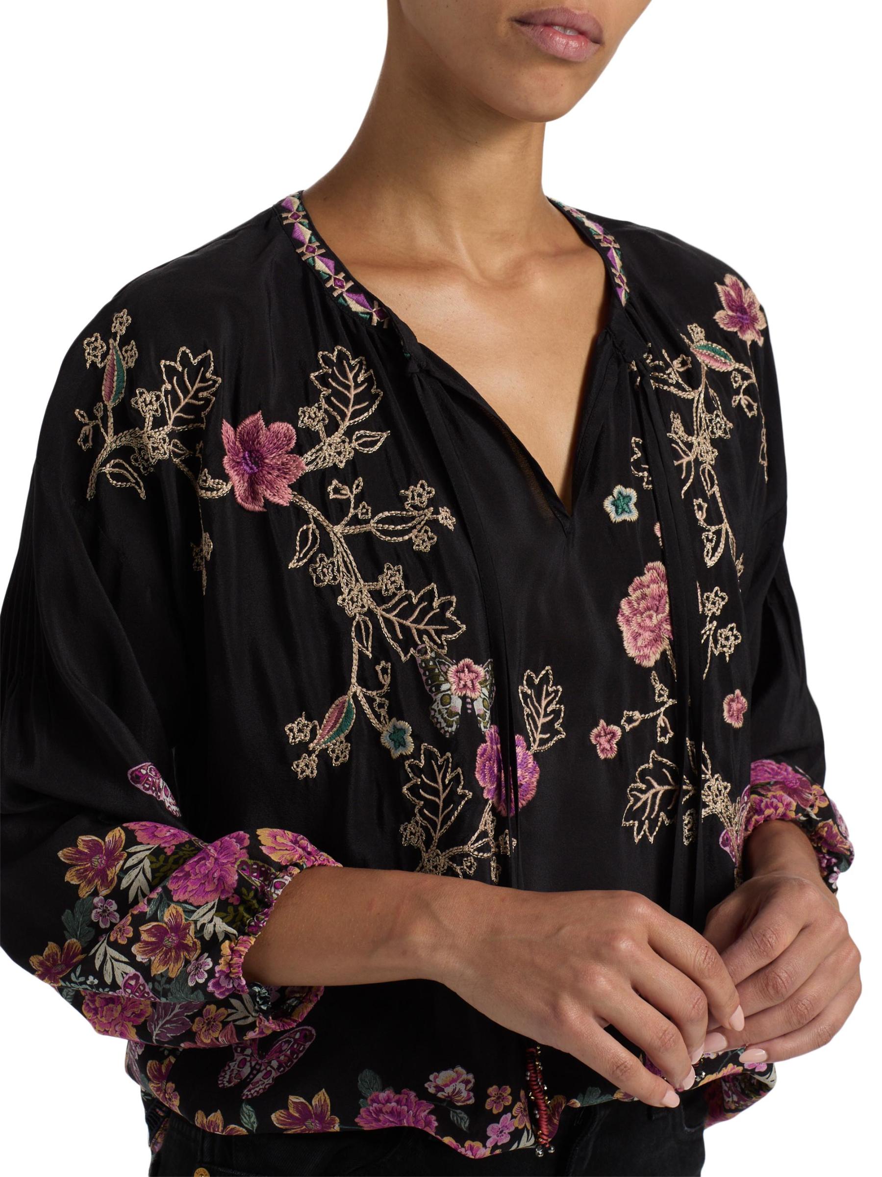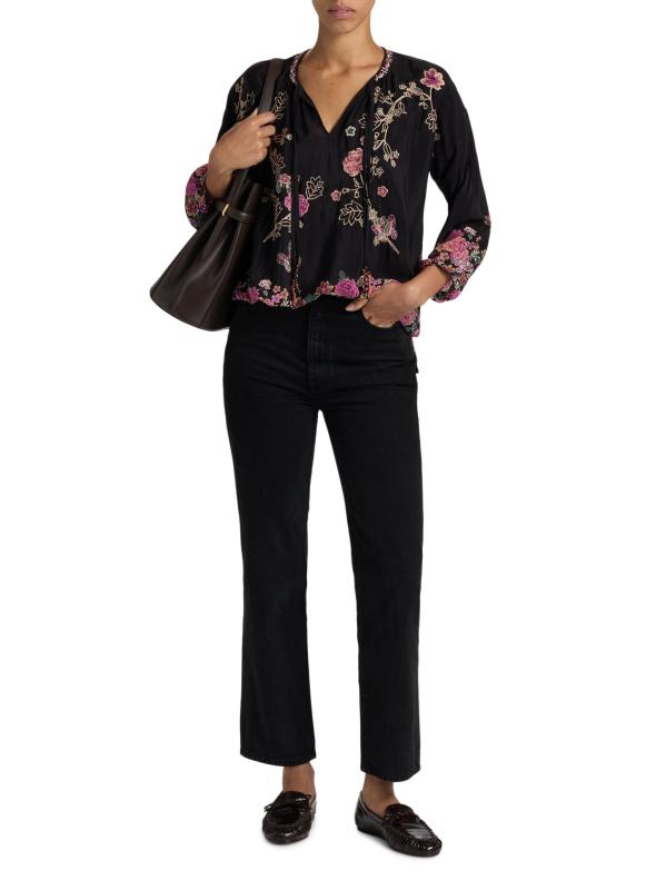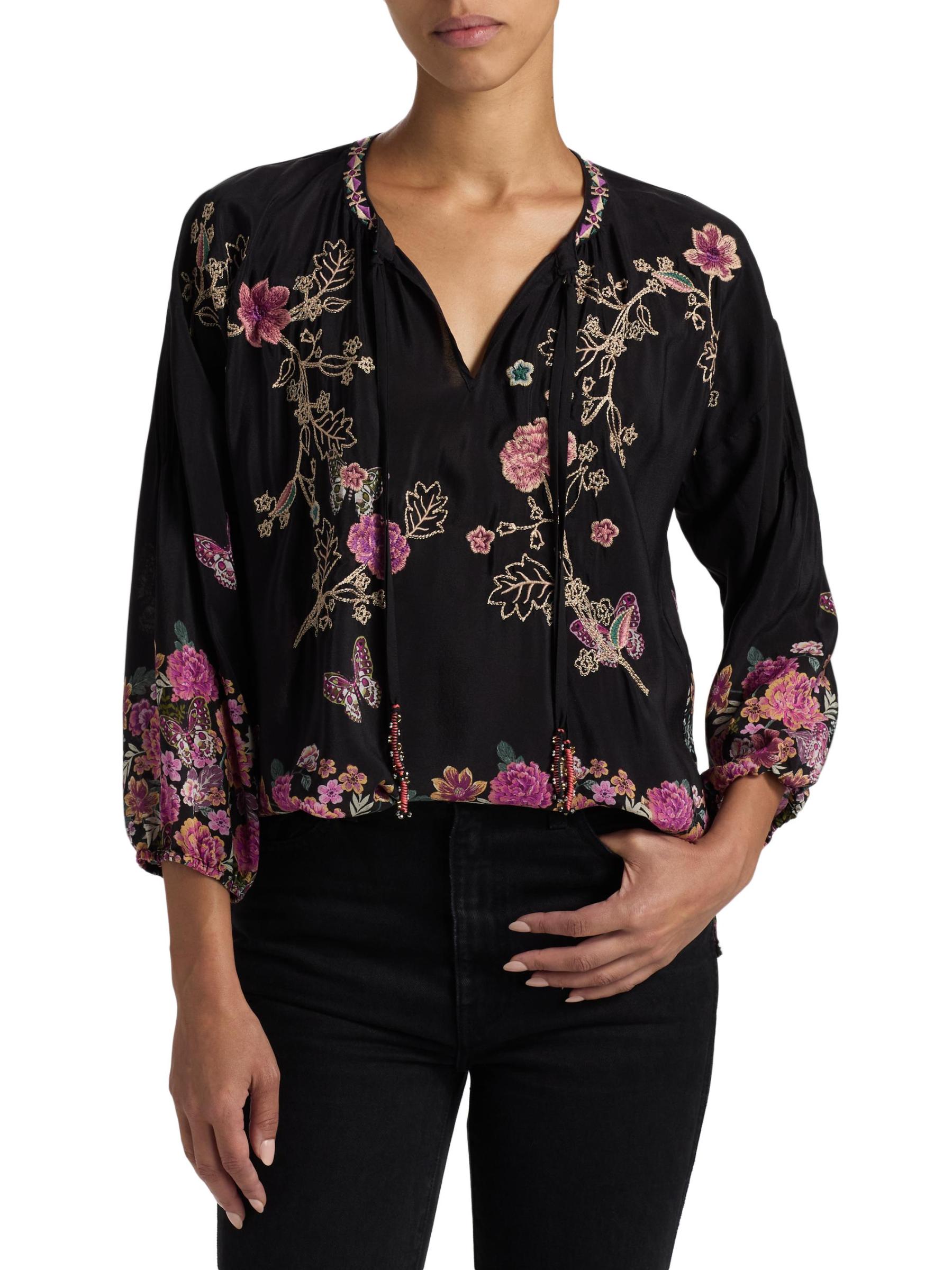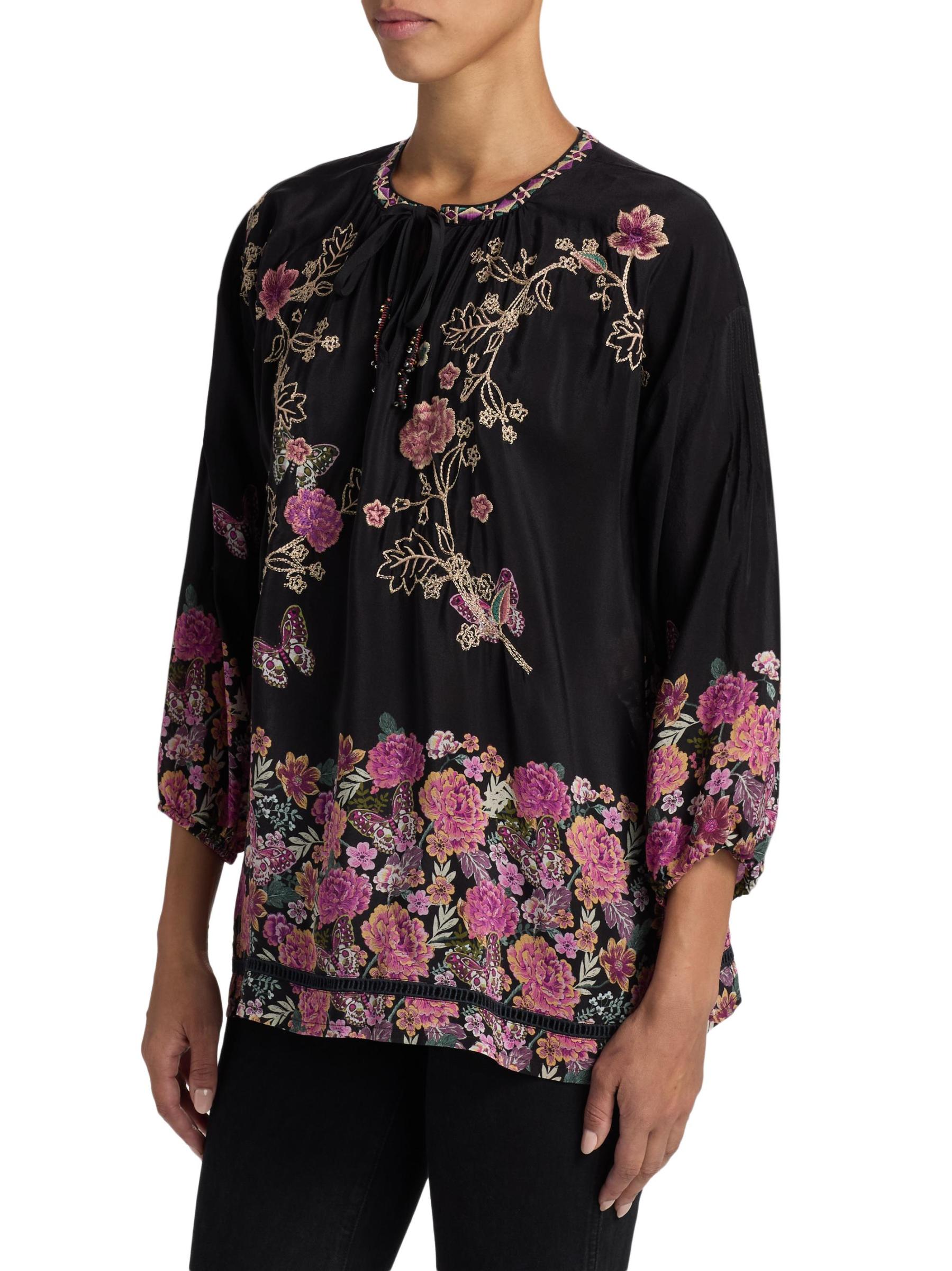 ترتقي بلوزة Margot من Johnny Was بتصميم الحرير الخفيف بتطريز مذهل مستوحى من الحديقة. تم تصميم هذه القطعة برقبة متعددة الاستخدامات بفتحة المفتاح، وتتضمن ربطات عنق قابلة للتعديل.