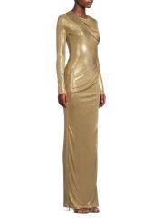 يتميز فستان ماريكا المعدني هذا من Black Halo برقبة على شكل جوهرة ولفائف قطرية وشق جانبي مرتفع.