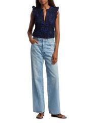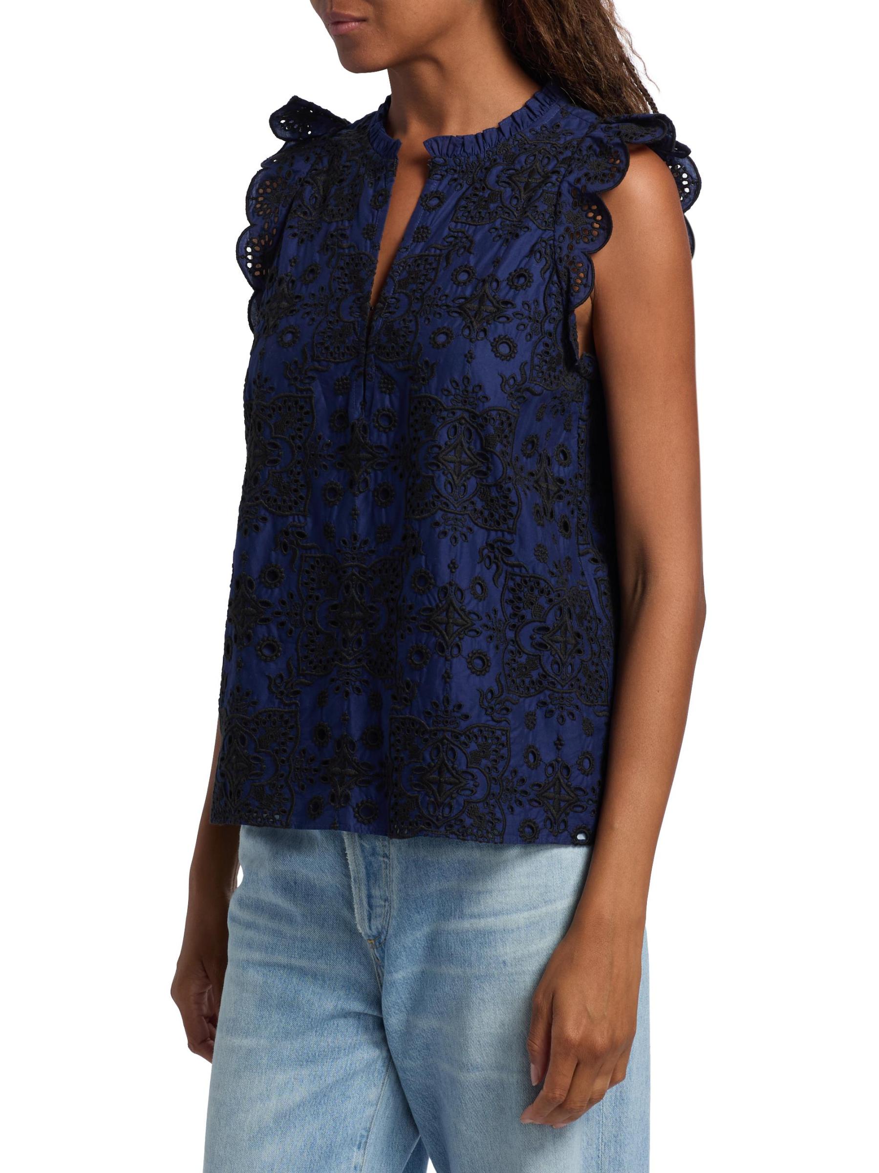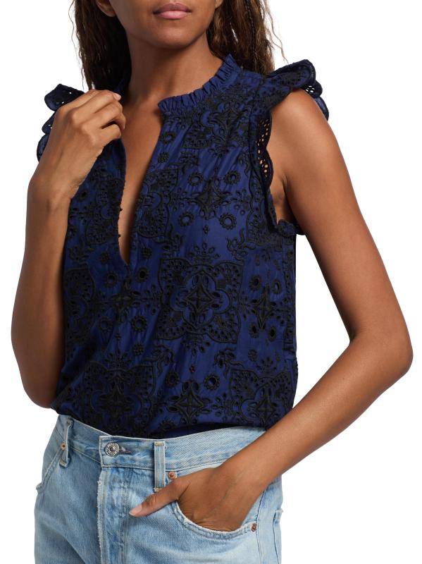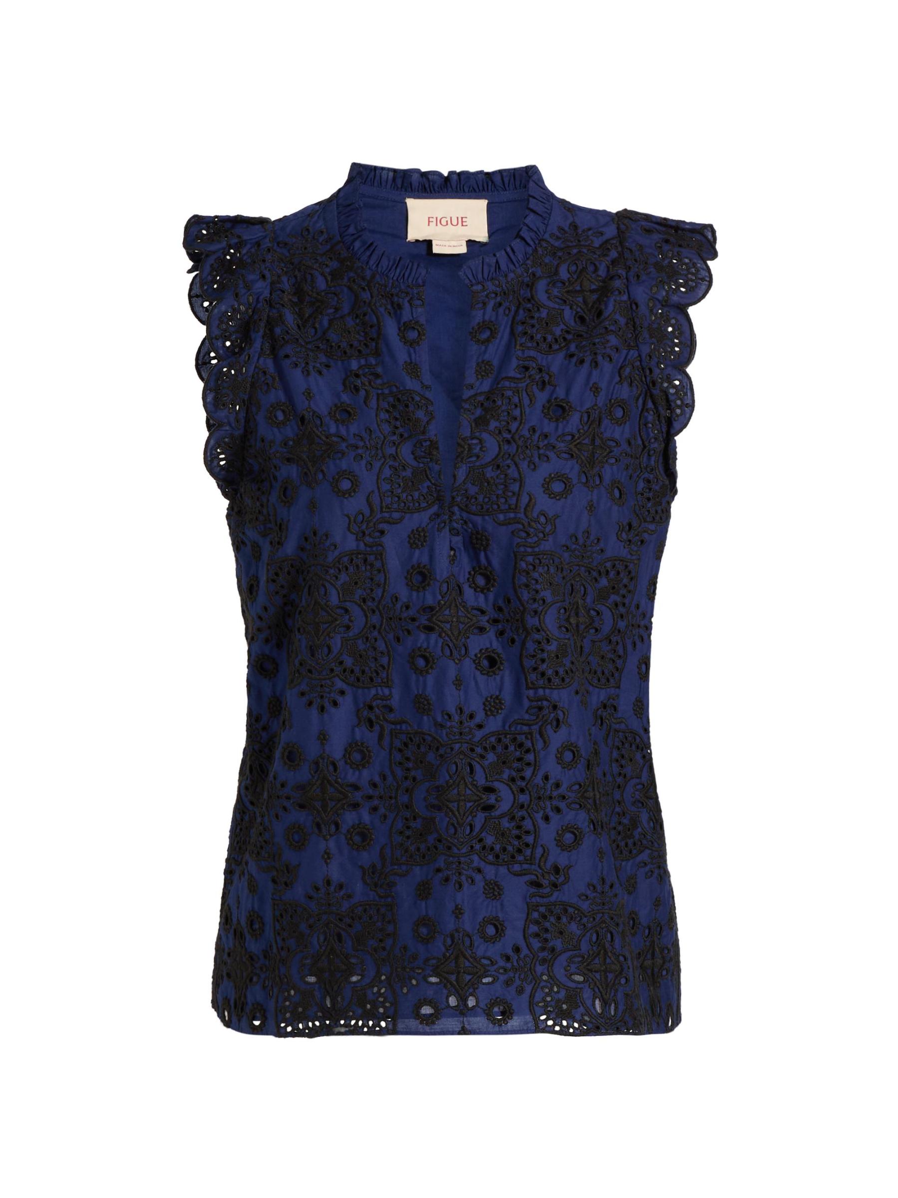 بلوزة Maris من Figue مصنوعة من القطن وتتميز بتفاصيل مطرزة وأساور صدفية مزينة بفتحات.
