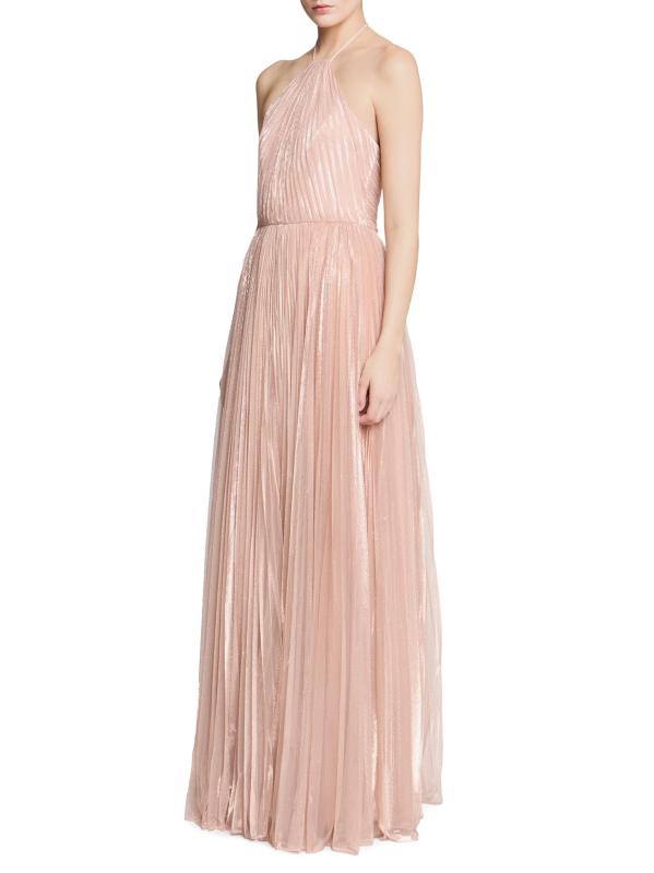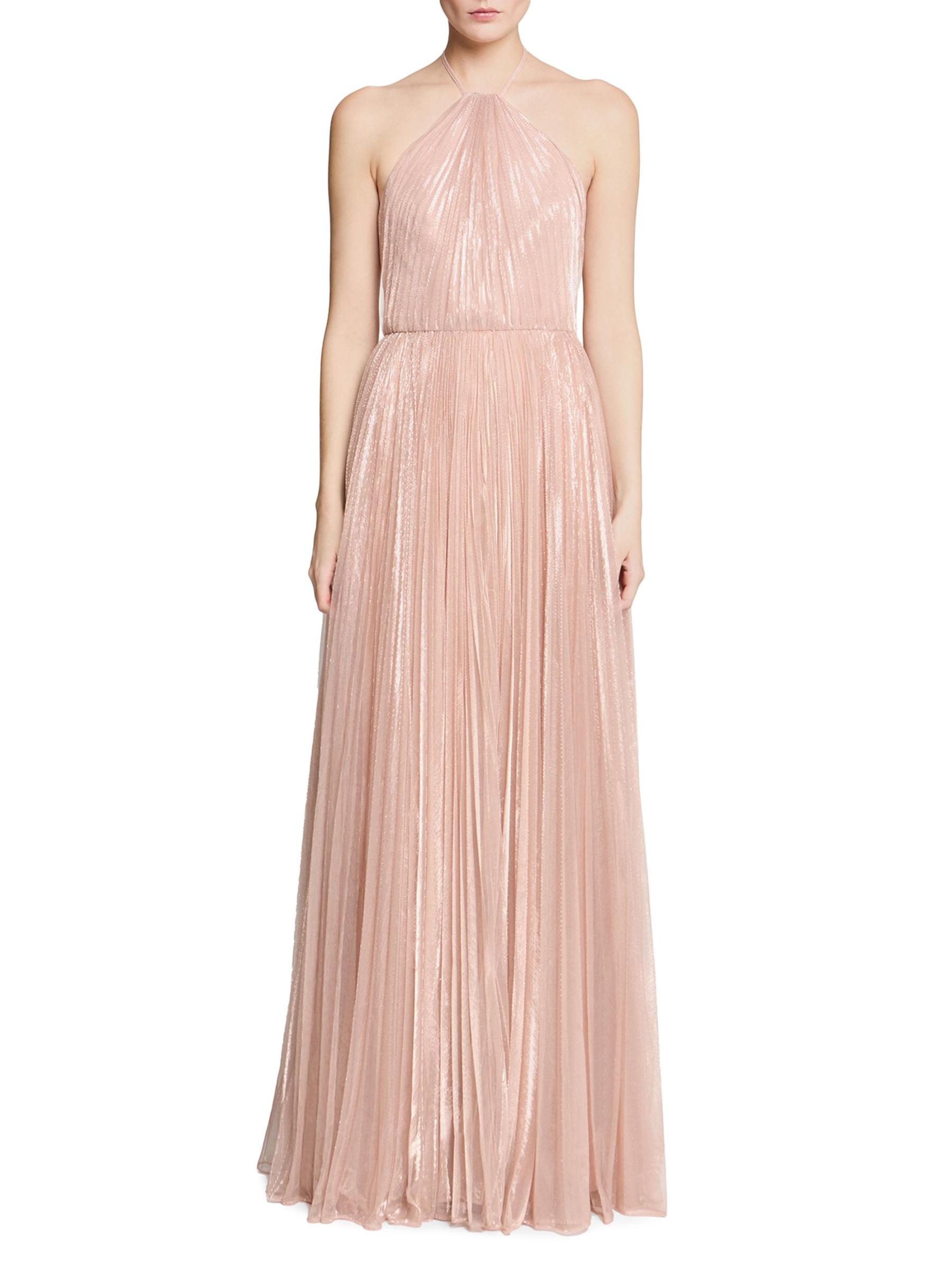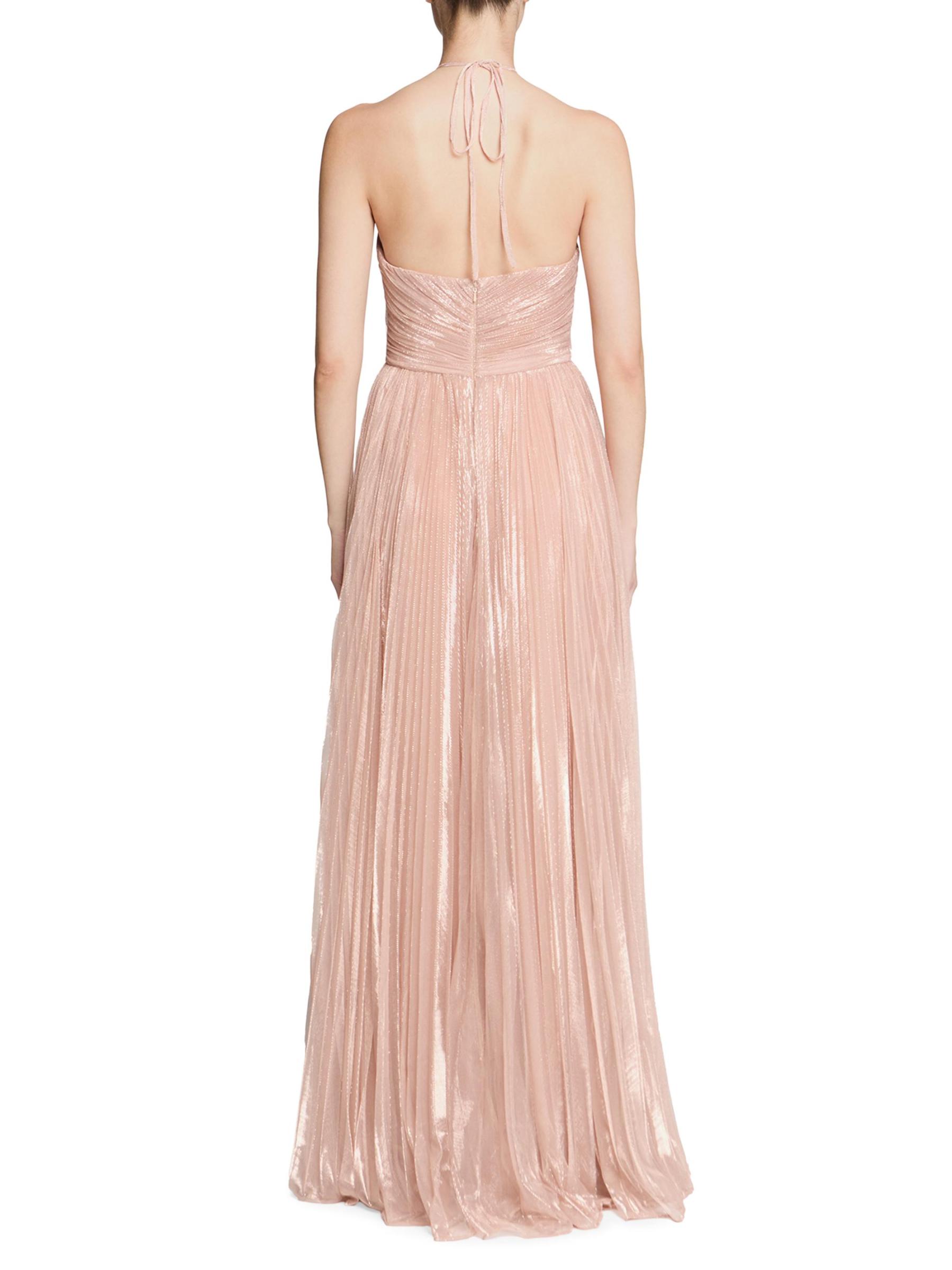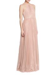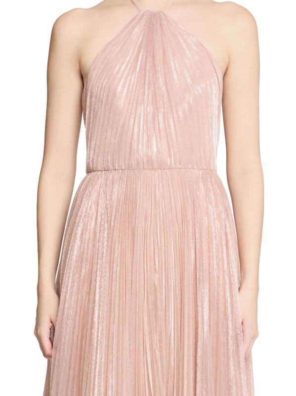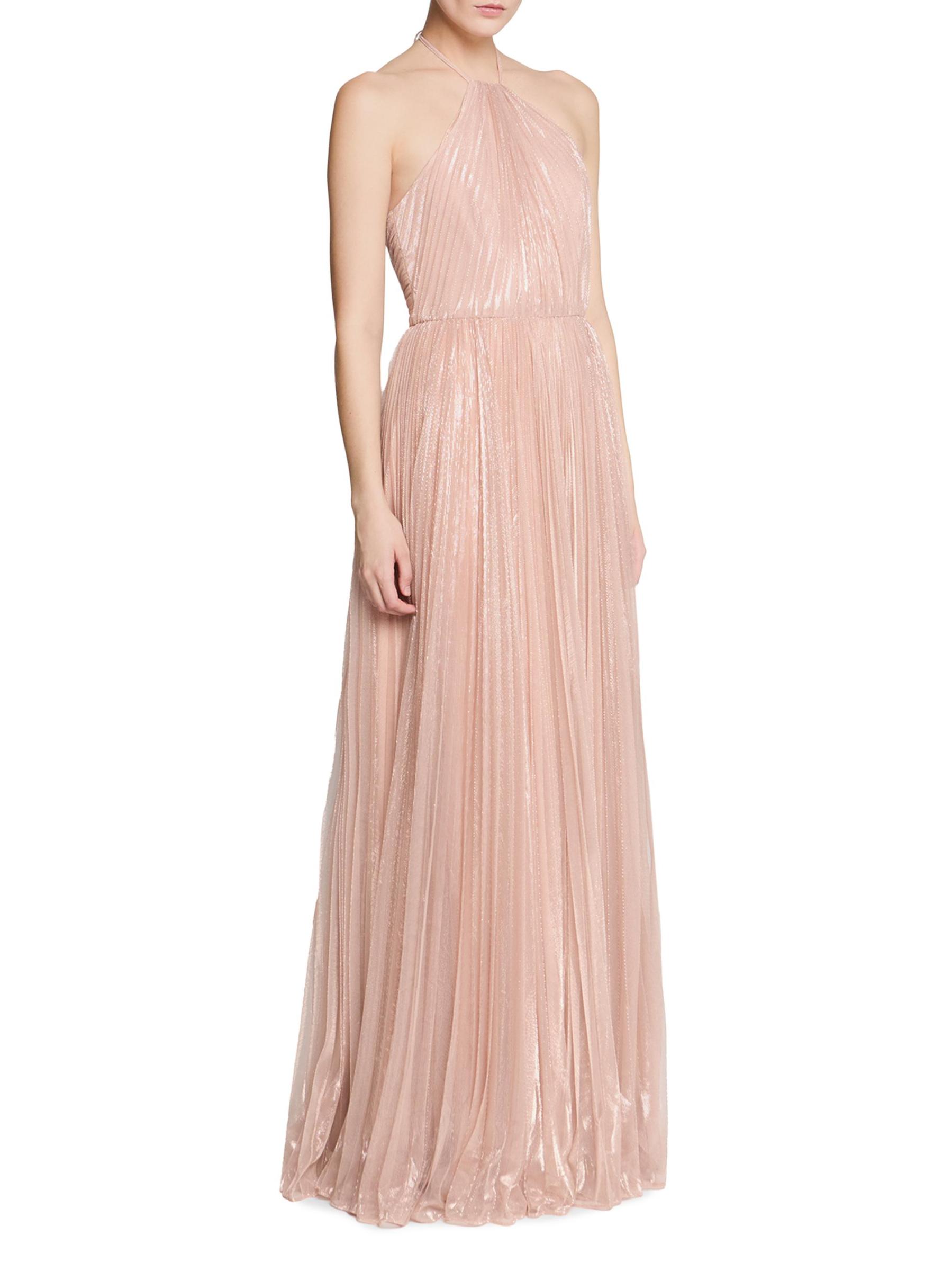 تم تصميم فستان Marisol Plissé هذا من Halston برقبة رسن ولمسة نهائية لامعة.