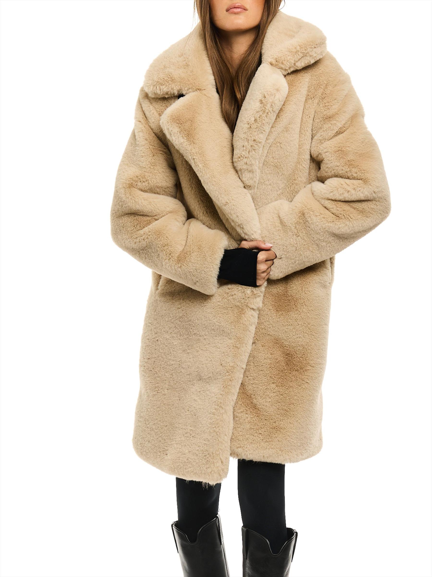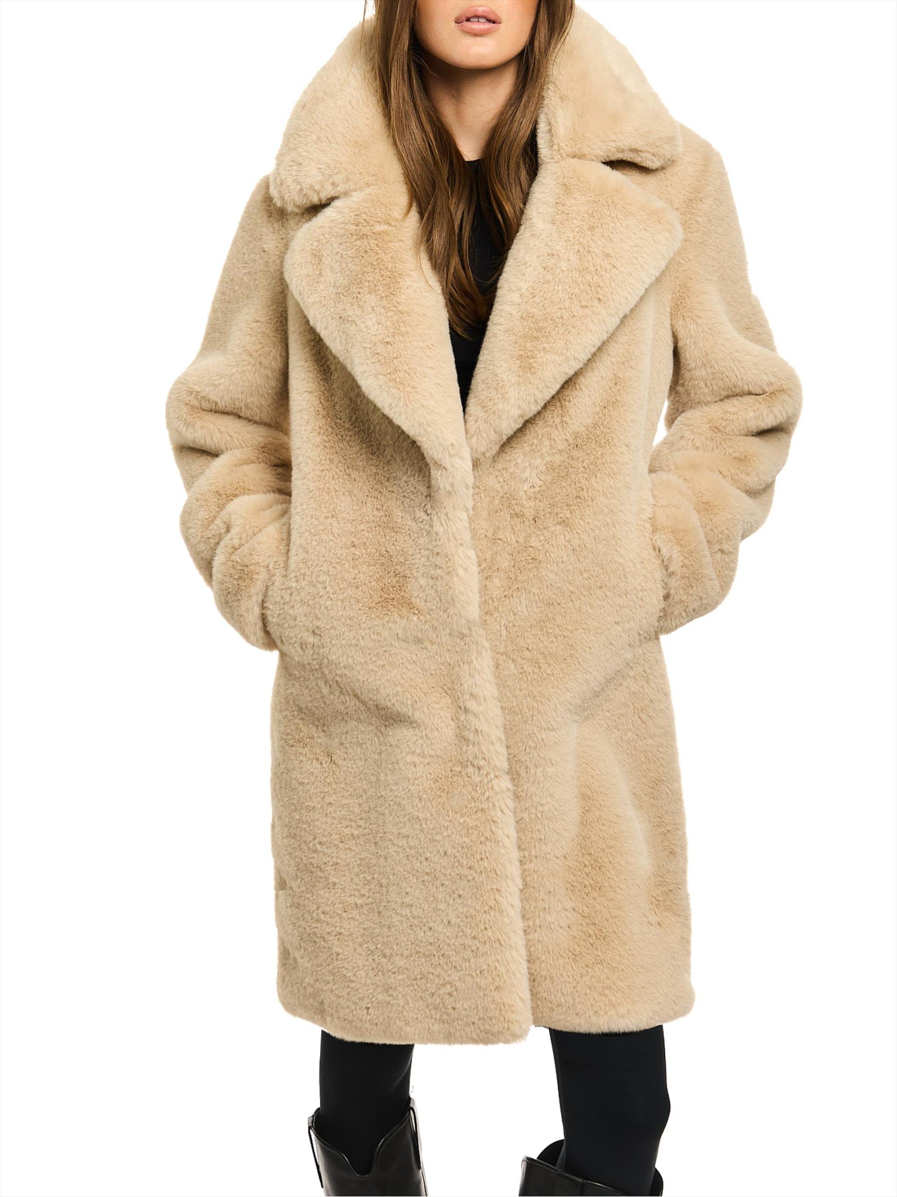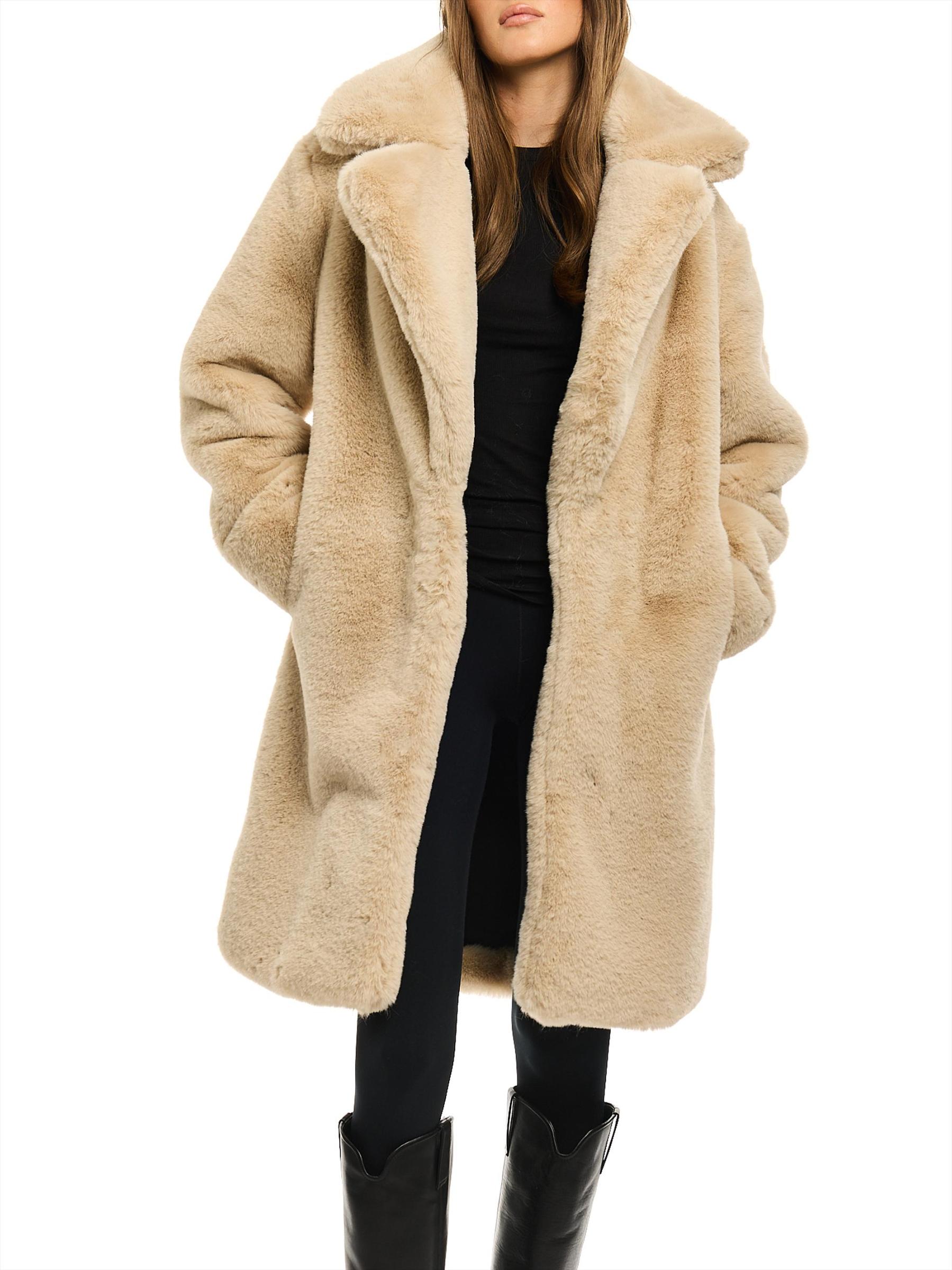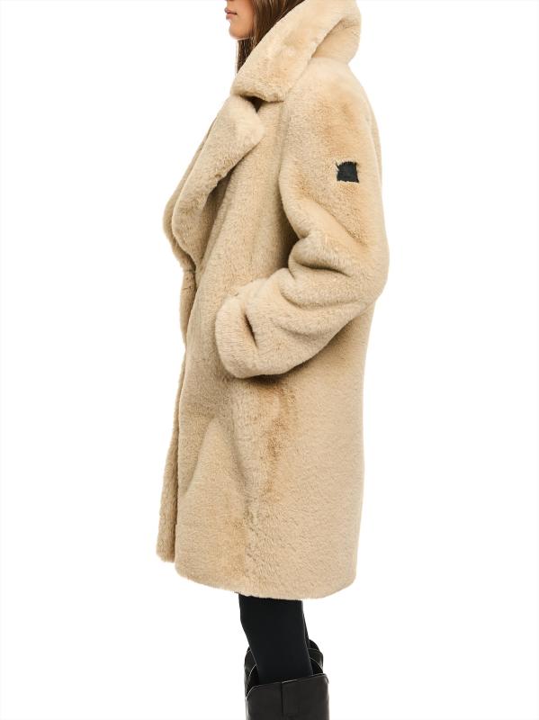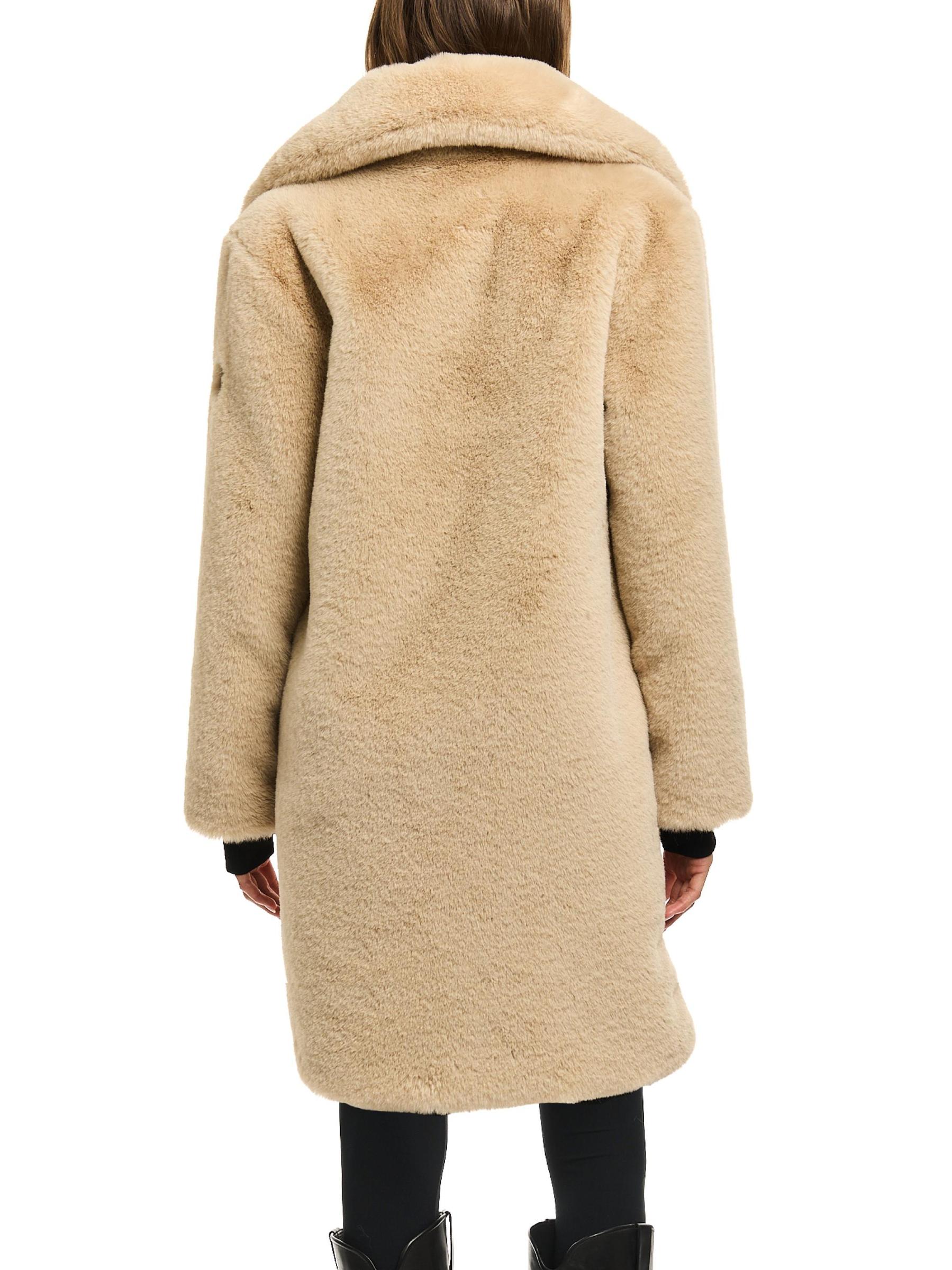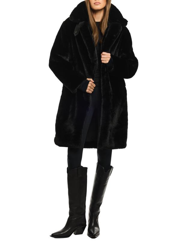 صُنع معطف Marla من SAM. من الفرو الصناعي، ويتميز بثنيات صدرية كبيرة الحجم. تتميز هذه القطعة بأساور مضلعة مع فتحات للإبهام وتُغلق بخطاف وحلقة.