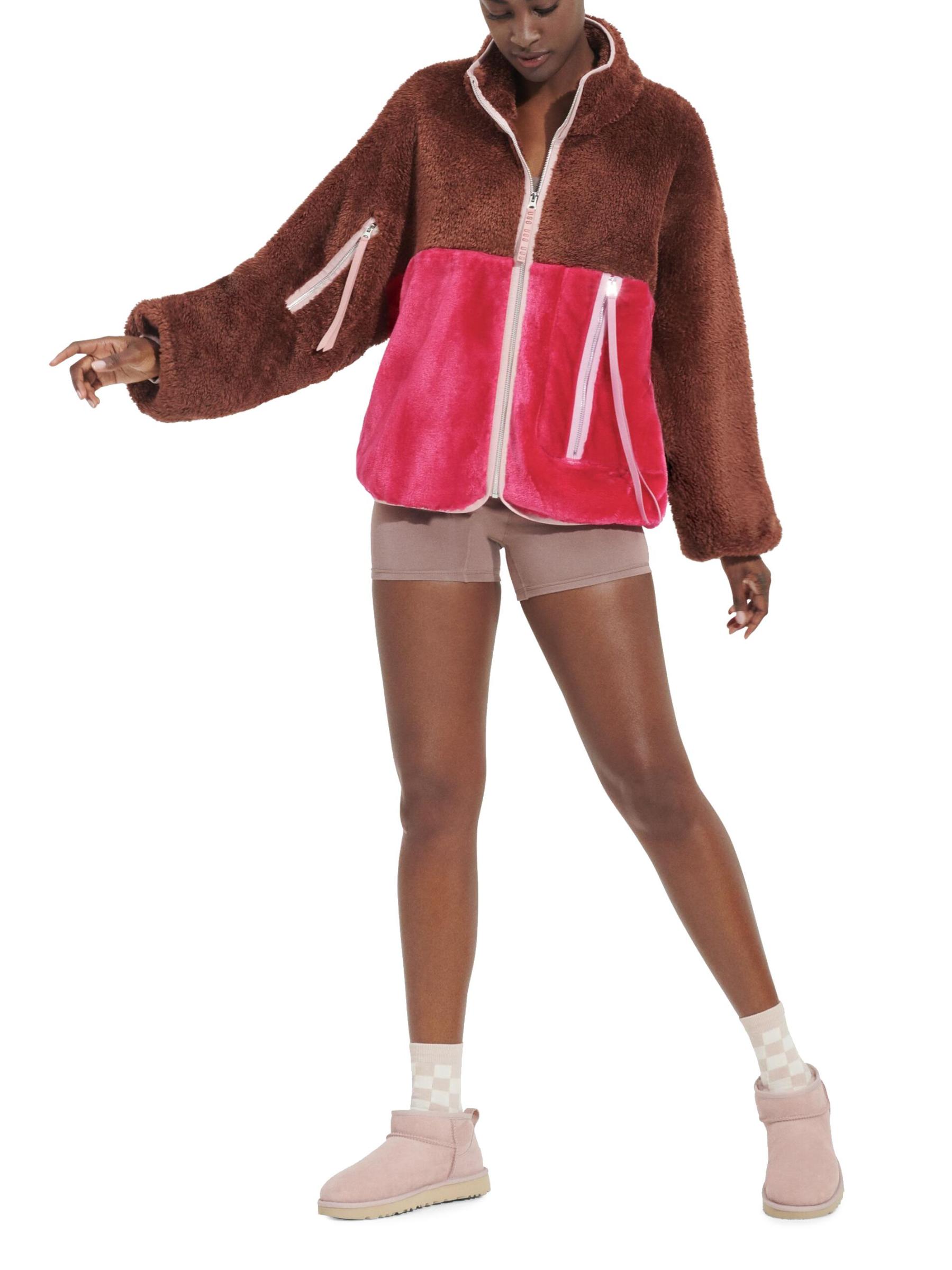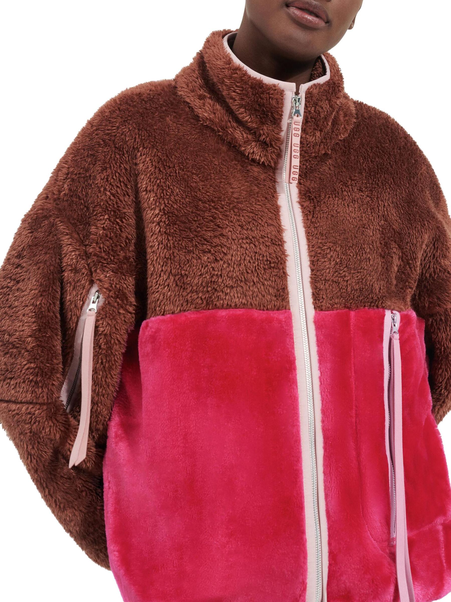 جاكيت Marlene من UGG مصنوع من الشيربا ومزين بالجلد المدبوغ الصناعي. يتميز هذا النمط المريح بسحّاب منقوش عليه الشعار، ويتميز بياقة عريضة وأكمام طويلة وجيوب مشقوقة.