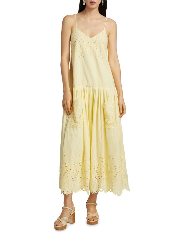 هذا الفستان الطويل ذو العيينة مارتن من Hunter Bell مصنوع من القطن الناعم ويتميز بأحزمة سباغيتي وتصميم بخصر منخفض وحاشية صدفية.