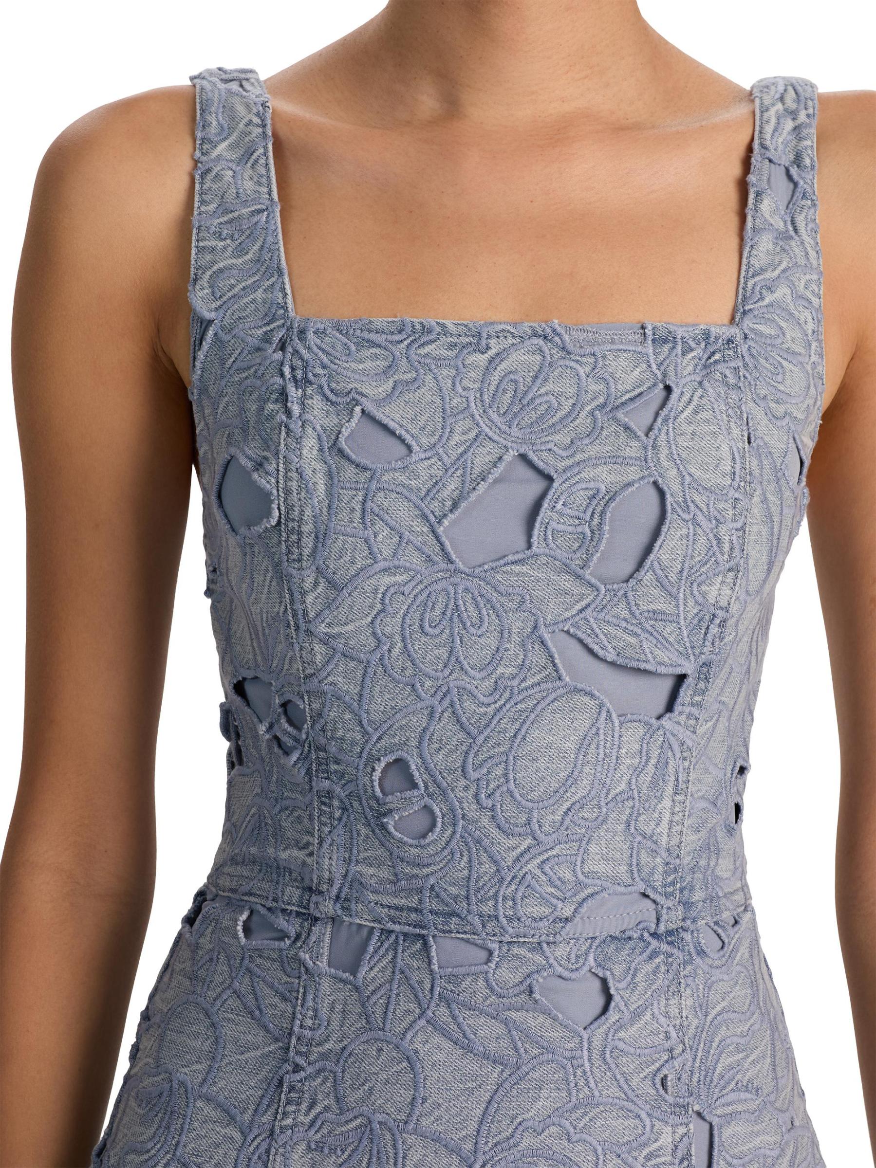 صُنع فستان Maryann الصغير من Alice + Olivia من الدنيم القطني المعقد المقطوع بالليزر مع تقويرة مربعة.