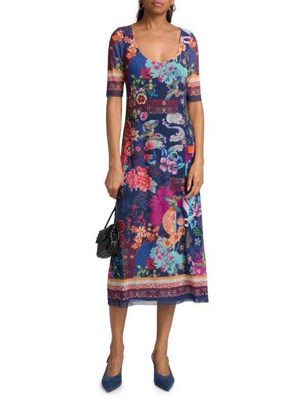 يتميز فستان مايا المتوسط من جوني واس، الذي تم تشطيبه بطبعة مشرقة، بتصميم شبكي لإطلالة بوهيمية منعشة.