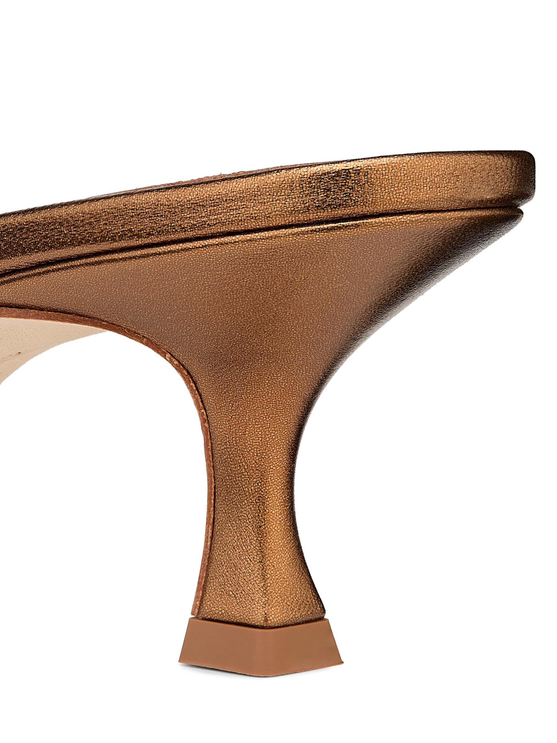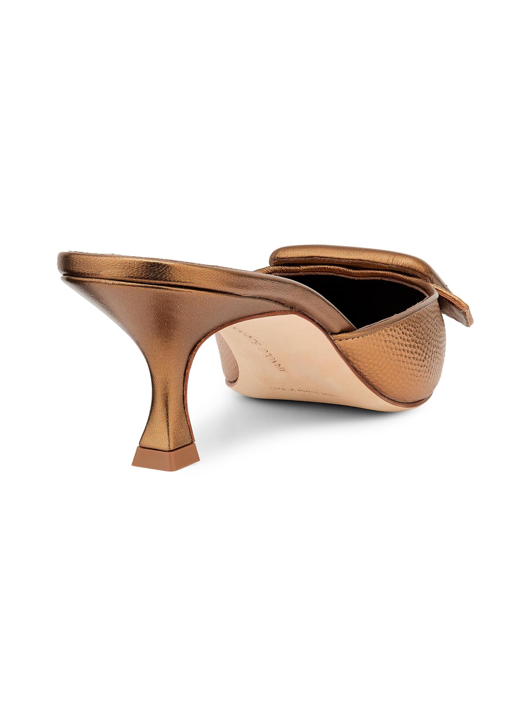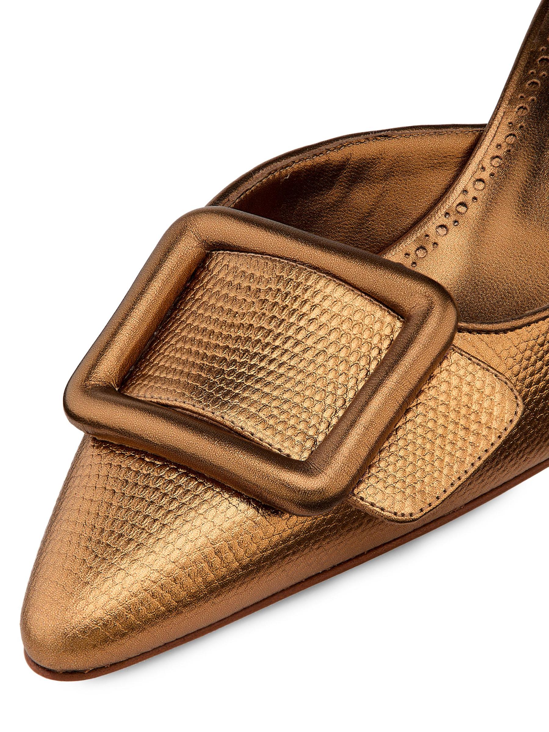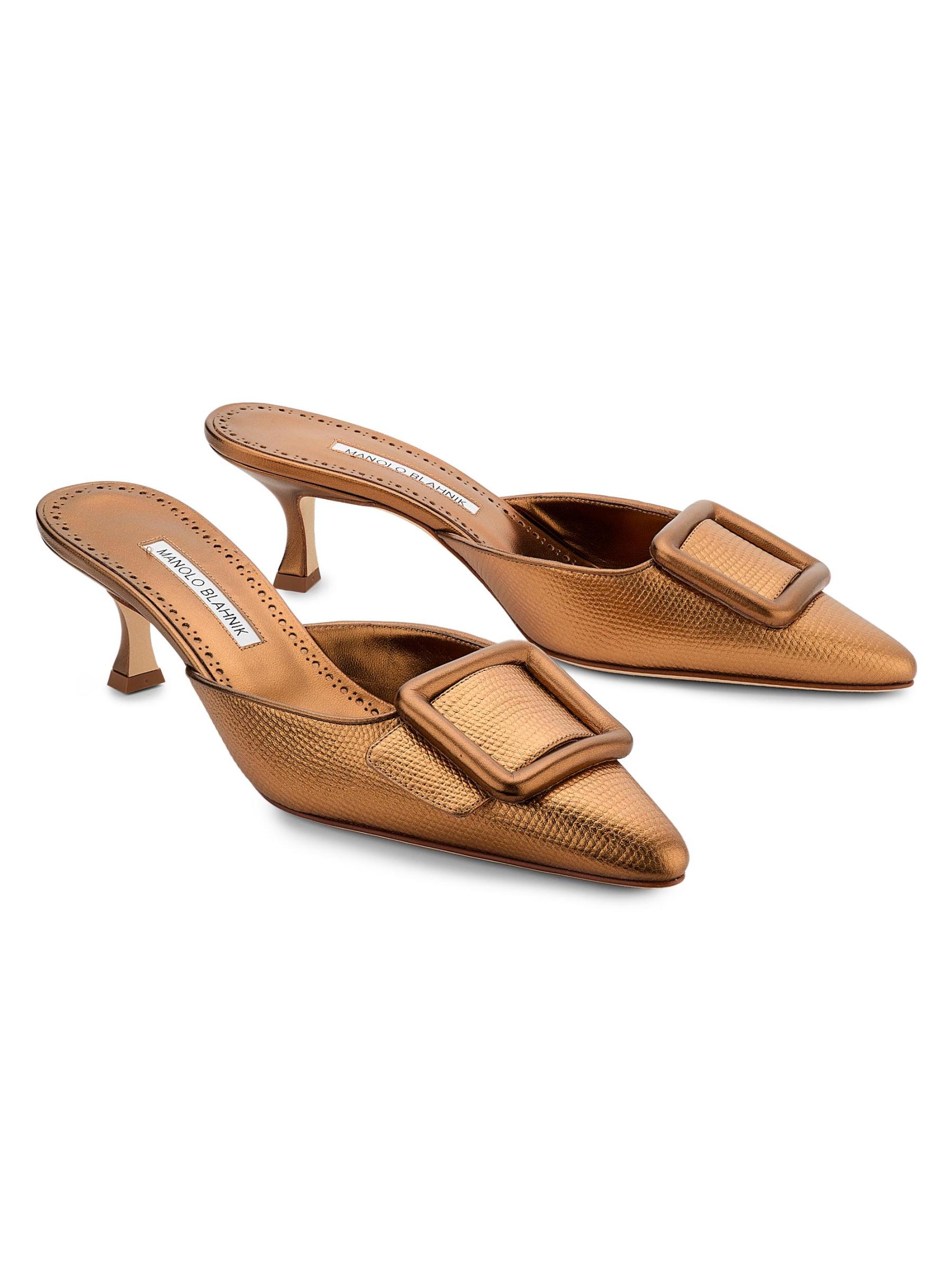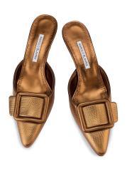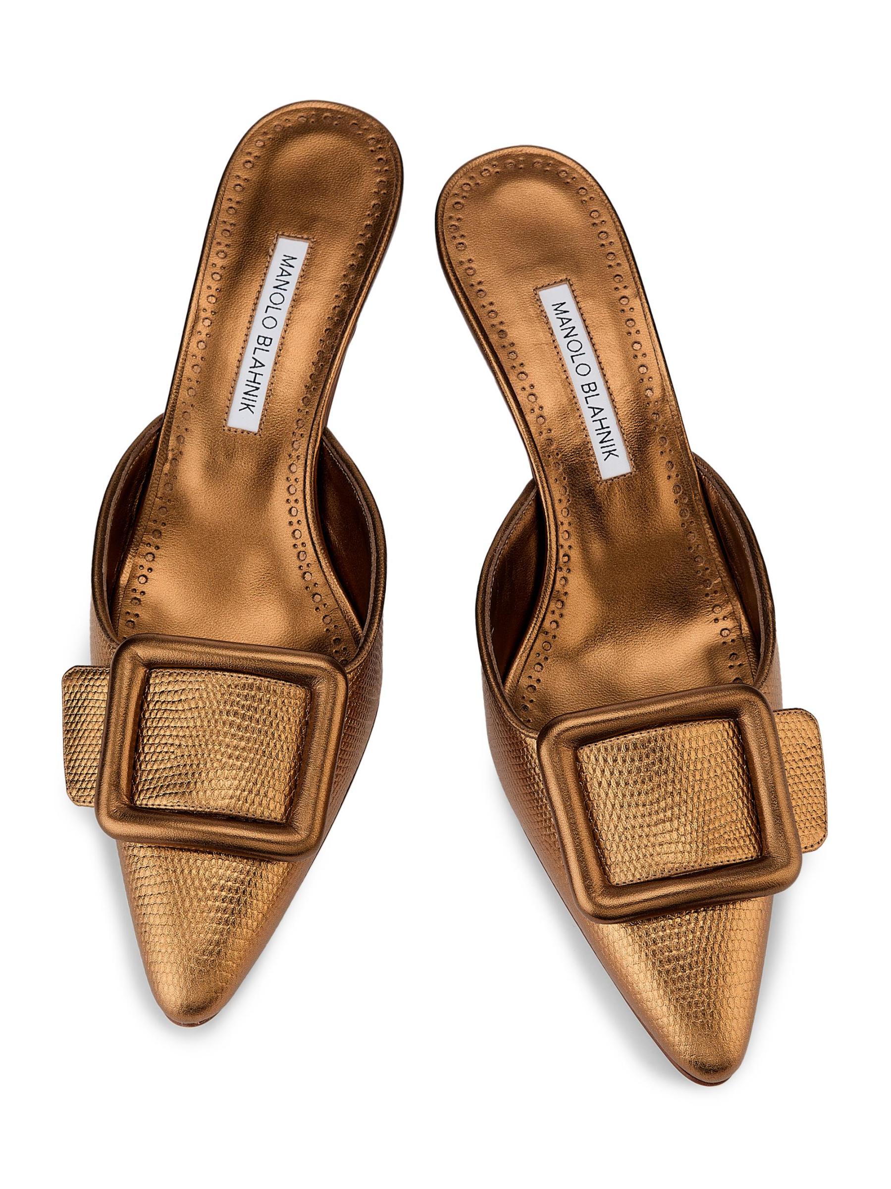 صُنعت بغال Maysalebi من Manolo Blahnik في إيطاليا من الجلد المعدني المنقوش على شكل ثعبان وتتميز بكعب منحني يبلغ 50 مم.