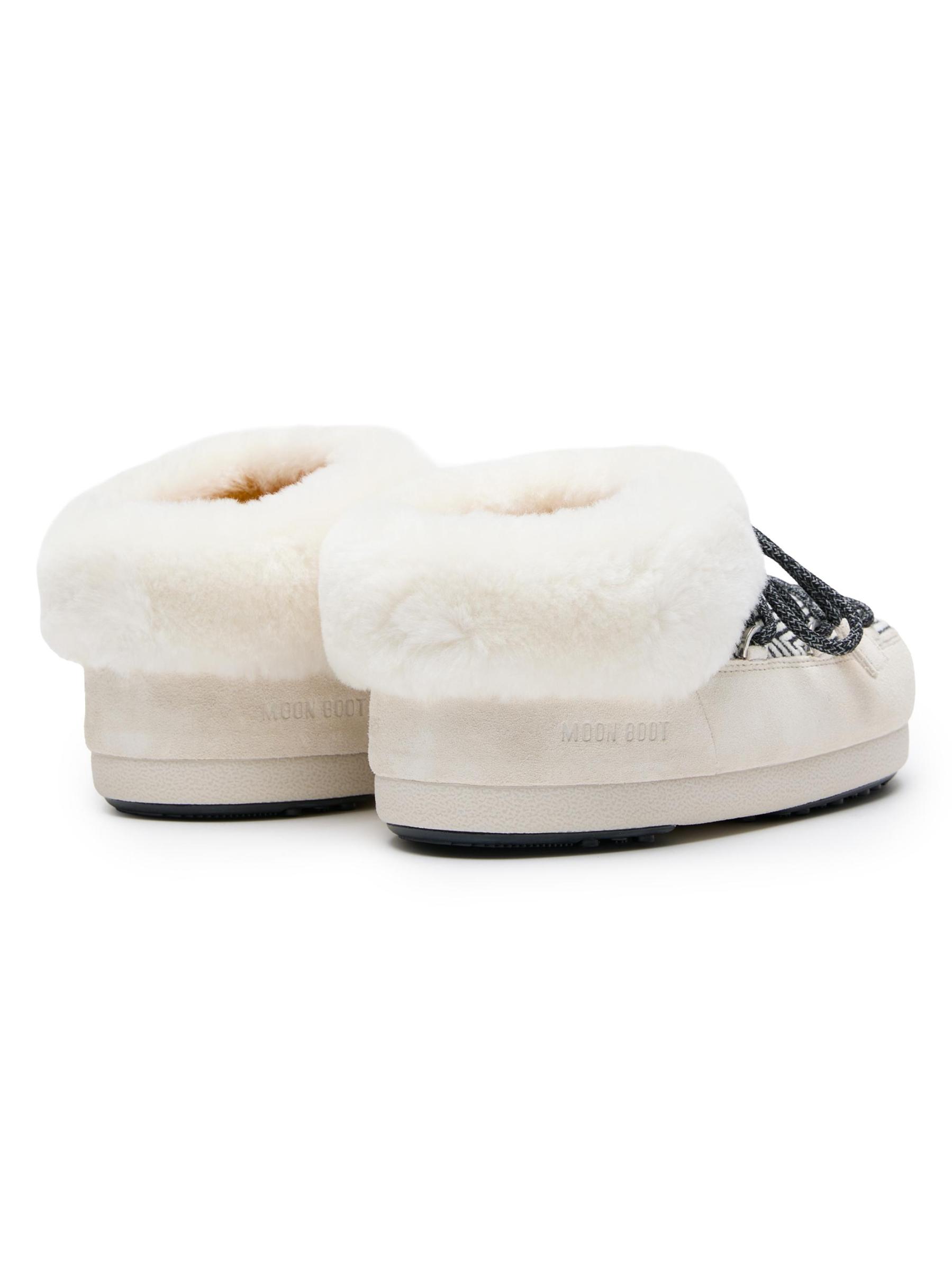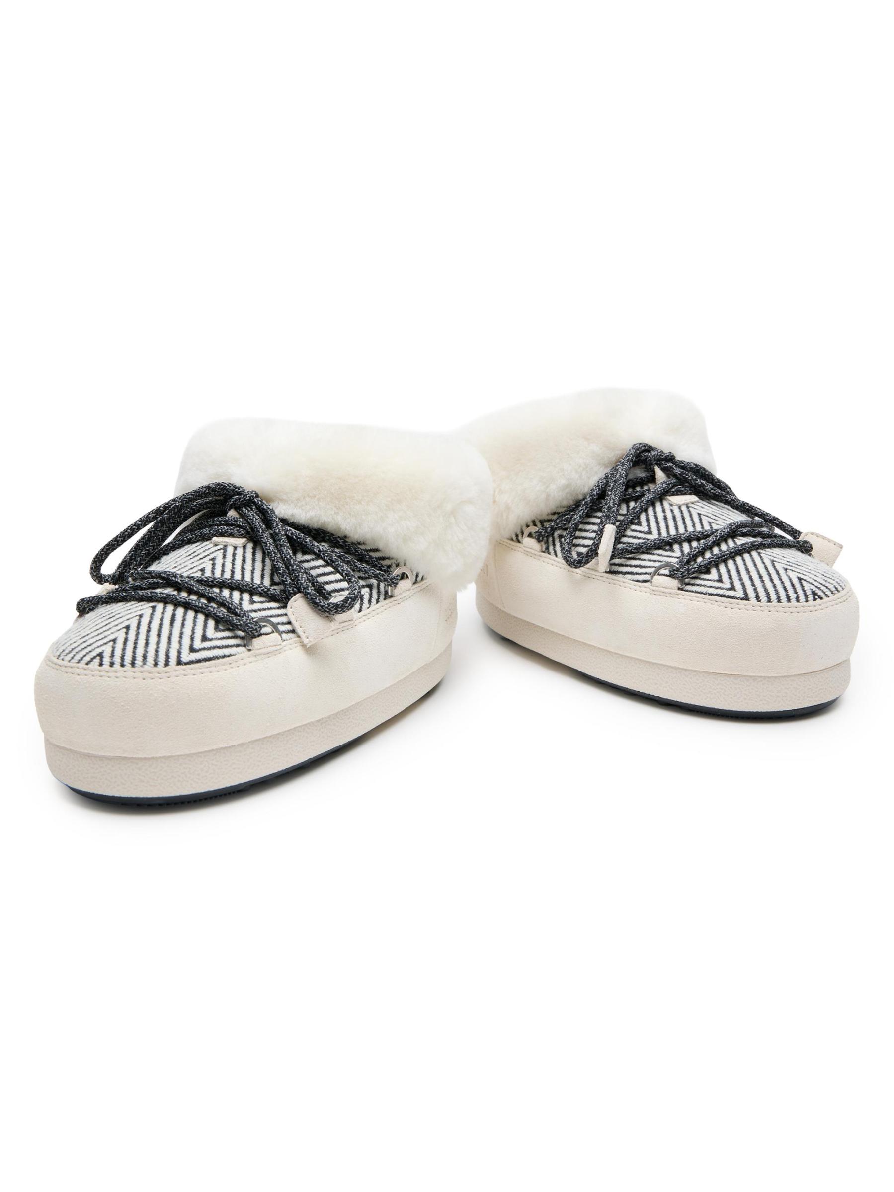 من حذاء القمر × كبسولة ضيف إن ريزيدنس. بطانة من الفرو الصناعي المخملي على بغال EVX Chalet. يتميز هذا التصميم المُصمم بجزء علوي مخطط بنقشة شيفرون بتفاصيل من الجلد المدبوغ بلون متناسق ونعل سميك ومبطن.