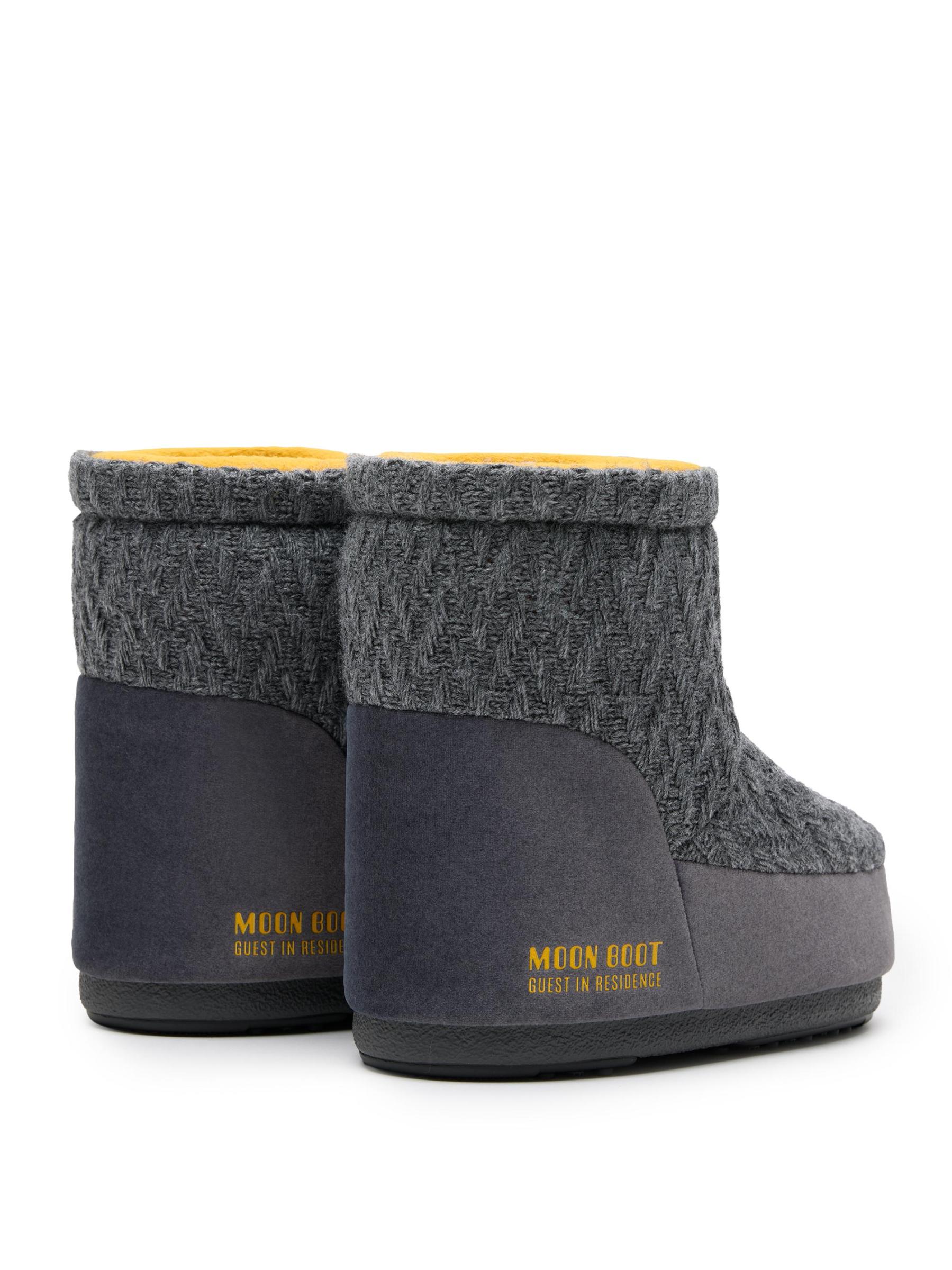 من حذاء القمر × كبسولة ضيف إن ريزيدنس. تتميّز أحذية Moon Boot Icon Low Nolace هذه، المُصممة ببطانة ناعمة من الصوف، بجزء عُلوي محبوك الملمس مع زخرفة من الجلد المدبوغ بلون متناسق ونعل سميك ومبطن.