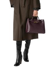 تتميز حقيبة Andiamo متوسطة الحجم من Bottega Veneta بنسج مميز بنمط Intrecciato. يكتمل هذا التصميم ذو المقبض العلوي بحزام يلتف حول الجسم ومزيّن بعقدة باللون الذهبي.