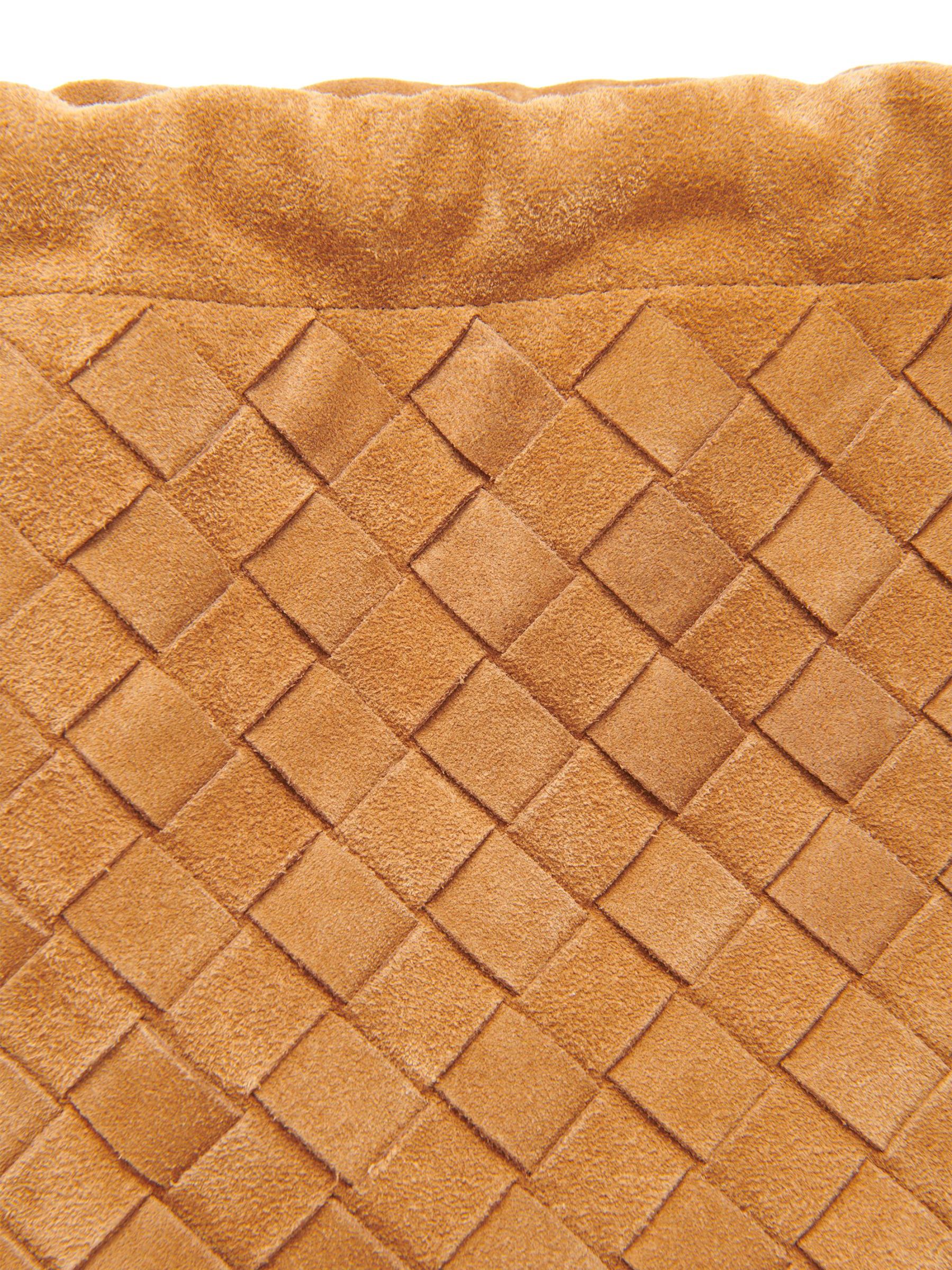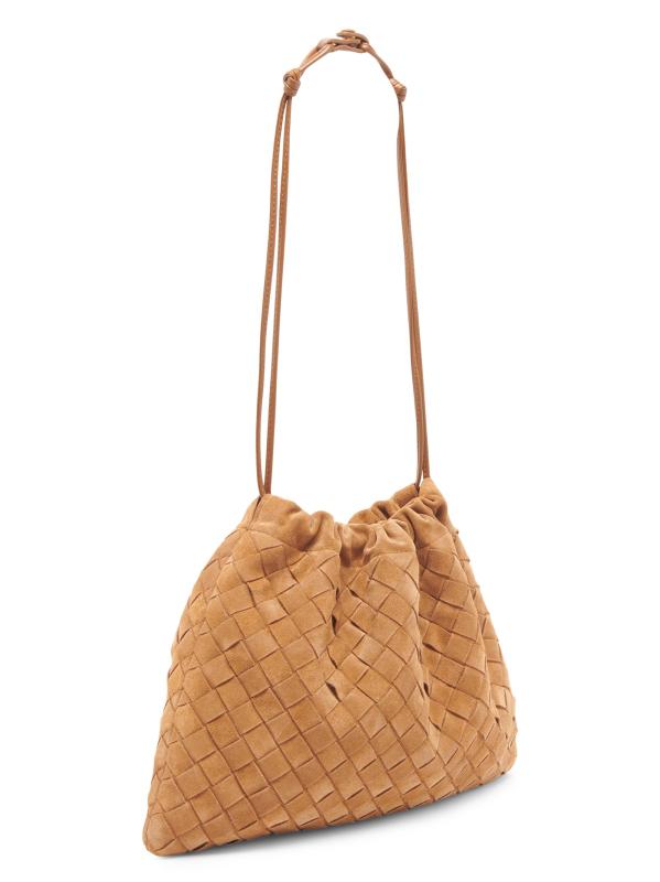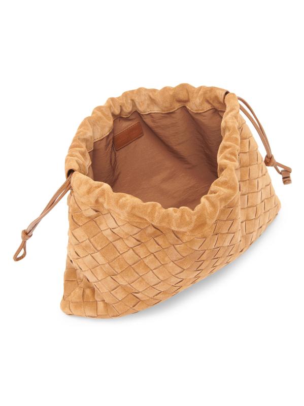 حقيبة Dustbag من Bottega Veneta مصنوعة من الجلد المدبوغ وتتميز بنسيج Intrecciato المميز للدار. تم تصميم هذه الحقيبة برباط للإغلاق وملحق بحلقة جلدية مع زر كبس للحمل على الكتف.
