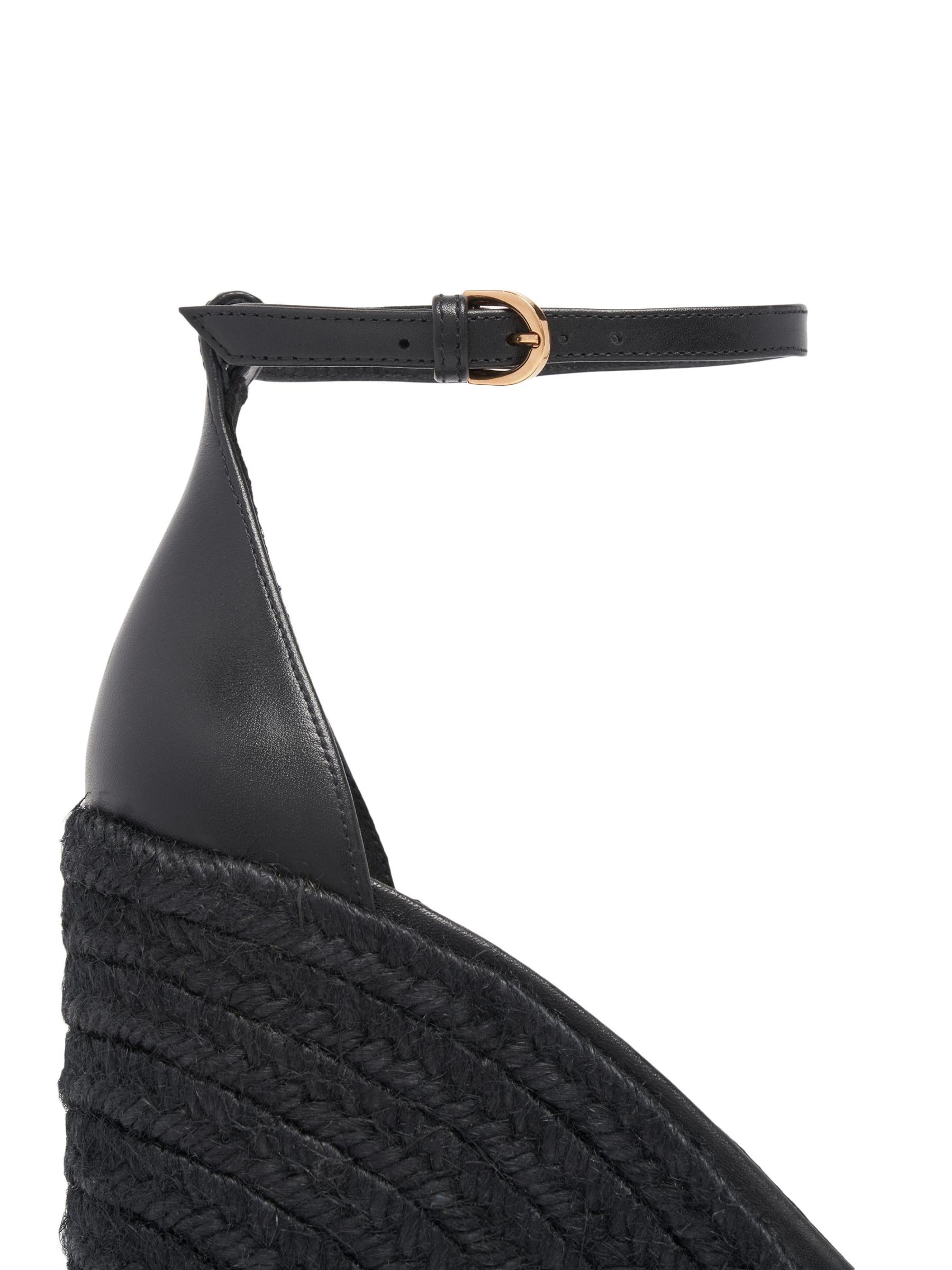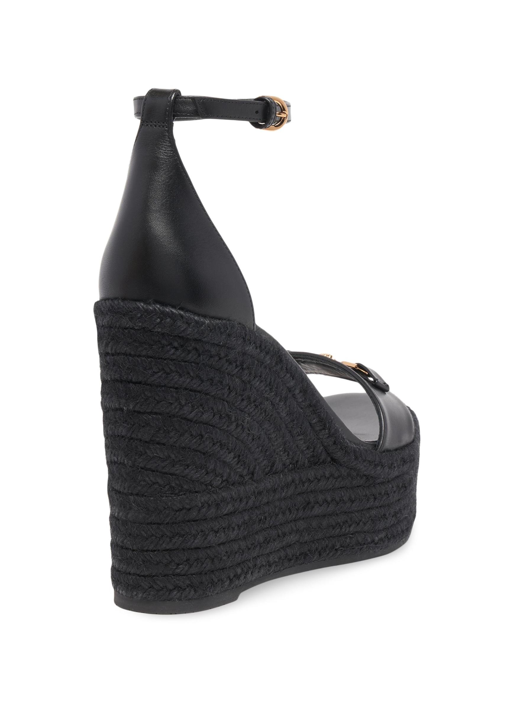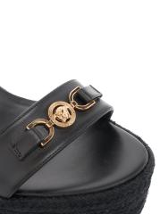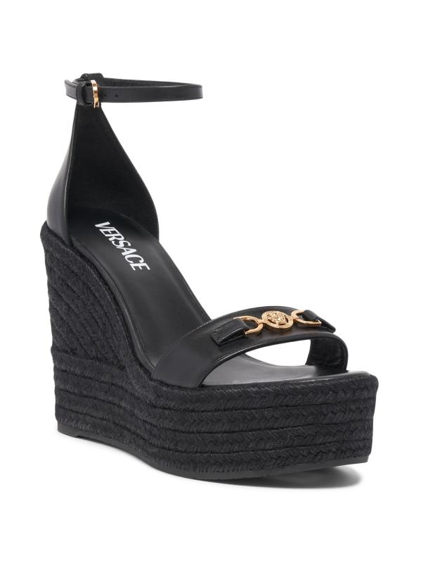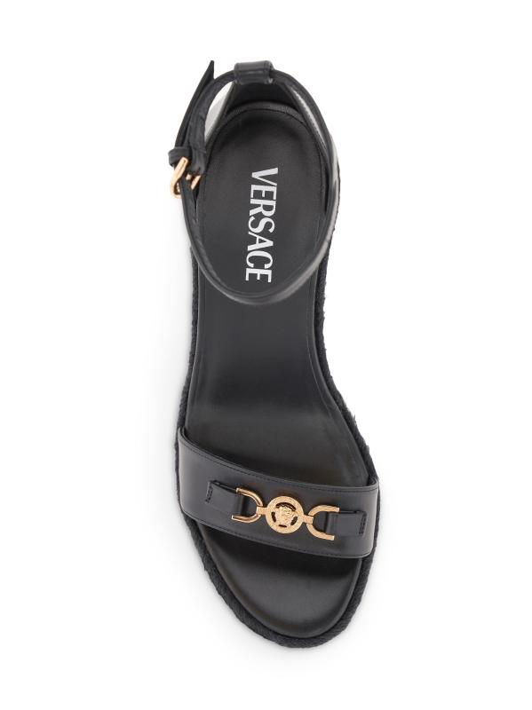 صُنع صندل ميدوسا إسبادريل من فيرساتشي من الجلد، ويتميز بنعل إسفين ملفوف بالجوت وأجزاء معدنية ذهبية مميزة للعلامة التجارية.