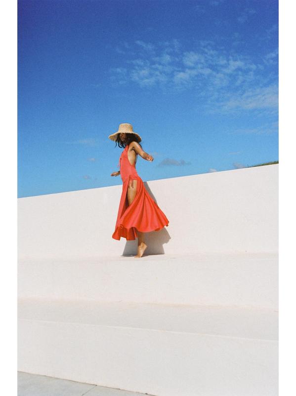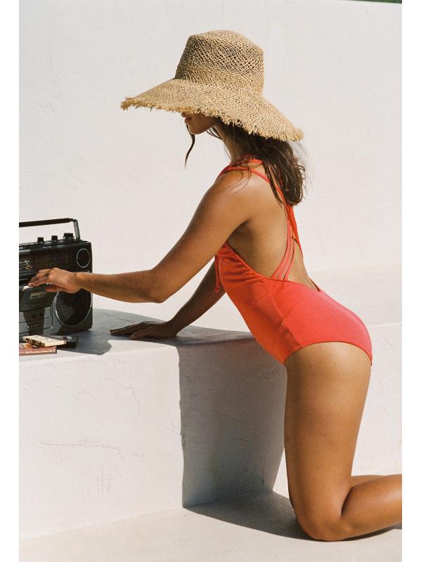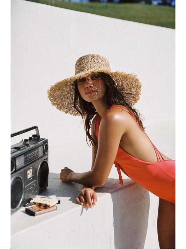 من مجموعة المذكرات. تبرز قبعة Sundowner من Lack of Color تصميم الرافيا المنسوج يدويًا والمزيّن بحاشية مهترئة.