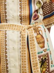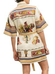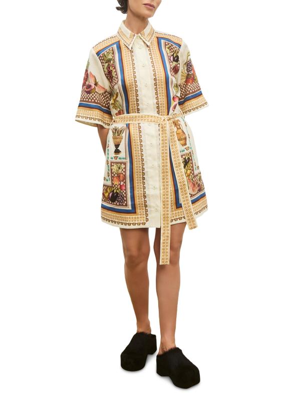 صُمم فستان Mercado الصغير من Alémais بطبعة نابضة بالحياة من الفواكه والخضروات، ويتميز بتنورة على شكل حرف A مع ربطة عنق لتشكيل الخصر.