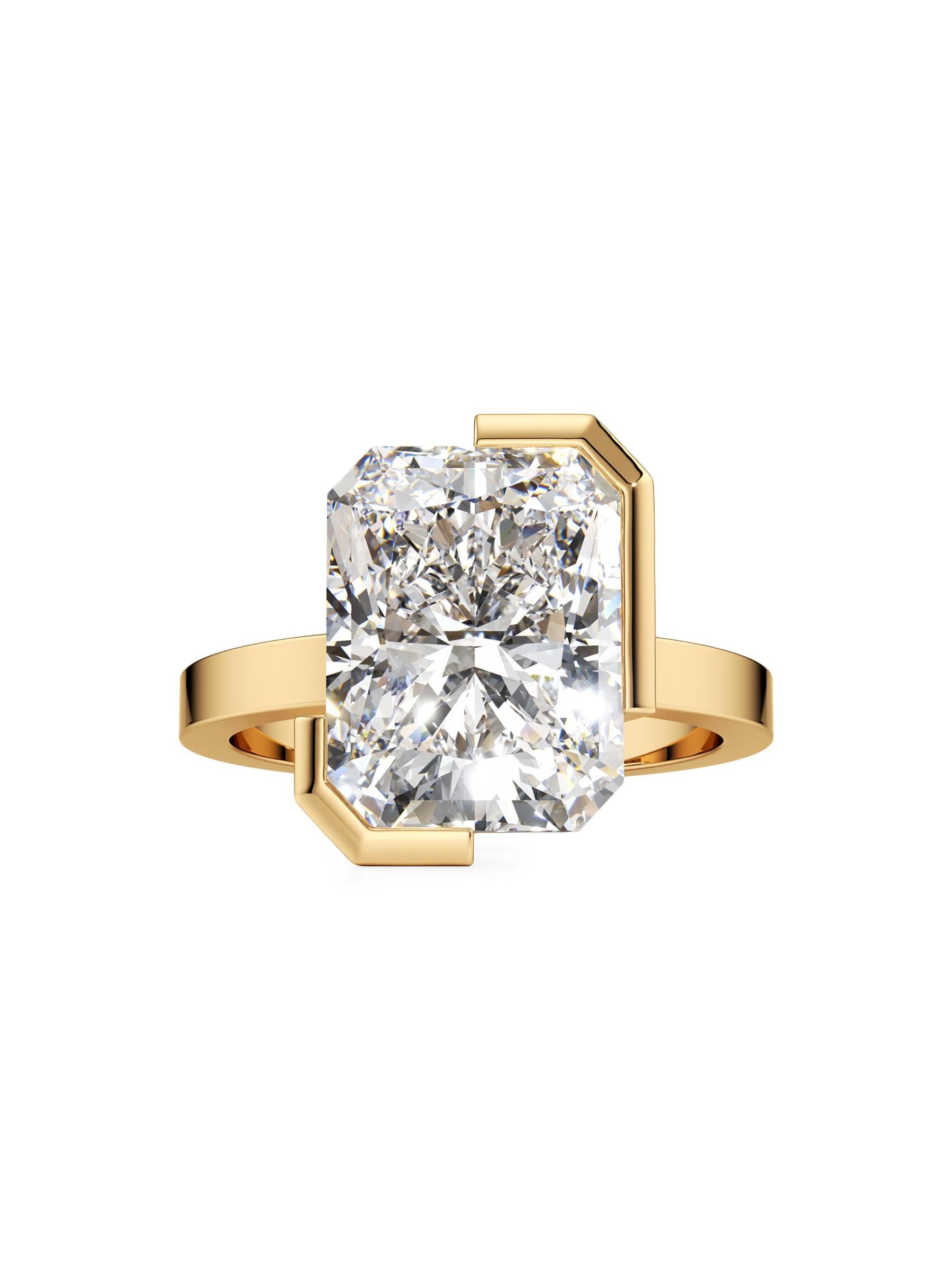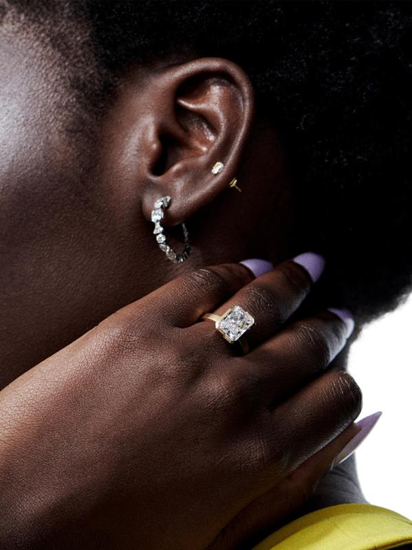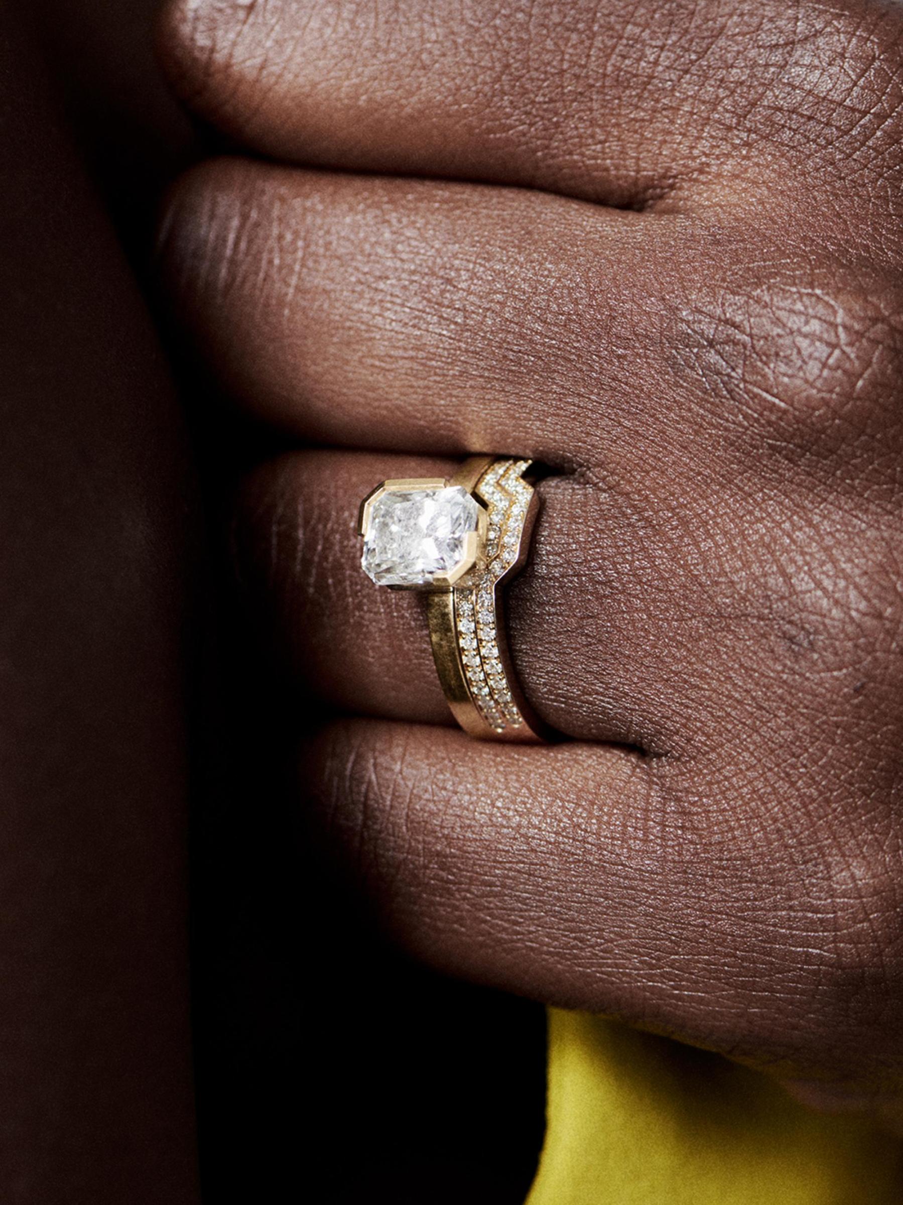 من مجموعة Meta. يتمركز خاتم سوليتير من شركة Unsaid، الذي يتميز بتصميم غير متماثل وحزام مربع من الذهب الأصفر عيار 18 قيراطًا، وهو عبارة عن ألماس مذهل تم إنتاجه في المختبر.
