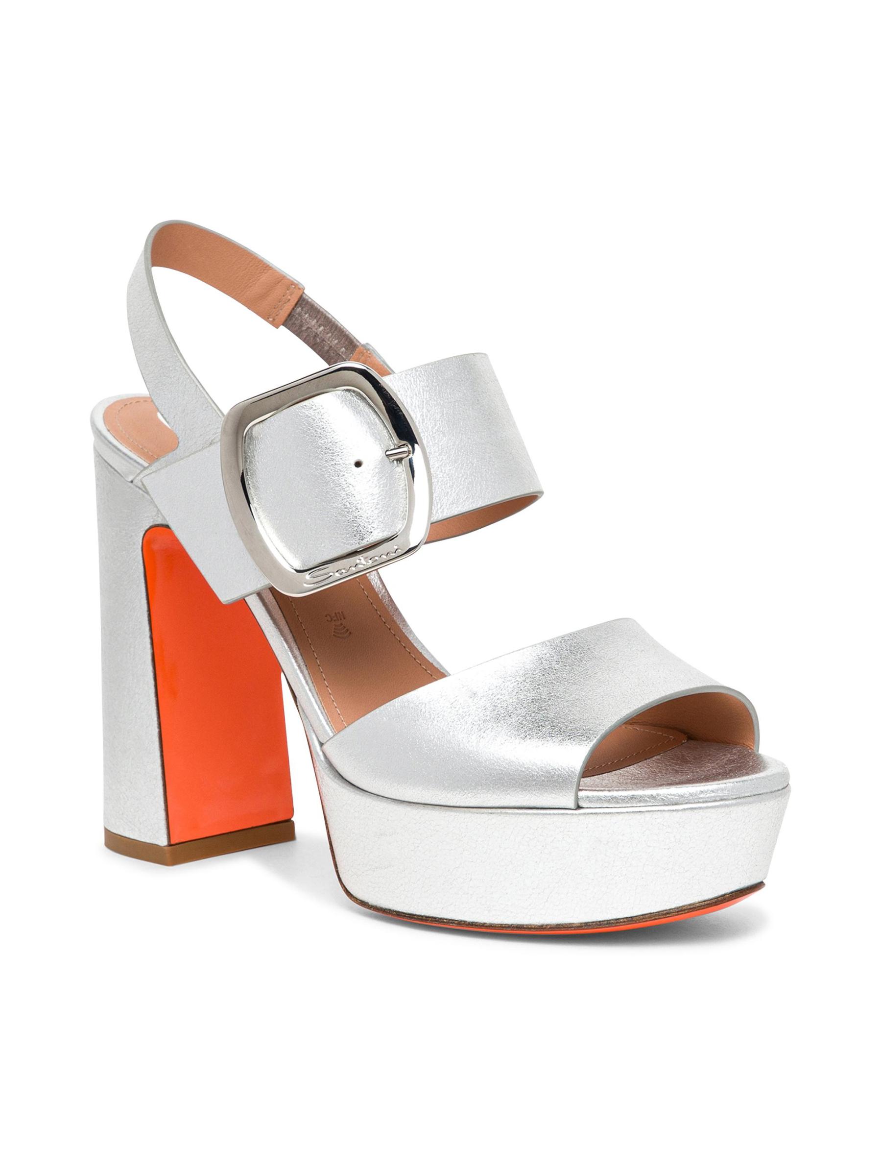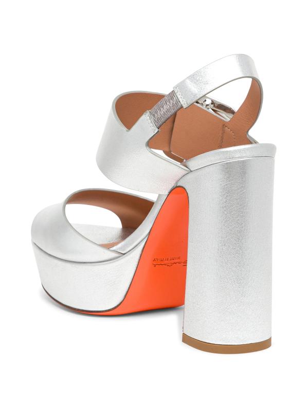 صُنع هذا الصندل من سانتوني في إيطاليا من الجلد المعدني فوق كعب سميك طويل.