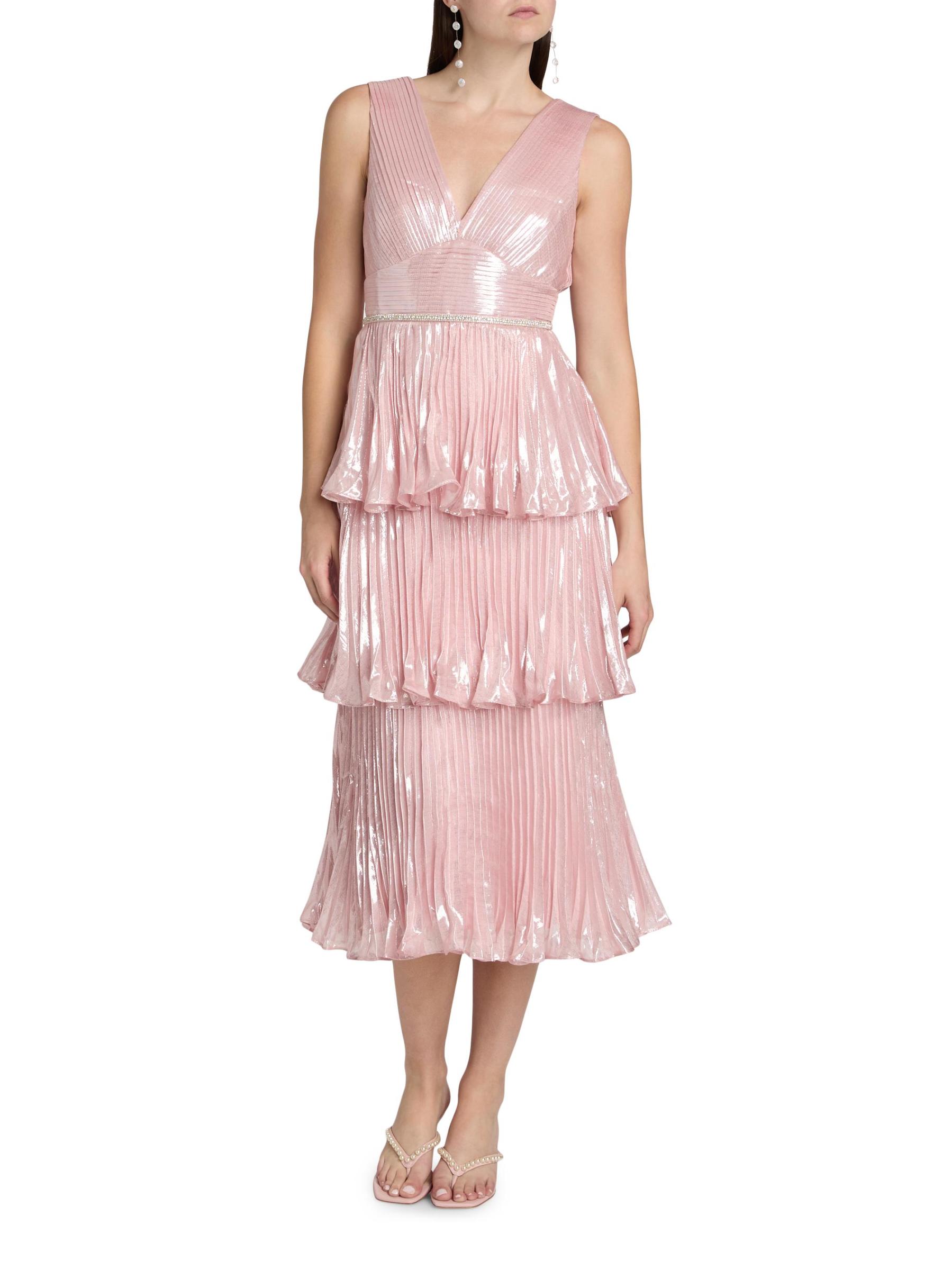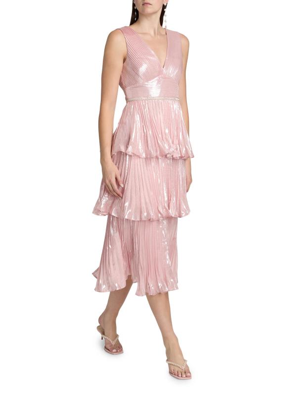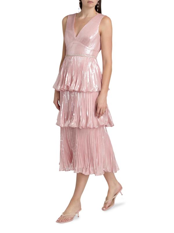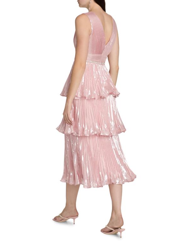 يتميز هذا الفستان المتوسط المتدرج المصمم من Self-Portrait المصنوع من الشيفون المعدني بتفاصيل طيات في جميع الأنحاء. تم تصميم هذا التصميم بلا أكمام برقبة عميقة على شكل حرف V وحافة واسعة.رقبة على شكل حرف V بدون أكمام إغلاق بسحّاب خلفي مخفي 68% حرير/ 32% ألياف معدنية البطانة: 100% بوليستر تنظيف جاف مستوردة