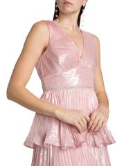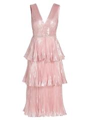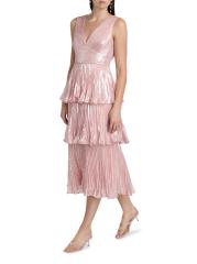 يتميز هذا الفستان المتوسط المتدرج المصمم من Self-Portrait المصنوع من الشيفون المعدني بتفاصيل طيات في جميع الأنحاء. تم تصميم هذا التصميم بلا أكمام برقبة عميقة على شكل حرف V وحافة واسعة.
