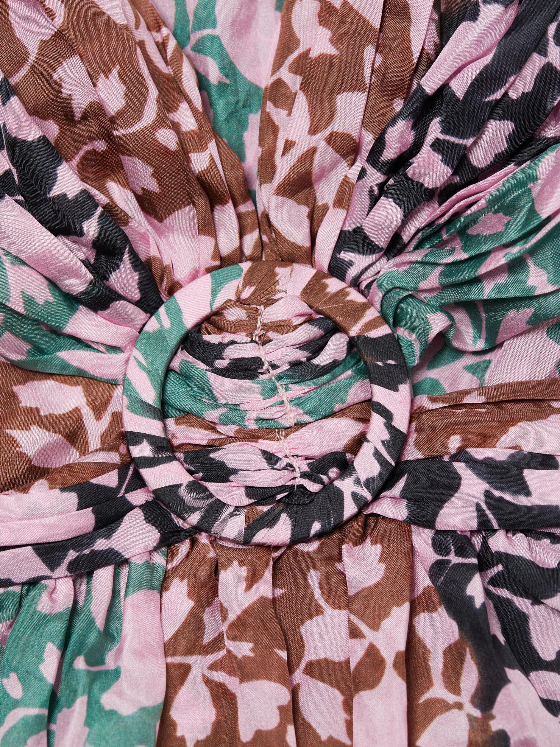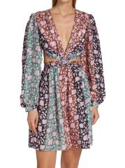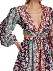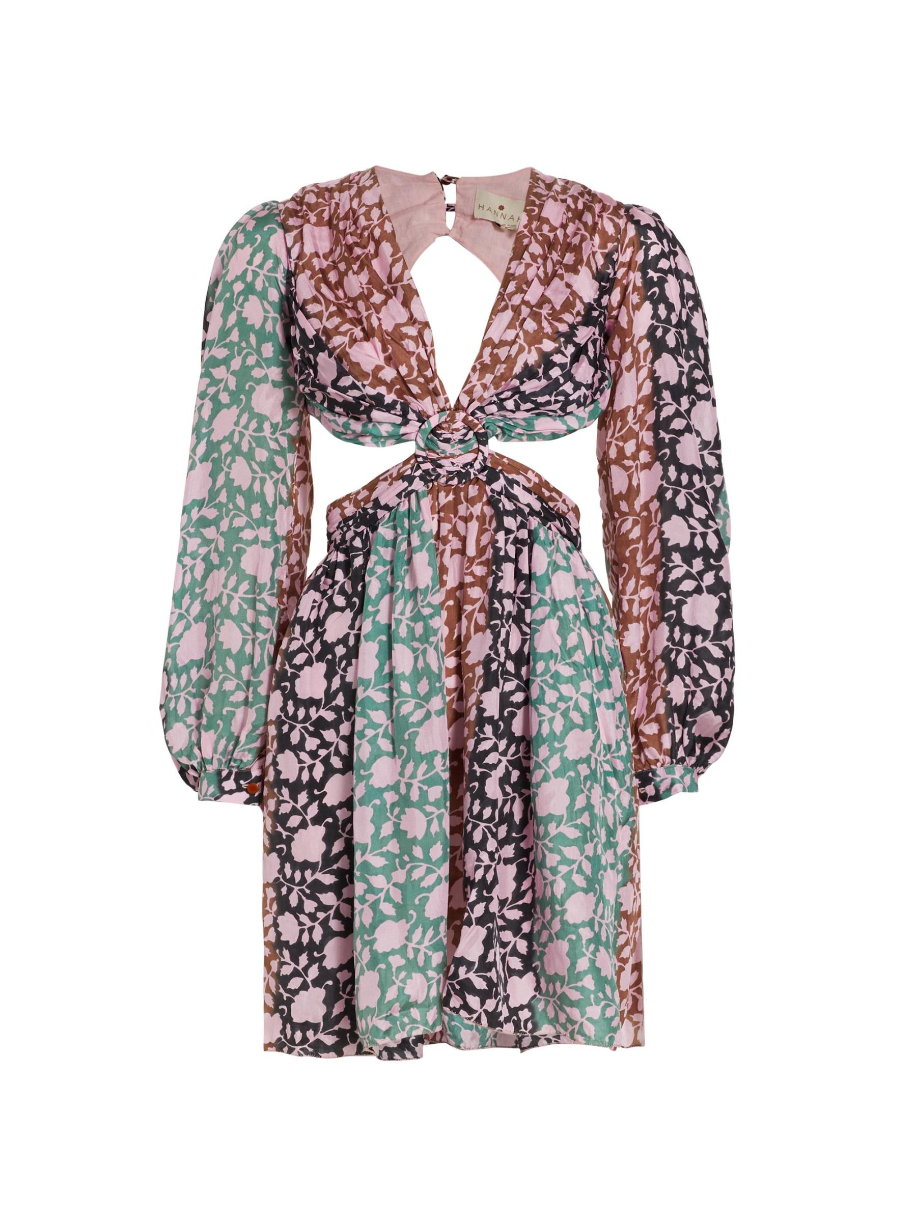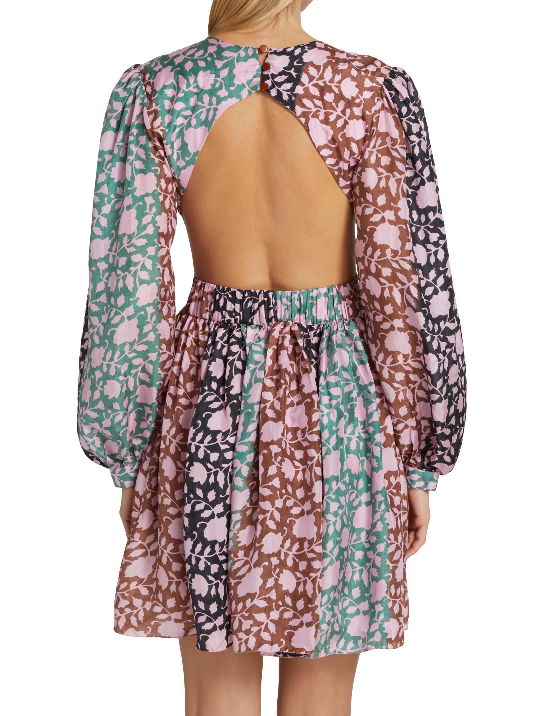 يتميّز فستان Mia الصغير من Hannah Artwear المصنوع من الحرير المطبوع يدويًا بصدّار مكشكش بثنيات وتفاصيل على شكل حرف O. يتميز هذا النمط البوهيمي بأكمام طويلة وفتحة ظهر مفتوحة.