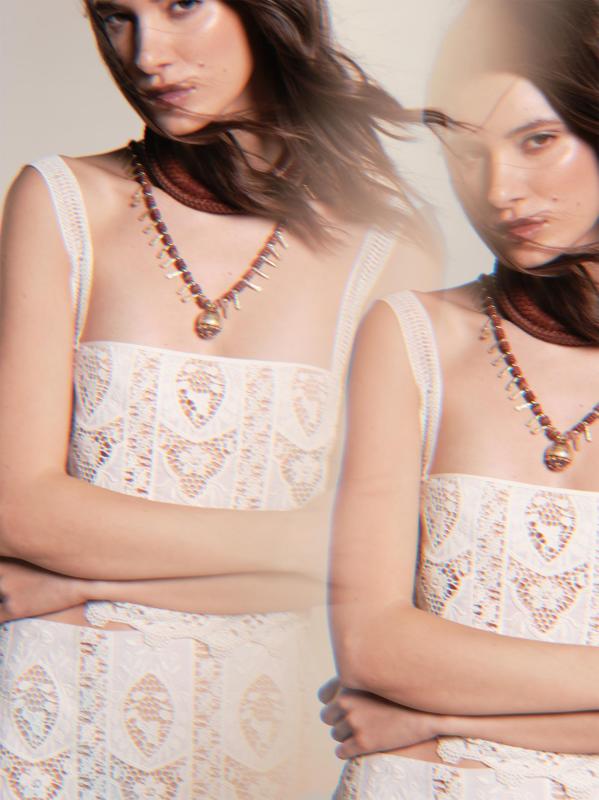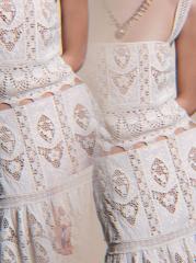 من مجموعة ميكايلا. تتميّز تنورة «هايلد فيلدز» الطويلة من جوهانا أورتيز بتطريز وتصاميم بحافة صدفيّة.