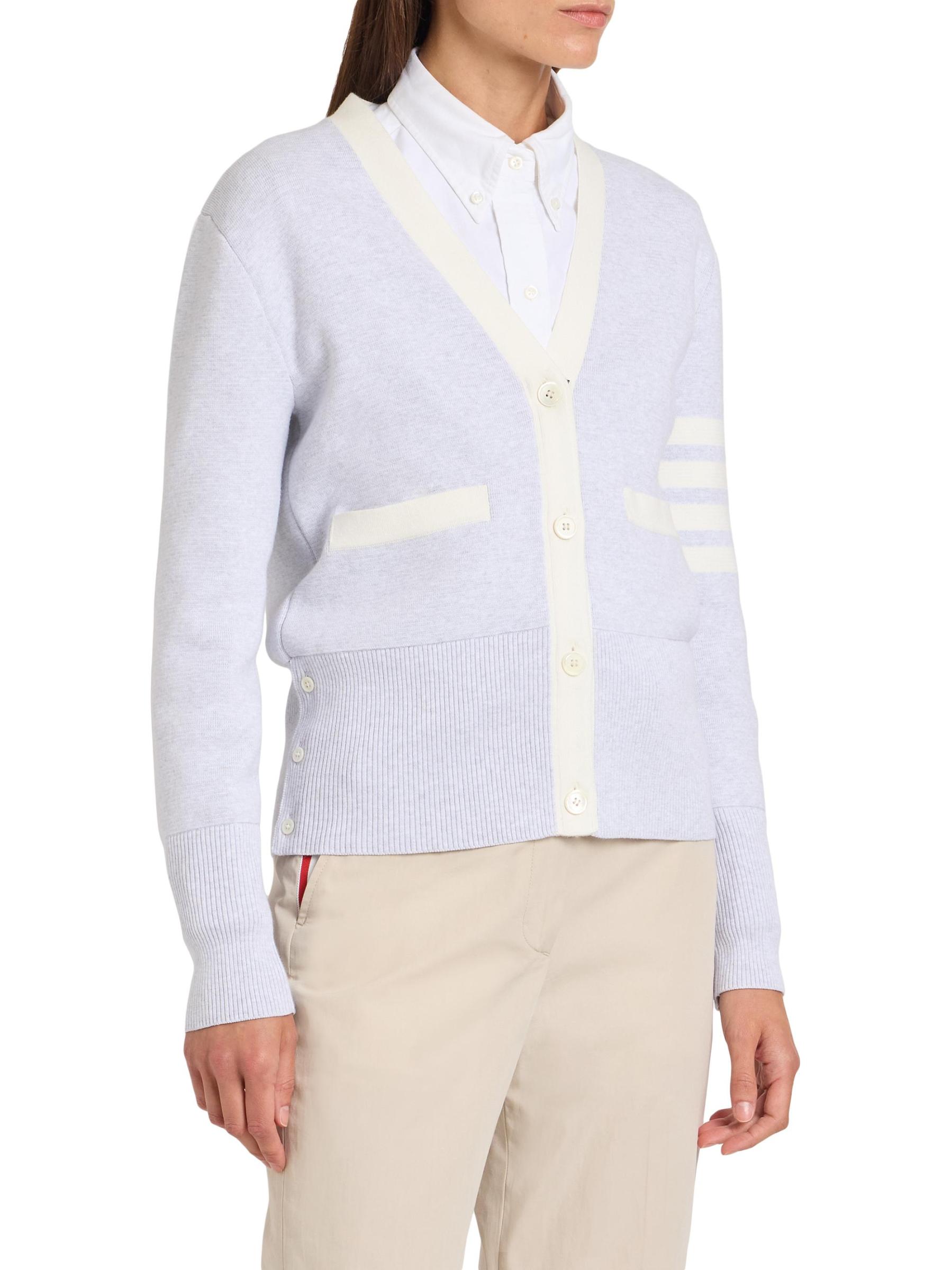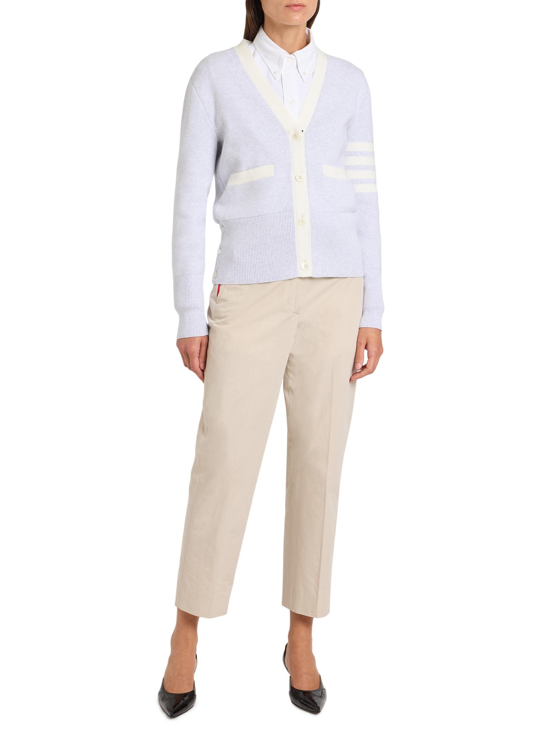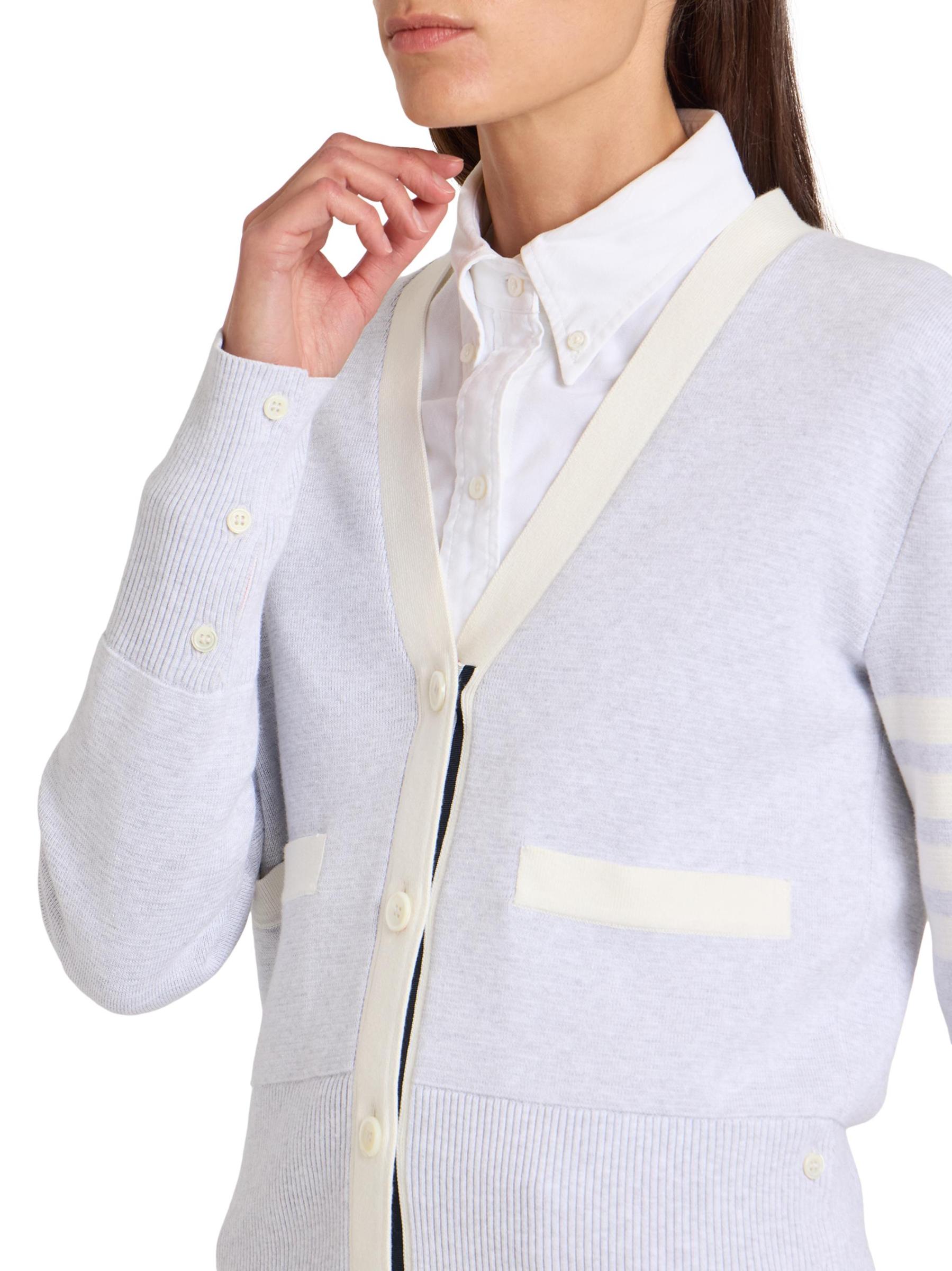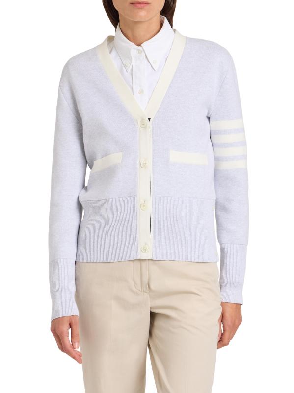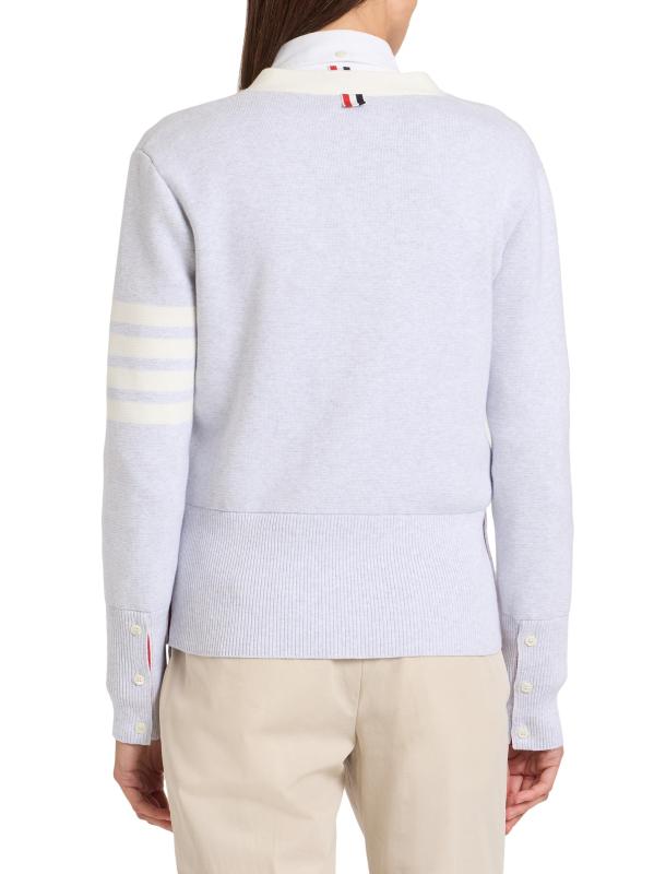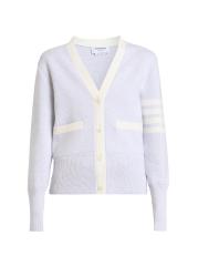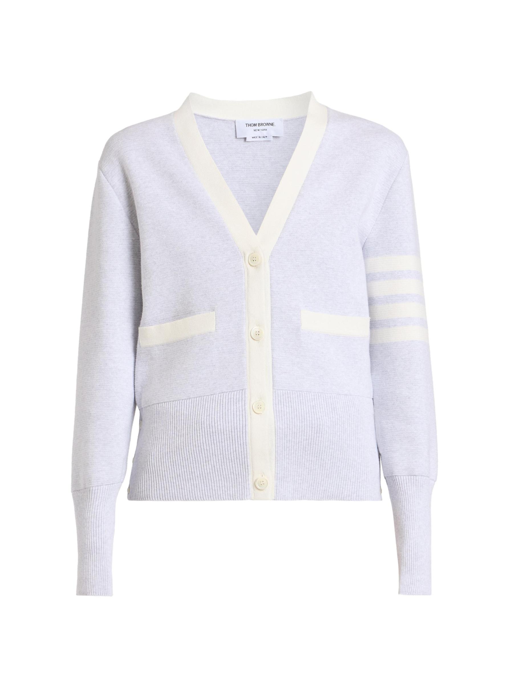 تم تصميم كارديجان ميلانو كلاسيك هذا من توم براون من القطن مع شريط العلامة الشهير المكون من 4 أشرطة على الأكمام اليسرى. تتميّز هذه القطعة برقبة على شكل حرف V وحاشية محبوكة على شكل أضلاع.