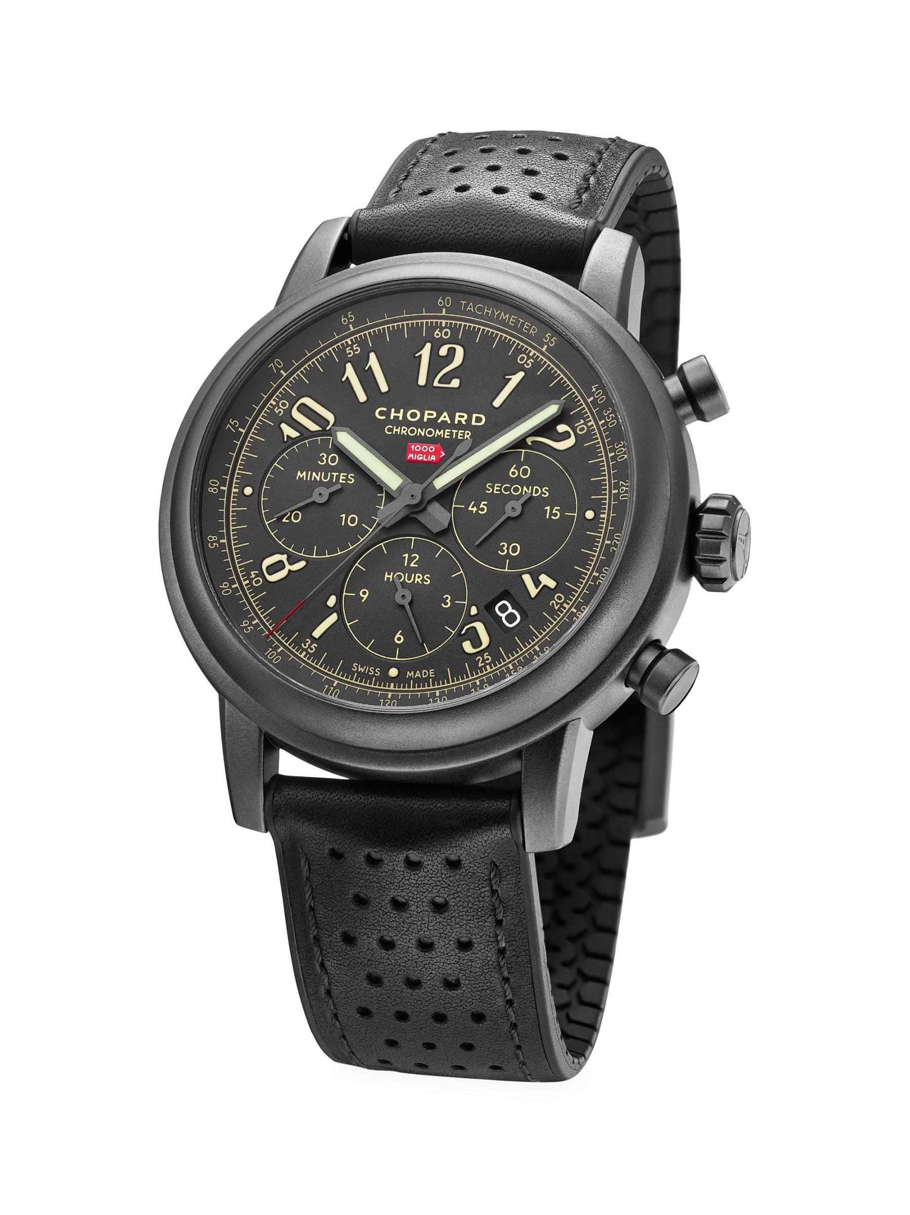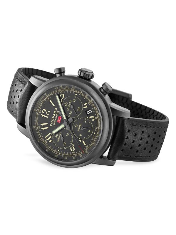 من مجموعة ميل ميليا. تتميز هذه الساعة الأنيقة، وهي سلسلة ذات إصدار محدود تم إنتاج 1000 قطعة منها فقط، بجاذبية رياضية تذكرنا بالسيارات القديمة. تأتي الساعة في علبة من الفولاذ المقاوم للصدأ مزودة بحركة كرونوغراف ذاتية التعبئة حاصلة على شهادة COSC، وتتميز باحتياطي طاقة لمدة 42 ساعة مع شاشة مركزية للساعات والدقائق والثواني والتاريخ، مع الدقة والأناقة التي تتميز بها شوبارد.