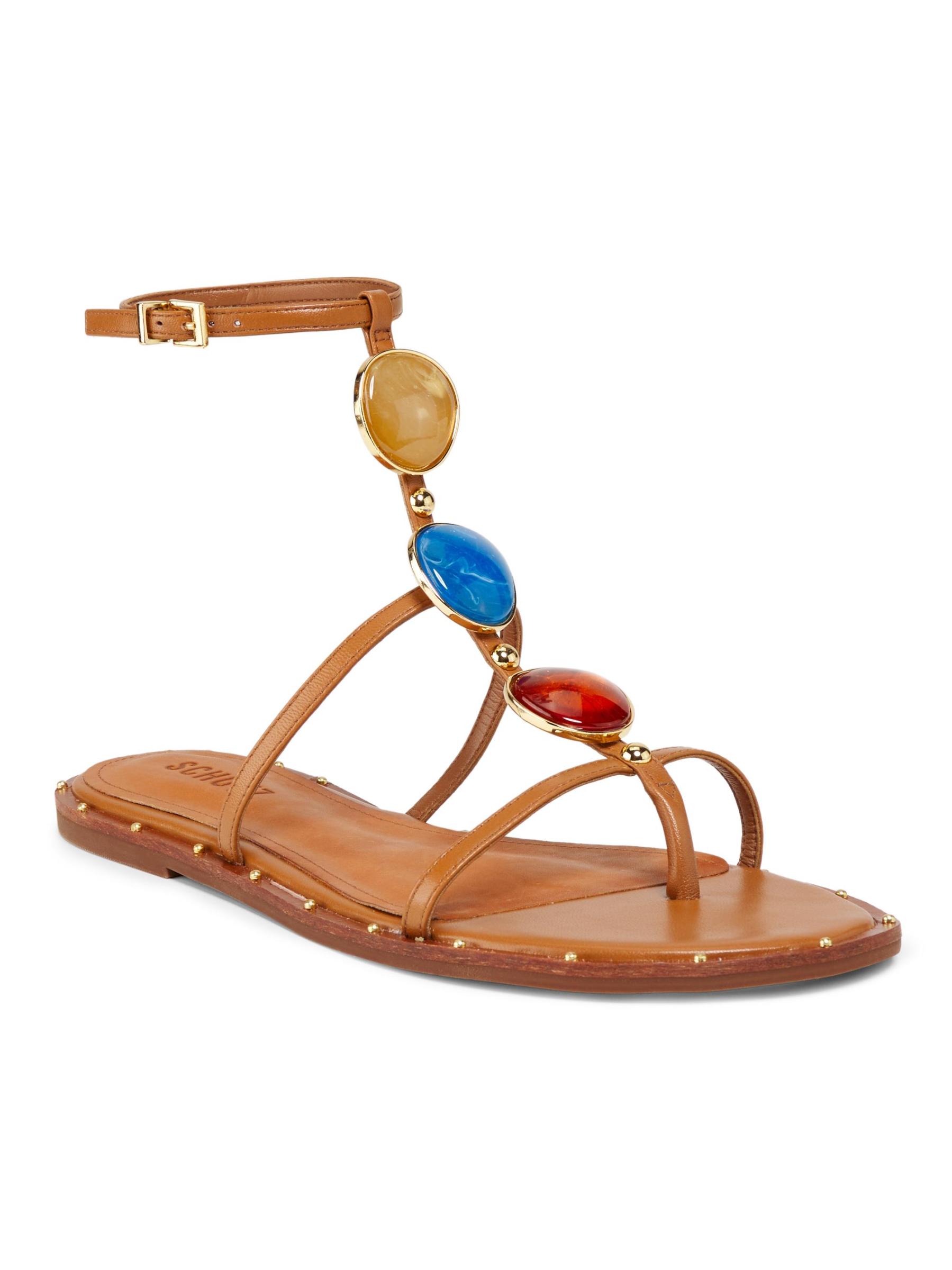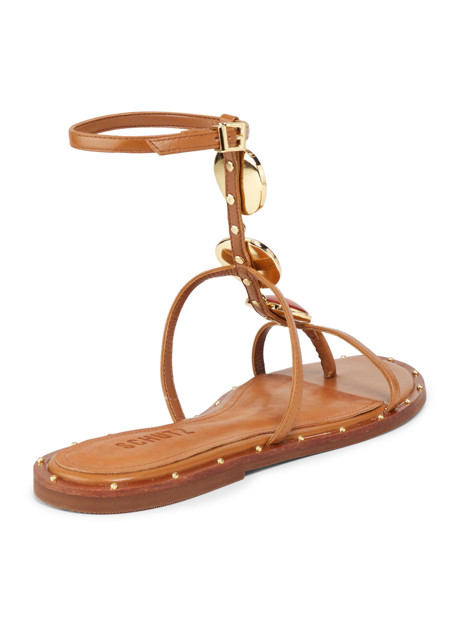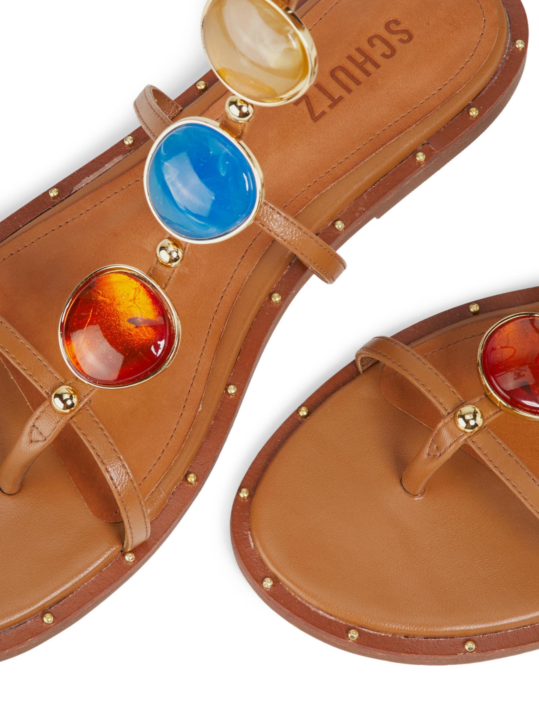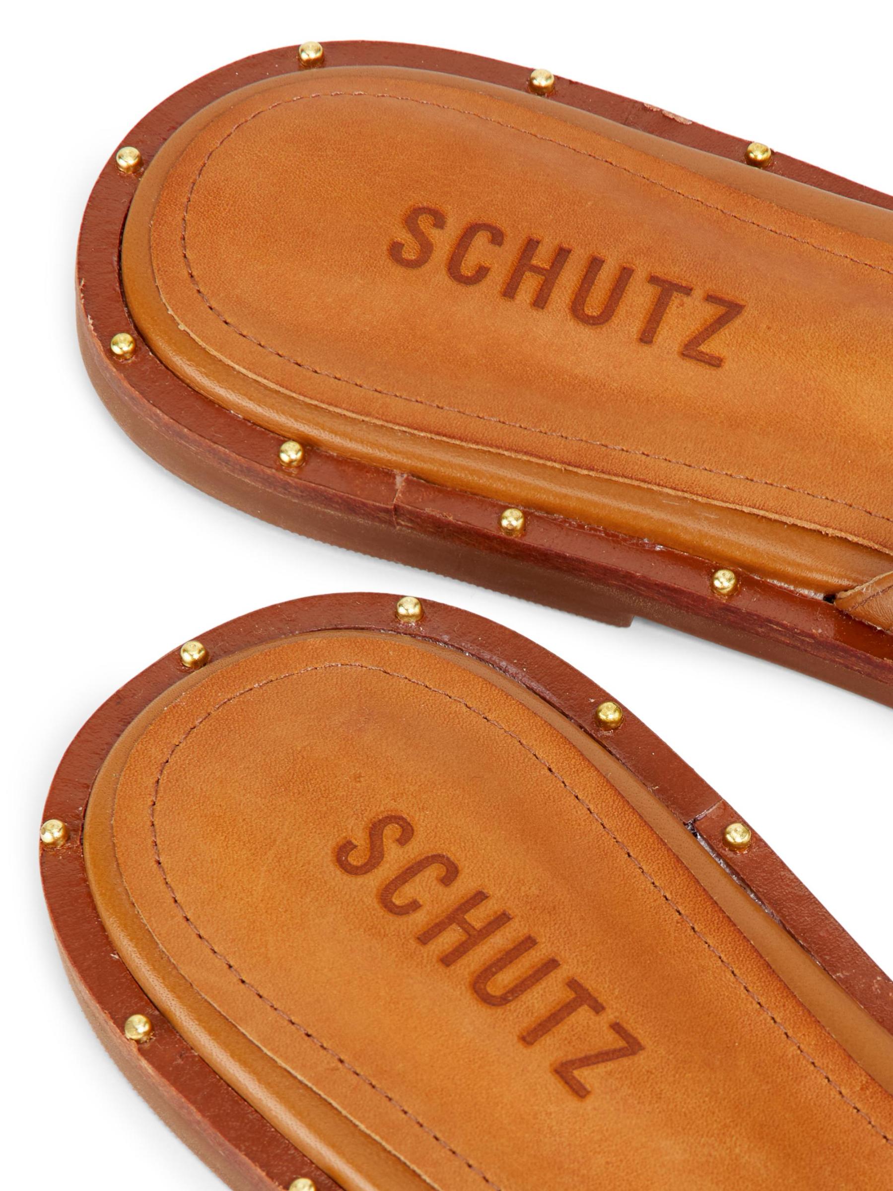 صُنع صندل Milos المسطح هذا من Schutz من الجلد، ويتميز بزخارف كريستالية على طول الحزام على شكل حرف T ولمسات مطرزة في جميع الأنحاء.