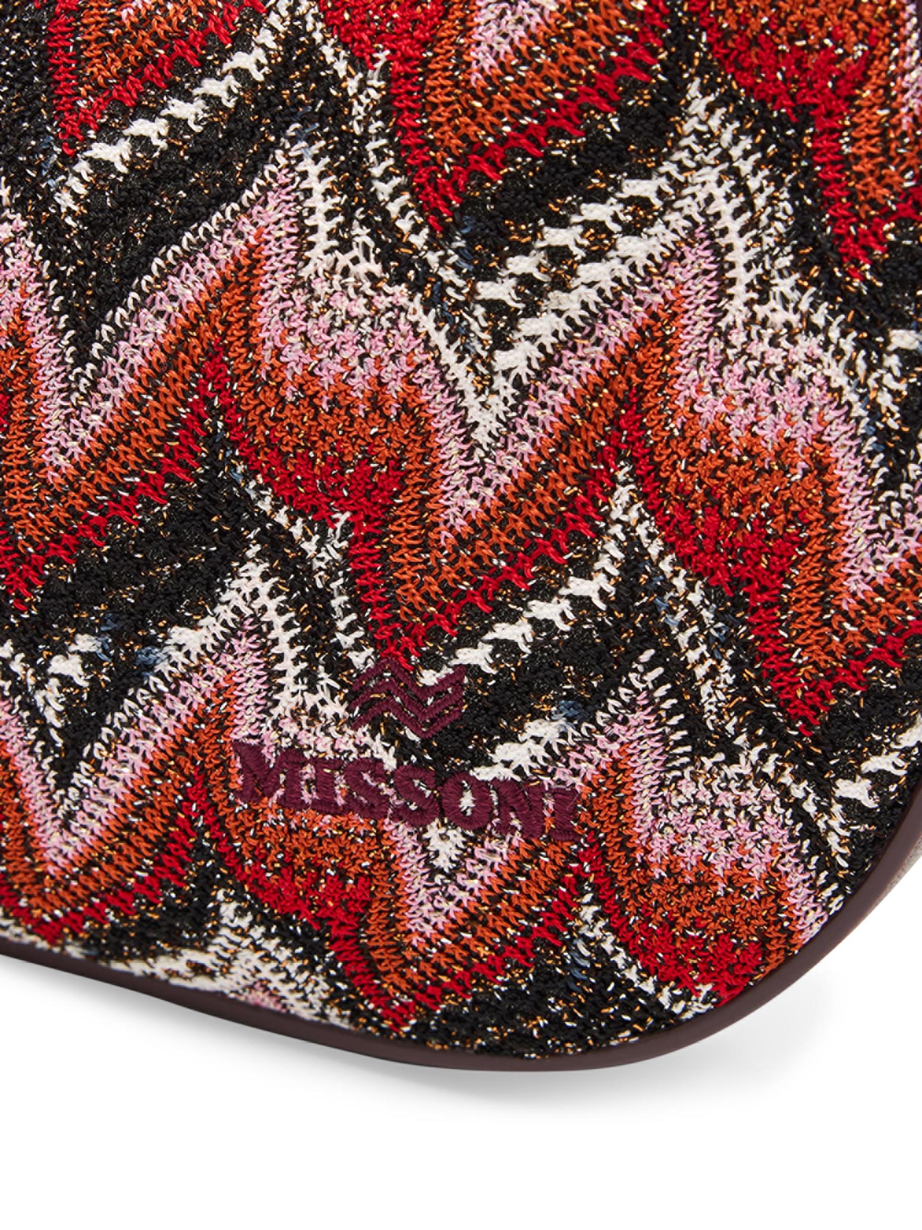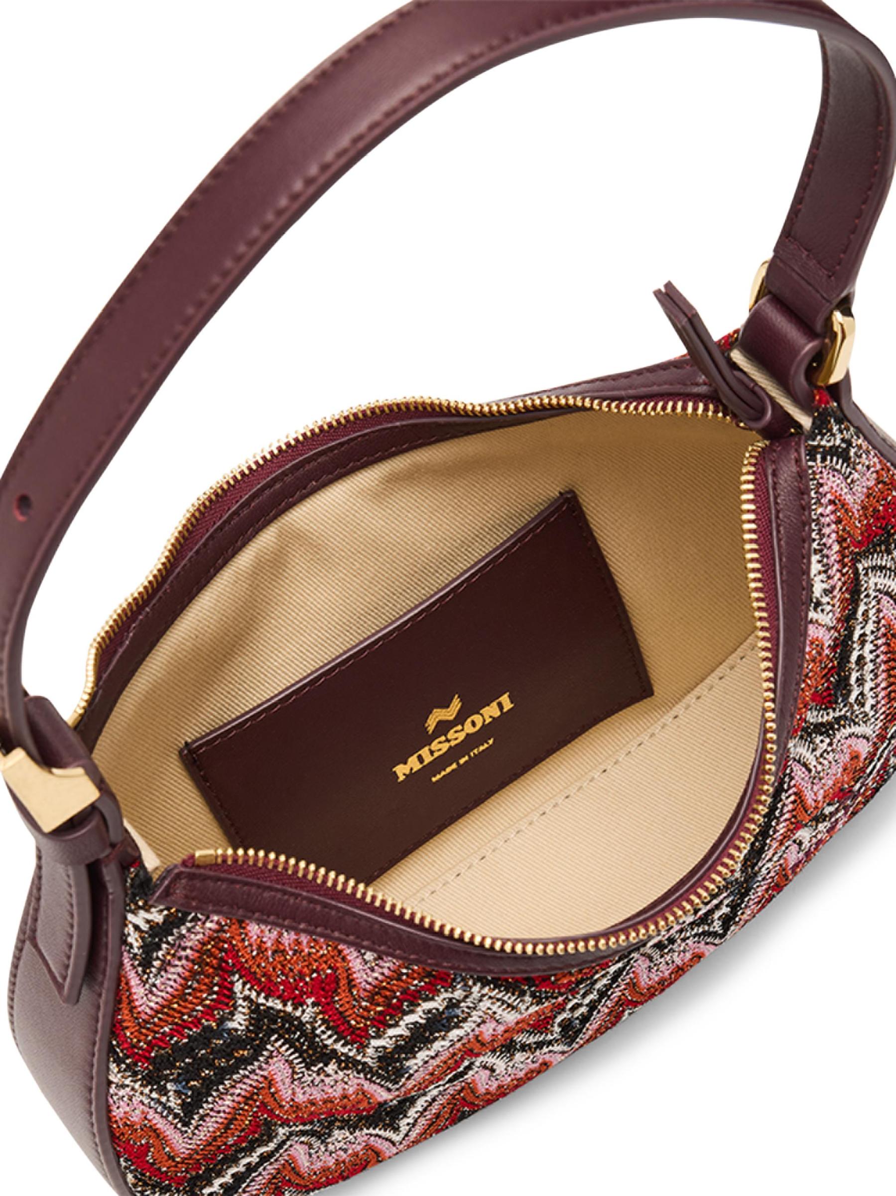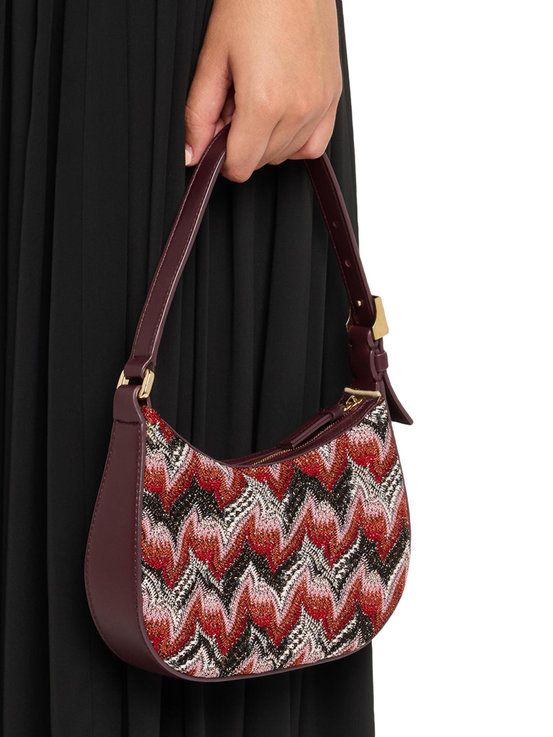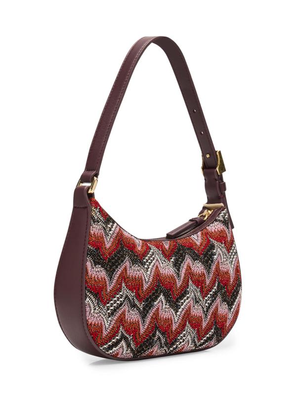 حقيبة هوبو الصغيرة هذه من ميسوني مصنوعة من الجلد وتتميز بنمط شيفرون راشيل الخاص بالعلامة التجارية، والذي يتلألأ بخيوط معدنية.