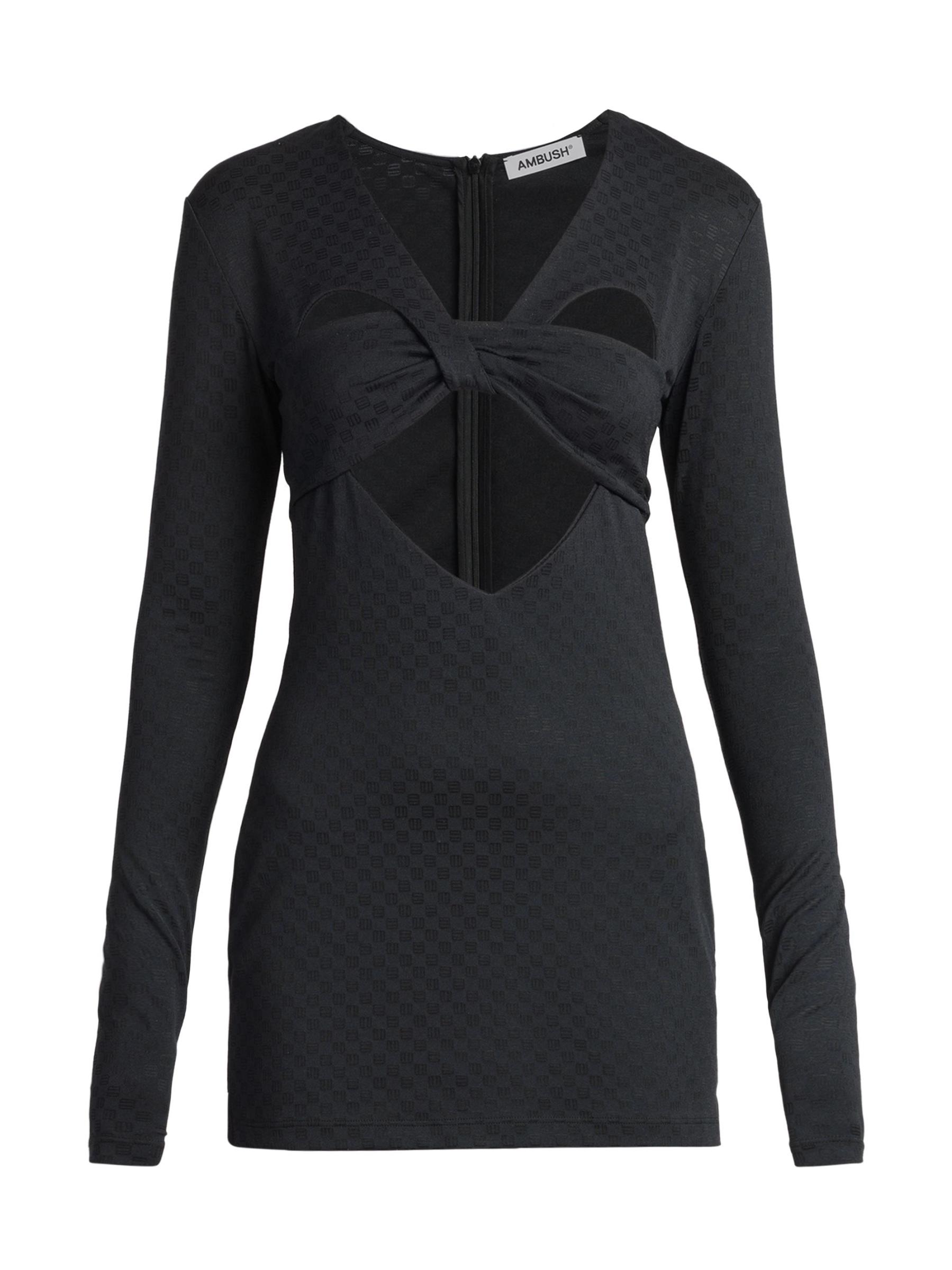 يُزين هذا الفستان الصغير الأنيق من Ambush بنقشة المونوغرام الصغيرة، ويناسب هذا الشكل. يتميز هذا الطراز بفتحة كبيرة على شكل قلب عند الصدّار، مما يُضفي طابعًا رومانسيًا.
