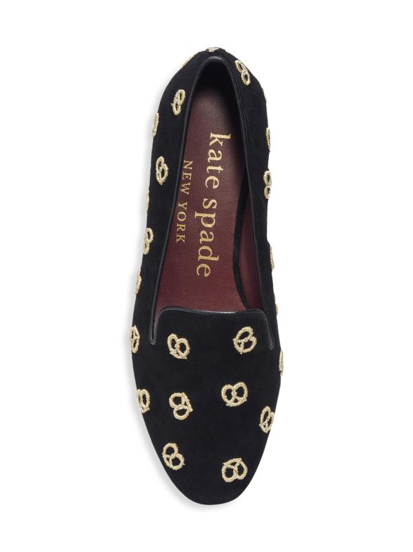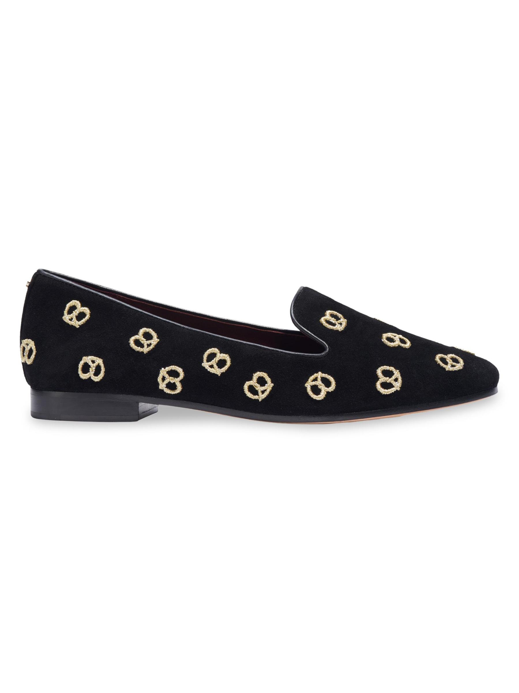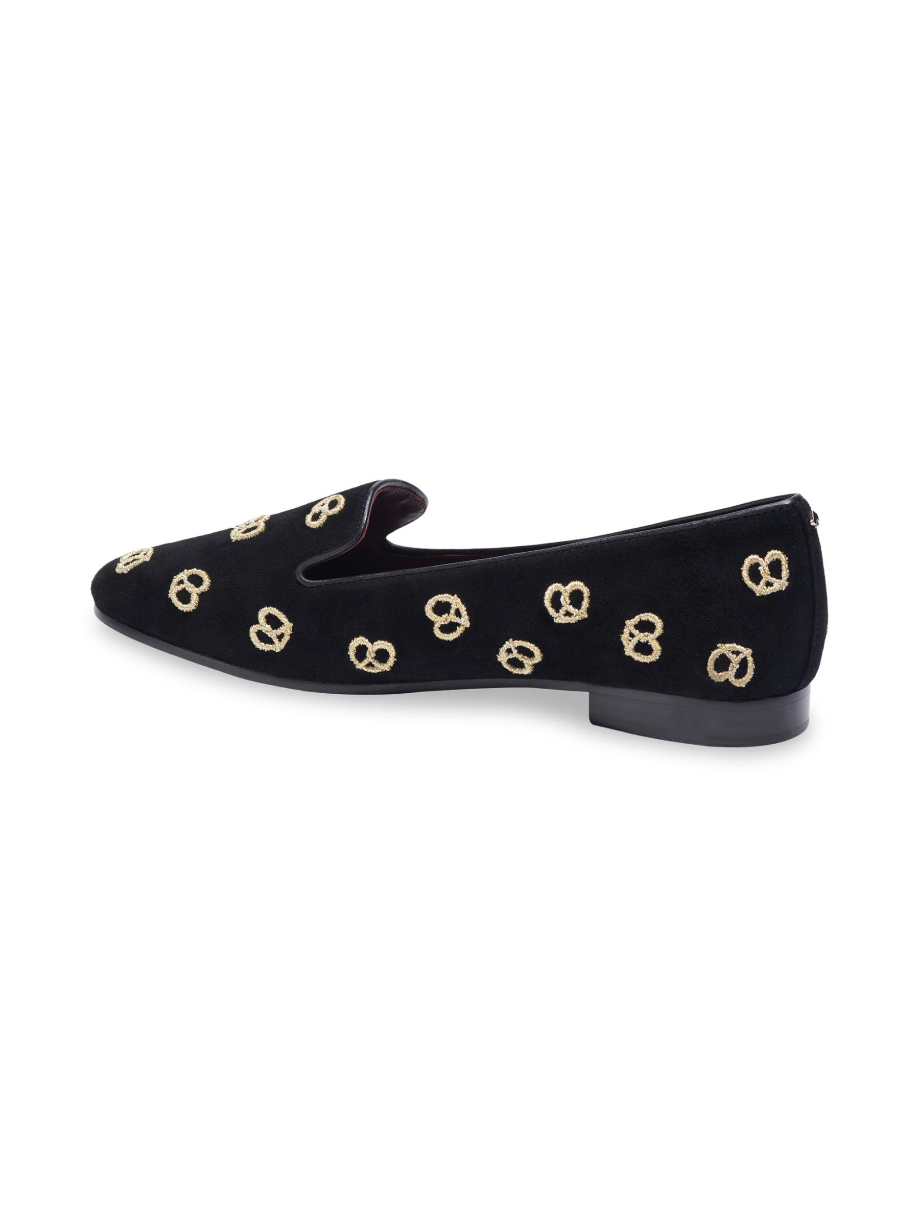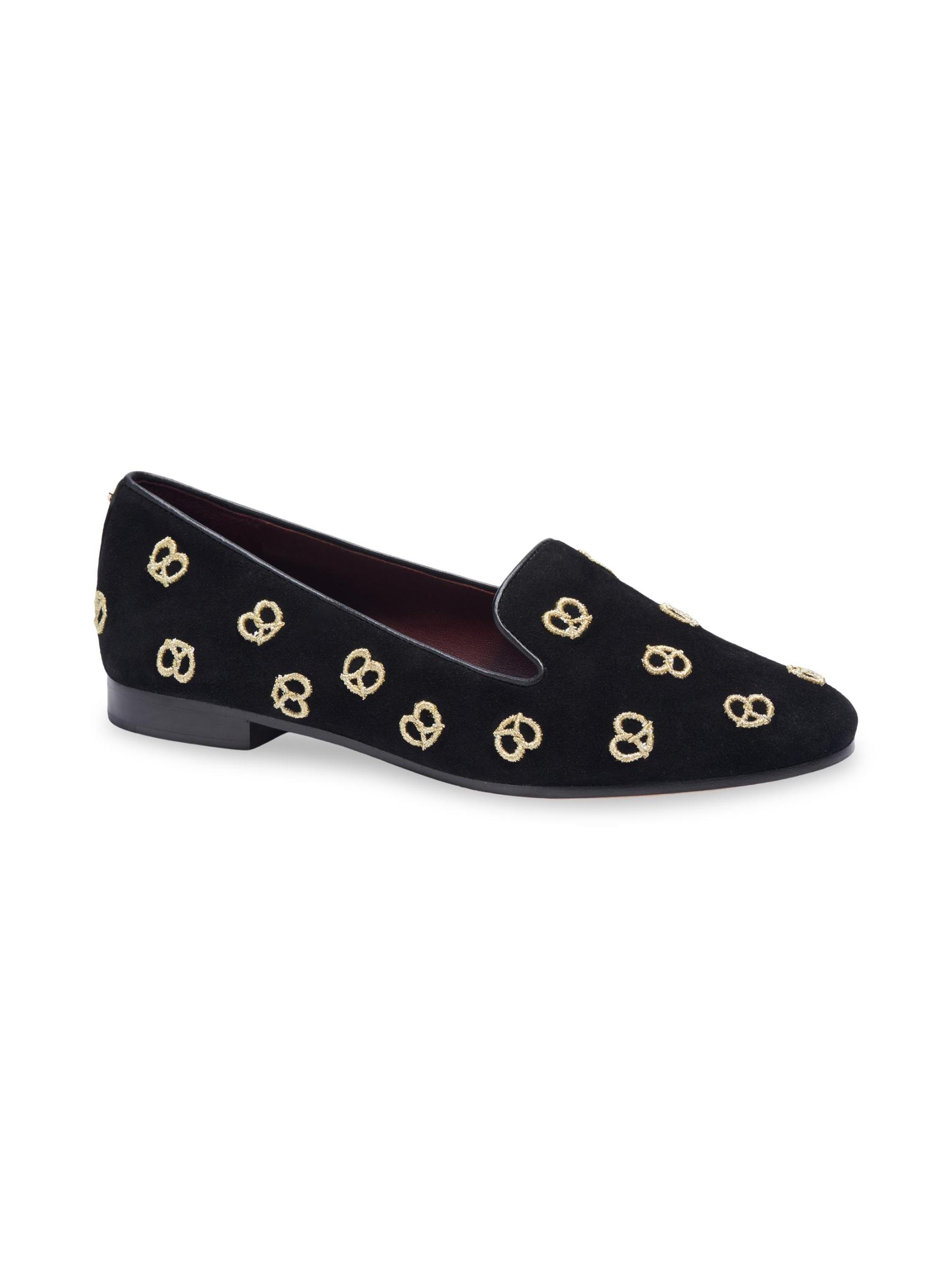 شبشب الاسترخاء الممتع هذا مصنوع من الجلد المدبوغ الناعم ومزين بالبريتزل المطرزة باللون الذهبي اللامع.الجزء العلوي من الجلد المدبوغ أحذية مسطحة بتصميم سهل الارتداء بطانة جلدية نعل جلدي مستوردة