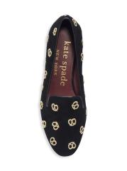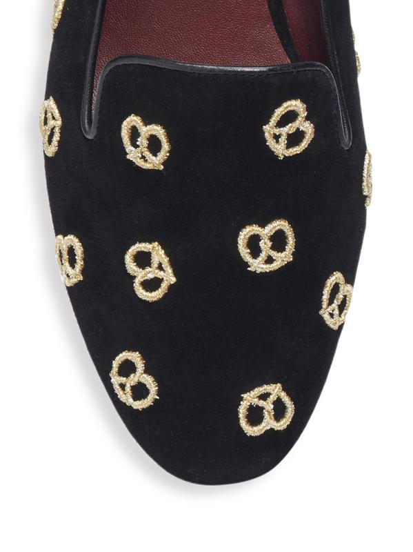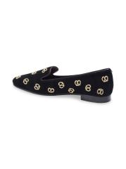 شبشب الاسترخاء الممتع هذا مصنوع من الجلد المدبوغ الناعم ومزين بالبريتزل المطرزة باللون الذهبي اللامع.