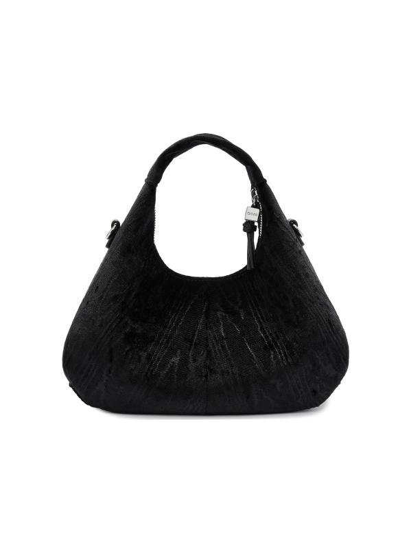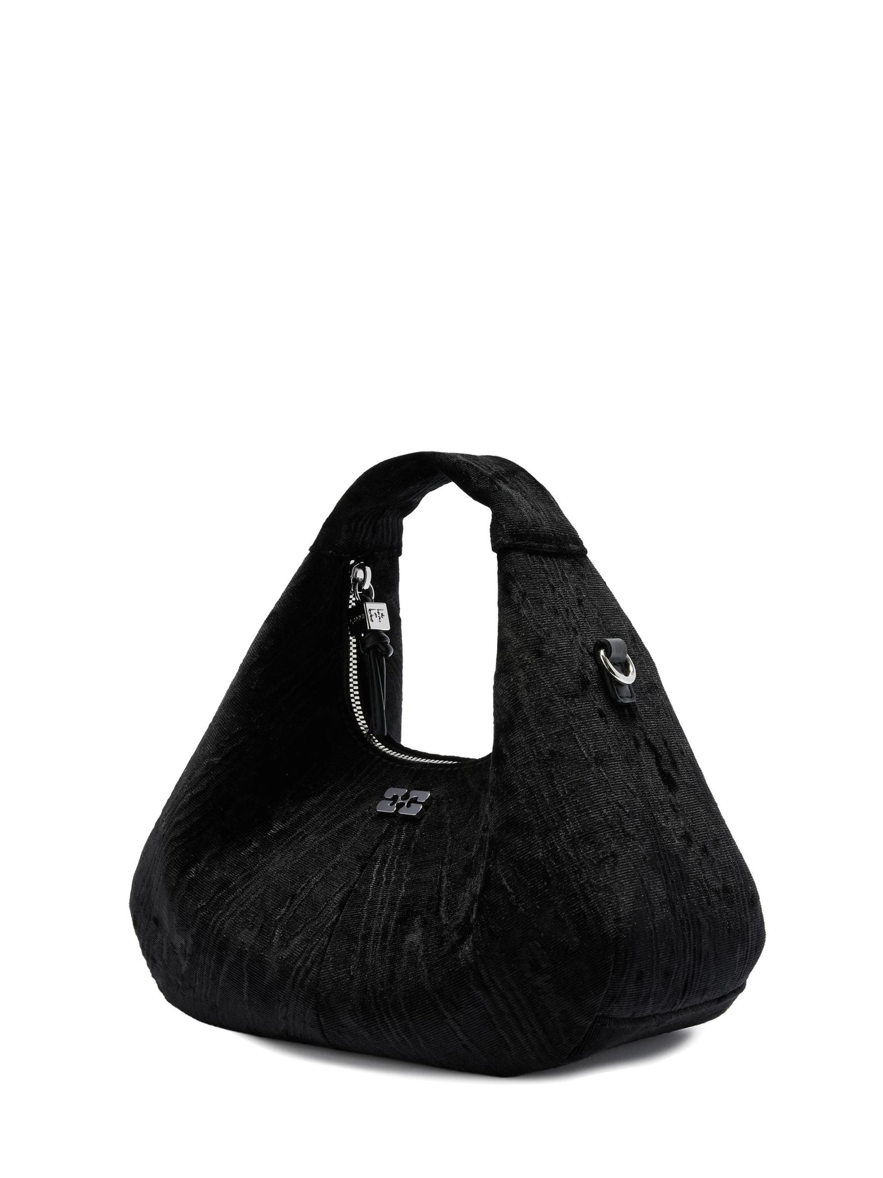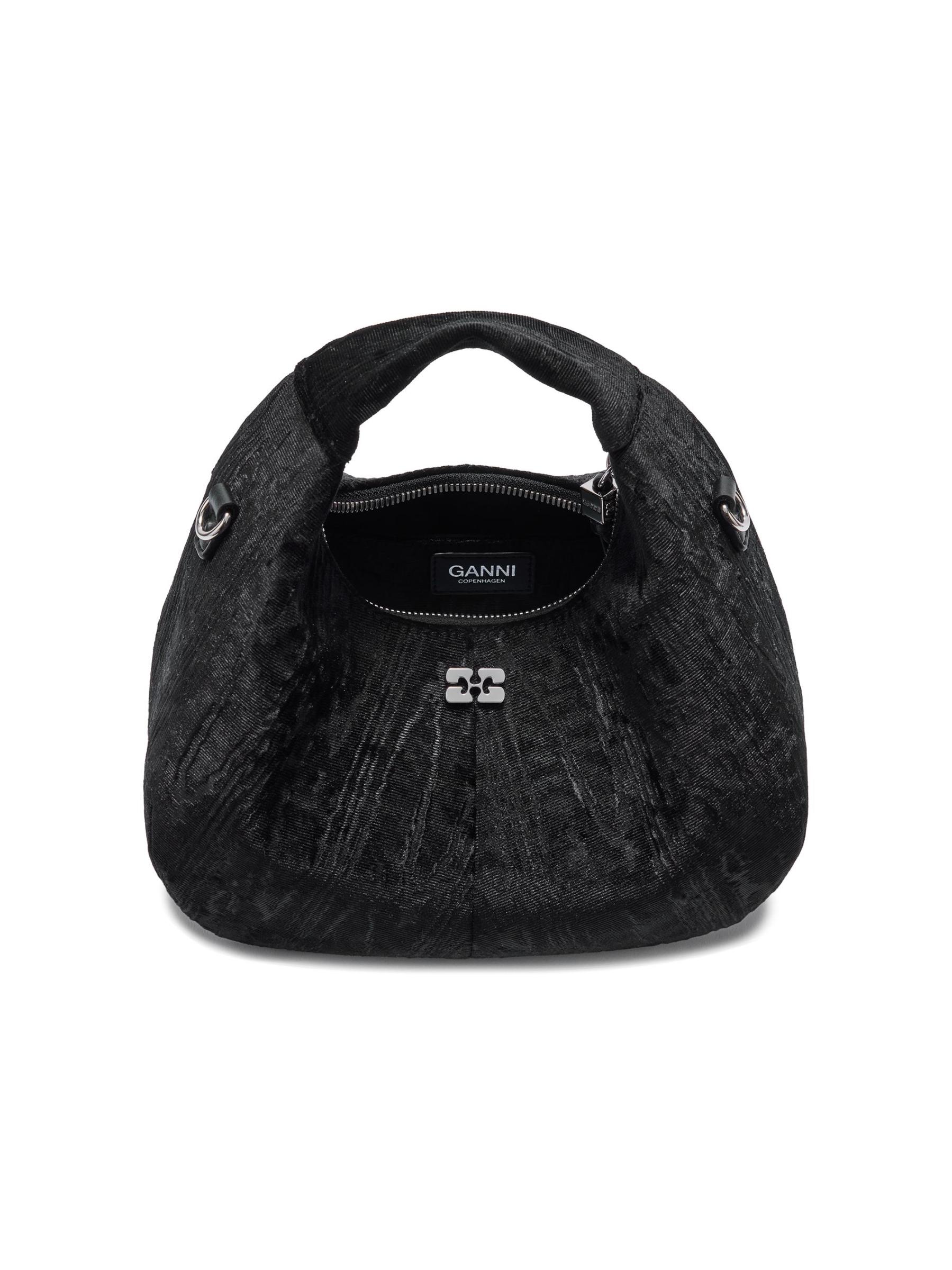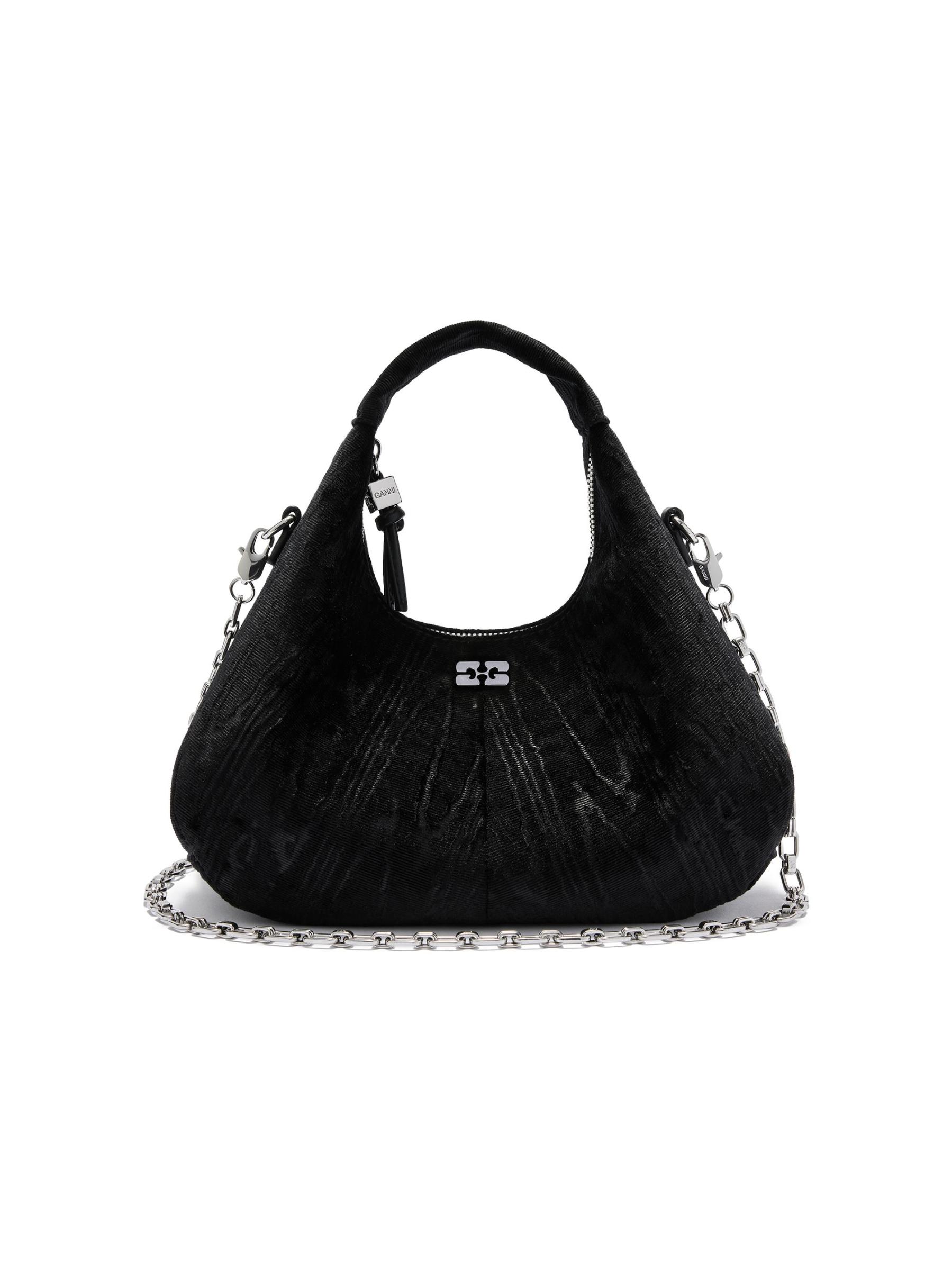 تتميز حقيبة Ganni الصغيرة ذات المقبض العلوي المصنوعة من نسيج مخملي بمقبض علوي وحزام كتف من السلسلة قابل للتعديل والإزالة. يعمل الإغلاق المزود بسحّاب مع سحب النرد المعدني المنقوش على تأمين مساحة داخلية واسعة بفتحة مسطحة للبطاقات، بينما يُظهر الجزء الخارجي شعار الفراشة.