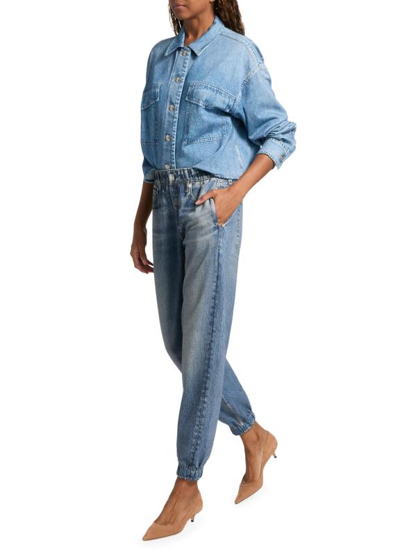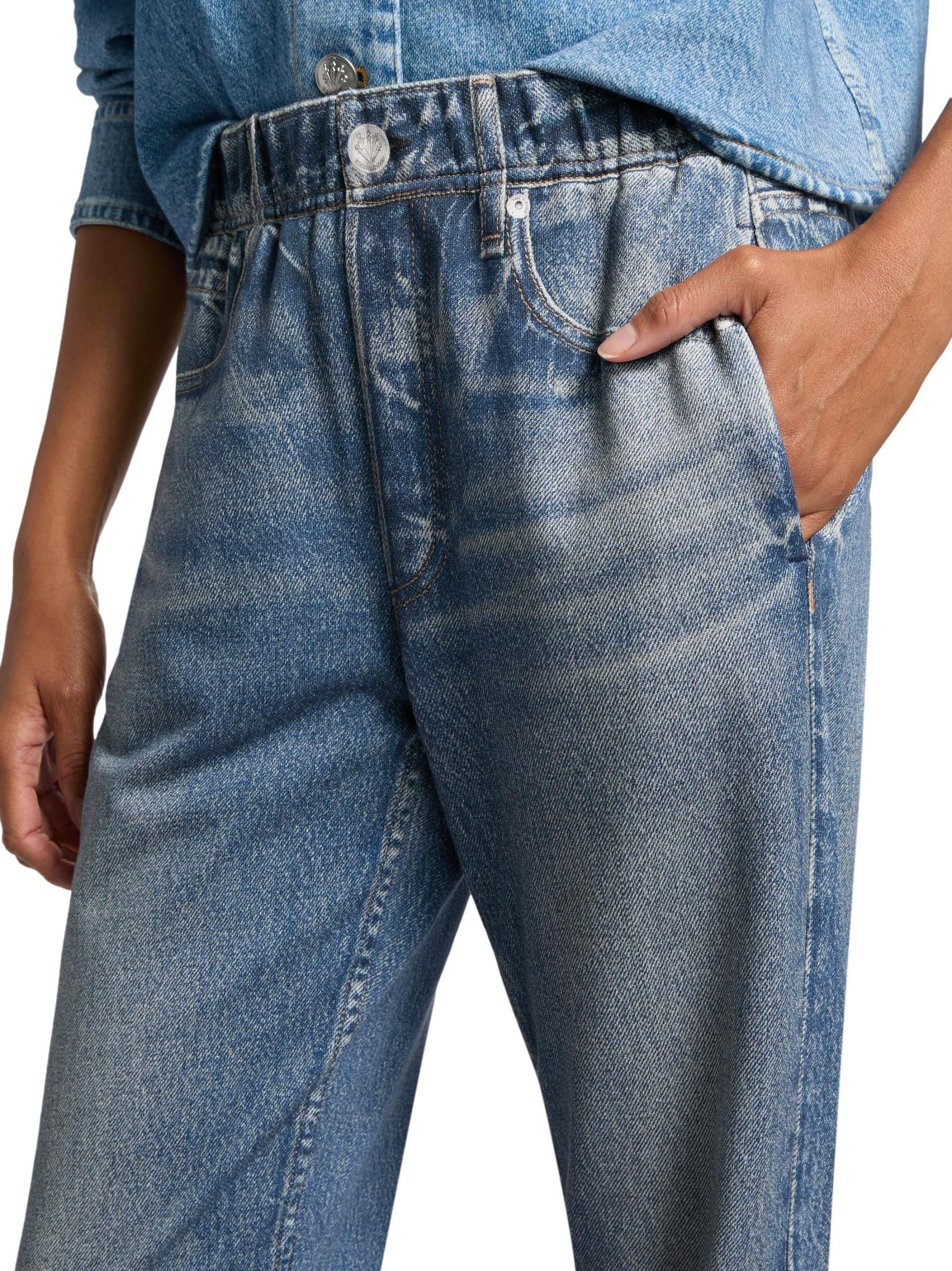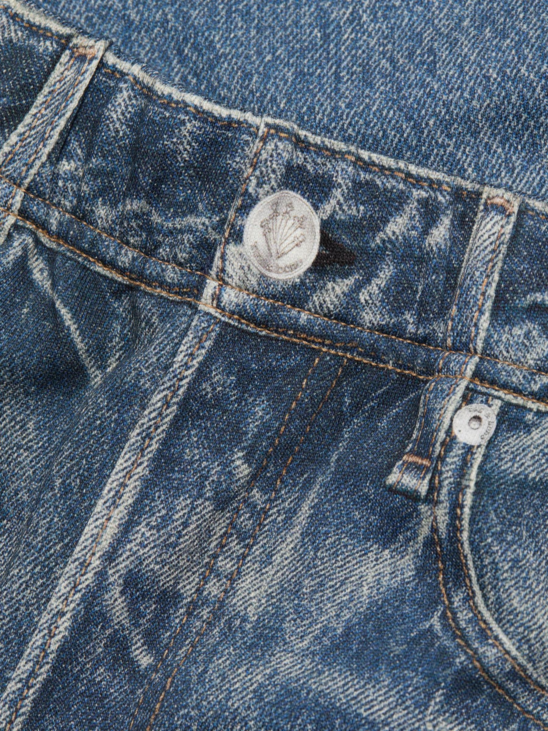 bone لالتقاط كل التفاصيل المعقدة للجينز الكلاسيكي، بدءًا من الجينز المؤلم والمتلاشي إلى الغرز الصغيرة والمسامير. تخلق تقنية الطباعة الثورية هذه خداعًا بصريًا مع الحفاظ على ملمس النسيج الأصلي الناعم ووظيفته. تتميز هذه السراويل الرياضية بحزام خصر مطاطي وأساور، مما يخلق صورة ظلية مدببة.حزام خصر مطاطي أساور مطاطية قطن بنسبة 100% يُغسل في الغسالة مستوردة