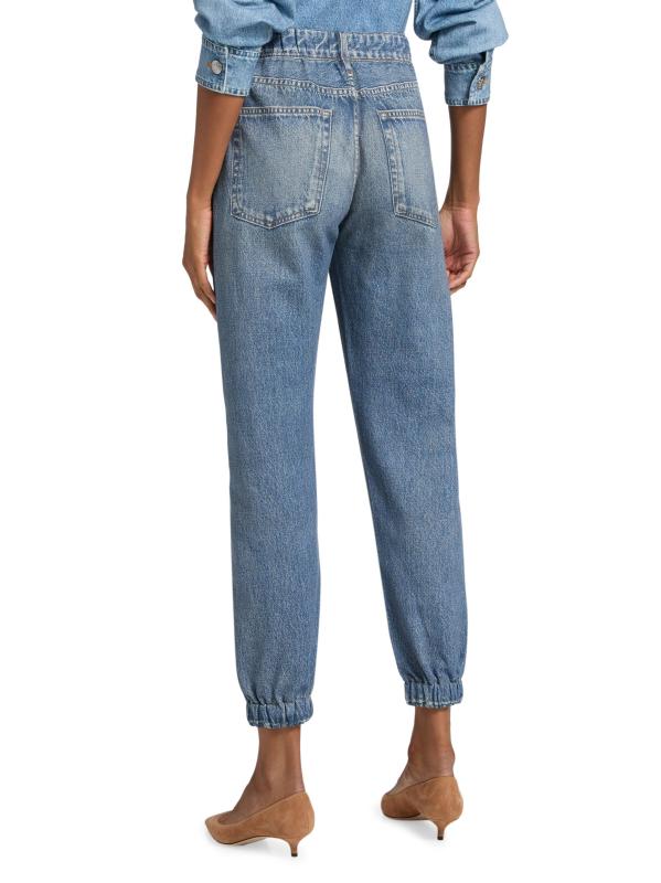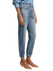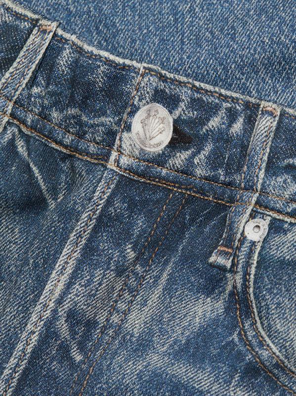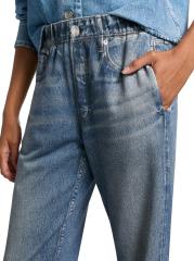 bone لالتقاط كل التفاصيل المعقدة للجينز الكلاسيكي، بدءًا من الجينز المؤلم والمتلاشي إلى الغرز الصغيرة والمسامير. تخلق تقنية الطباعة الثورية هذه خداعًا بصريًا مع الحفاظ على ملمس النسيج الأصلي الناعم ووظيفته. تتميز هذه السراويل الرياضية بحزام خصر مطاطي وأساور، مما يخلق صورة ظلية مدببة.