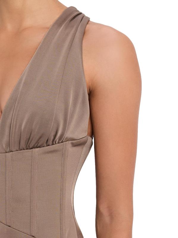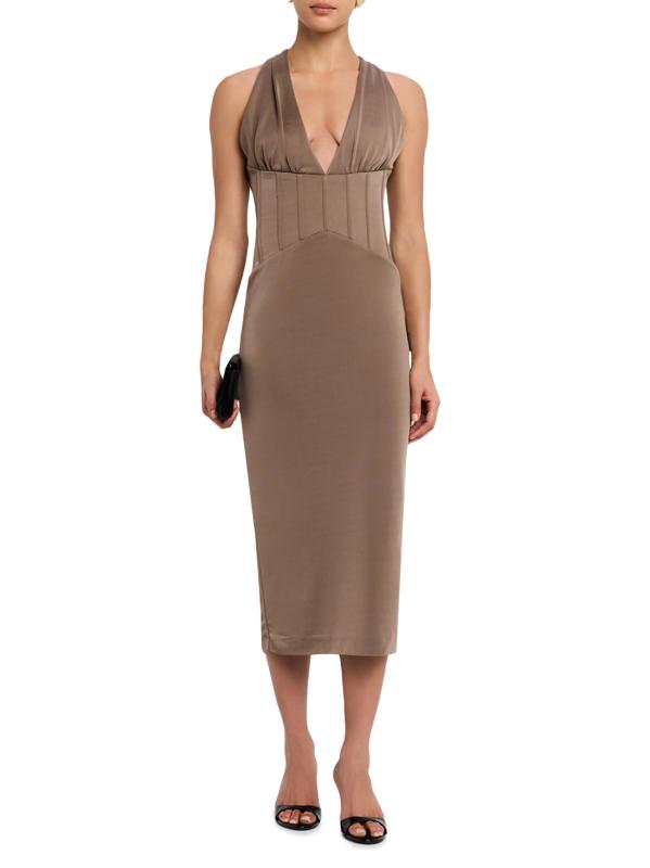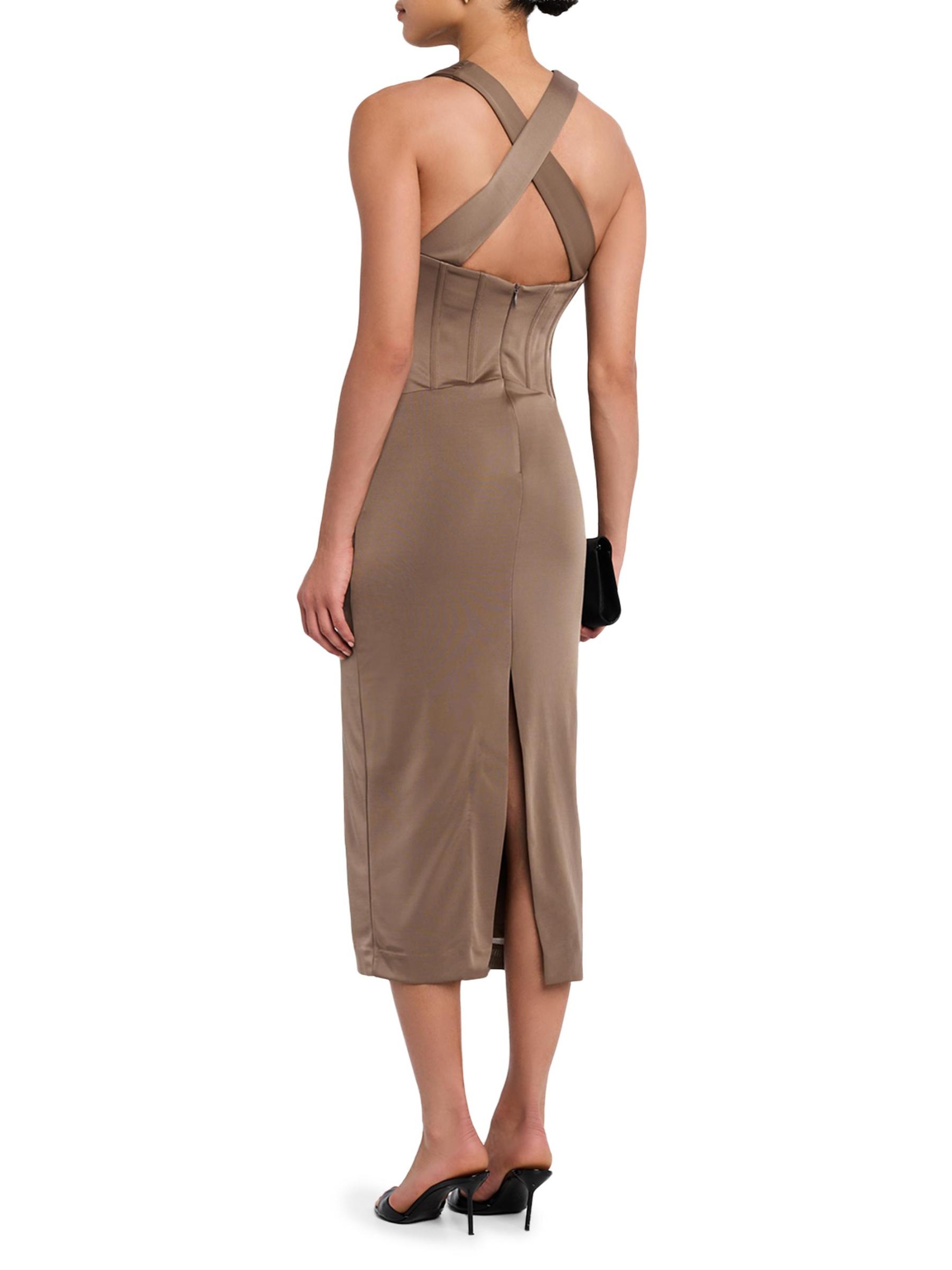 تم تصميم فستان Mischa midi من Rebecca Vallance بحزام خصر بمظهر مشد لمزيد من البنية.