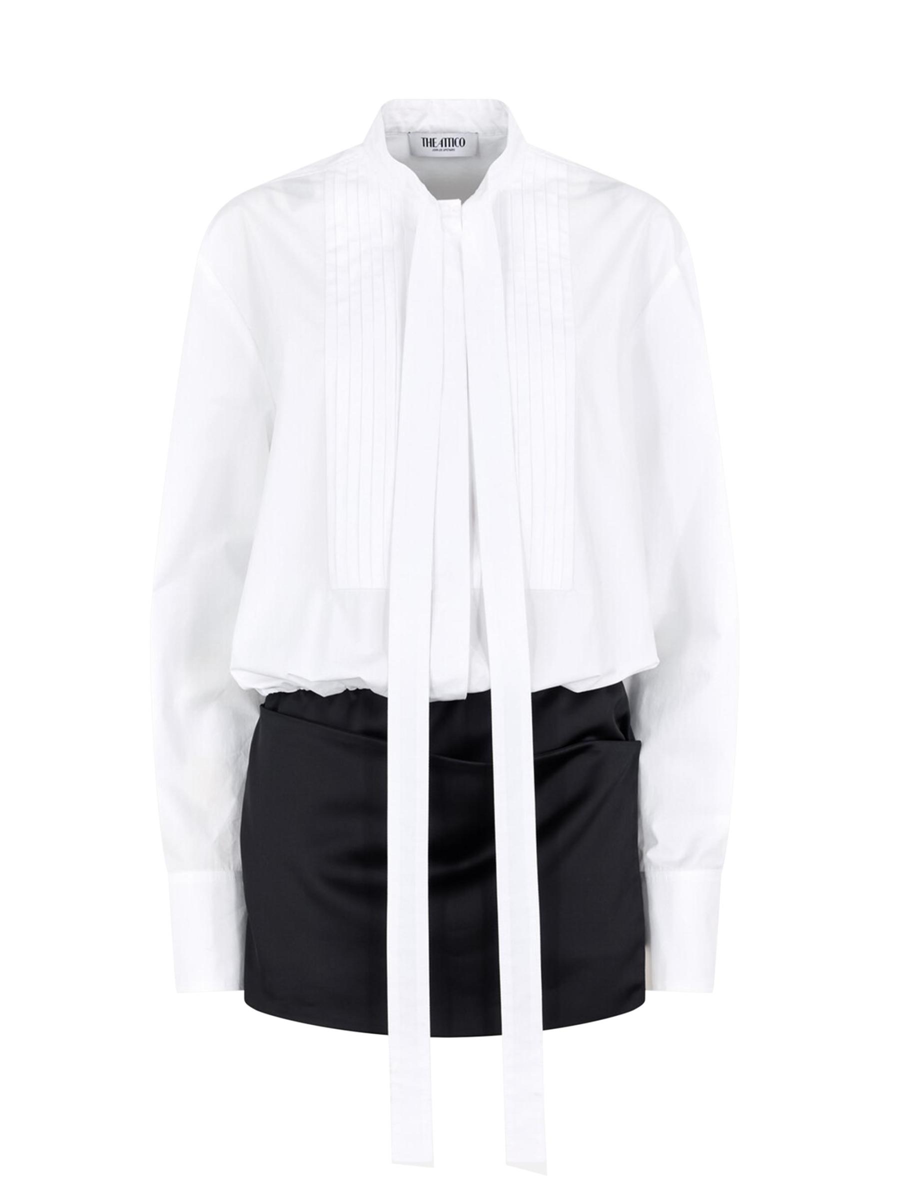 صُمم هذا الفستان القصير من The Attico بتصميم على شكل حرف A من القطن ويتميز بمريلة عمودية مطوية مع تنورة قصيرة مناسبة للشكل.