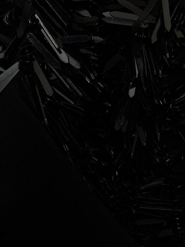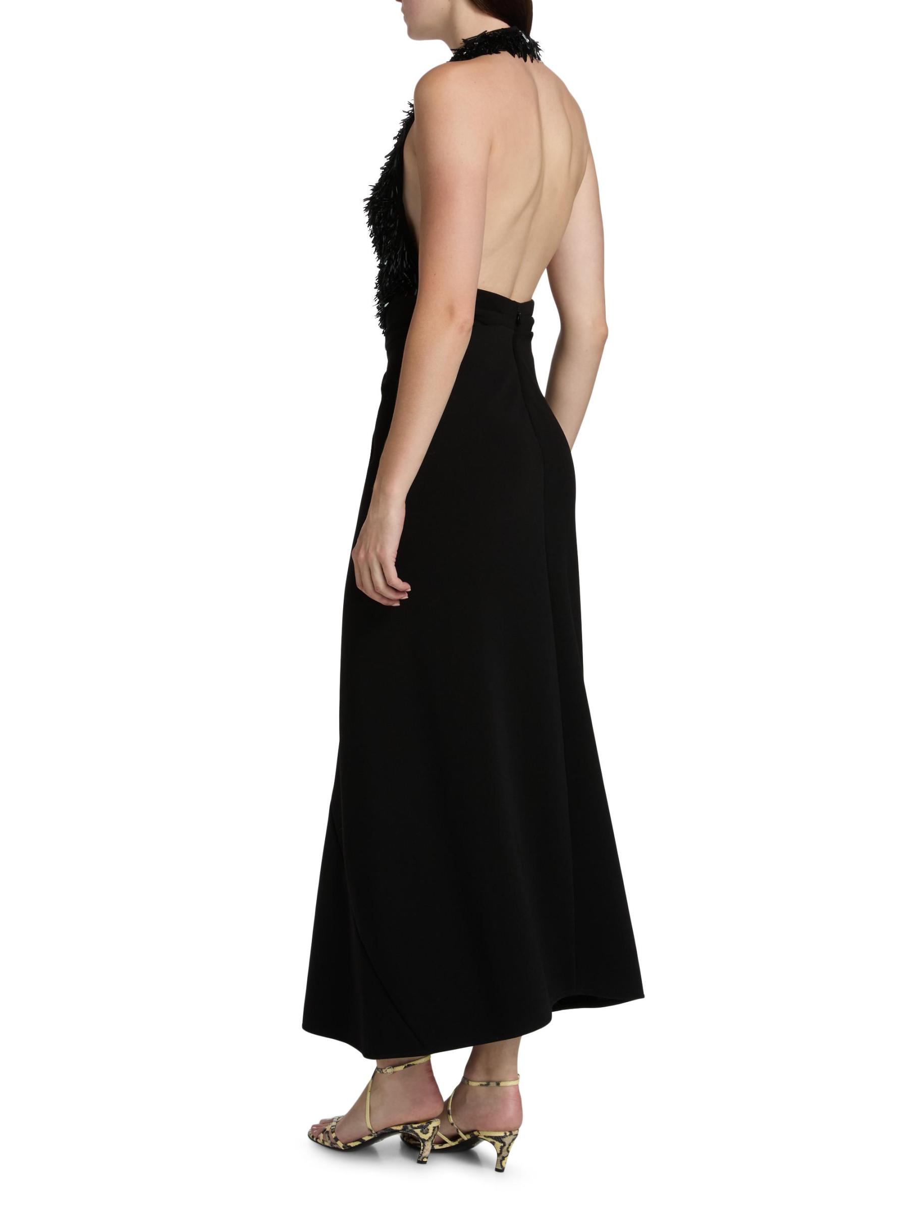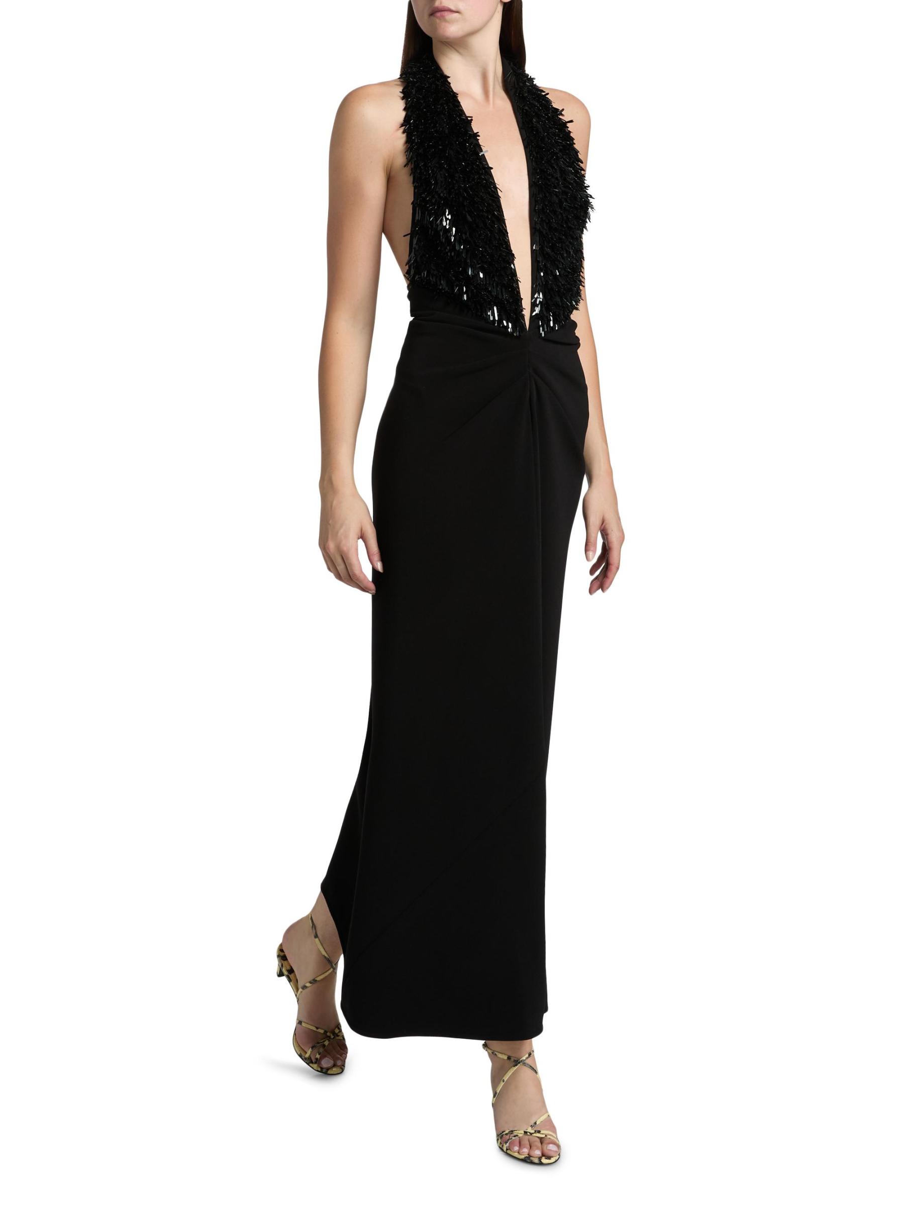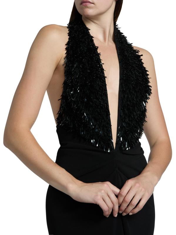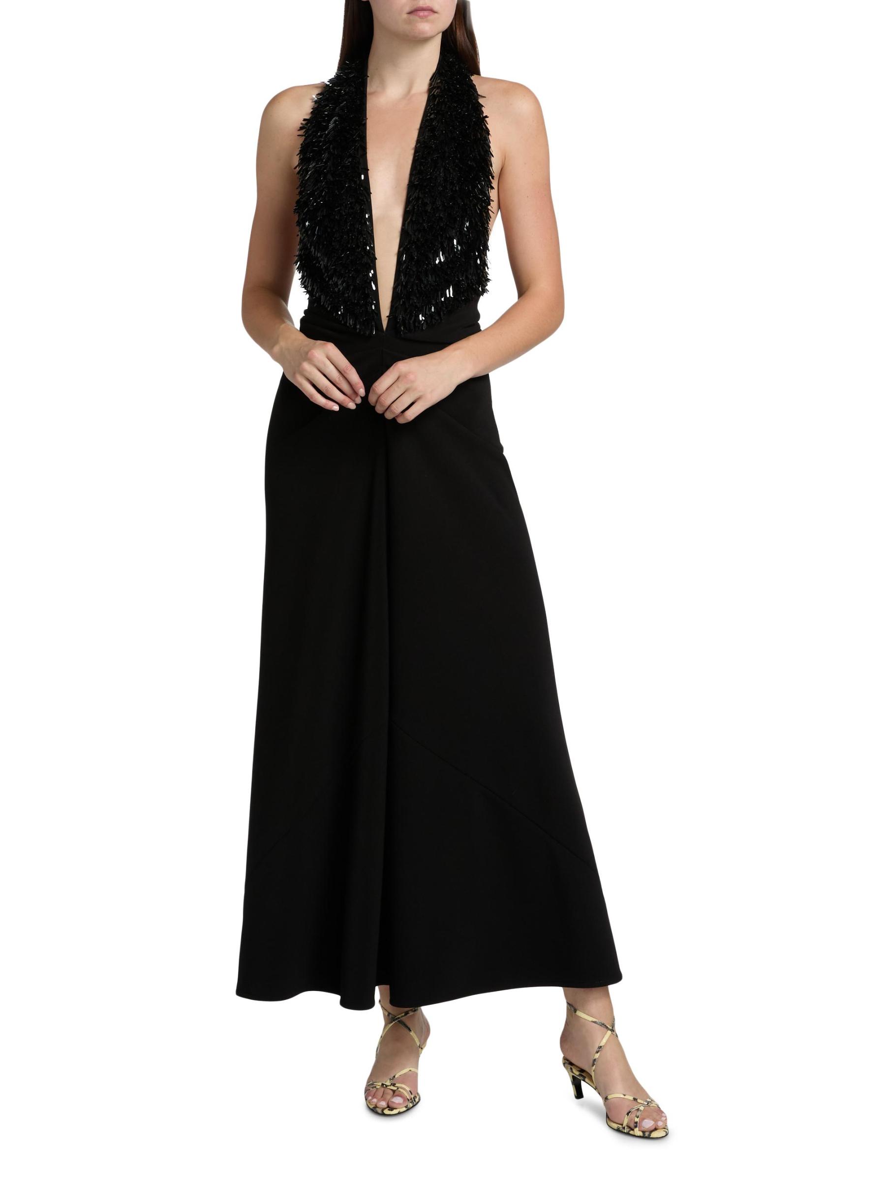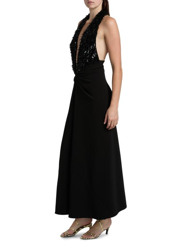 يتميز فستان مويرا ماكسي هذا من Proenza Schouler بتطريز مطرز بالترتر اللوني على الصدّار، وتفاصيل مكشكشة أمامية ملتوية عند الخصر، ويتميز بظهر مفتوح